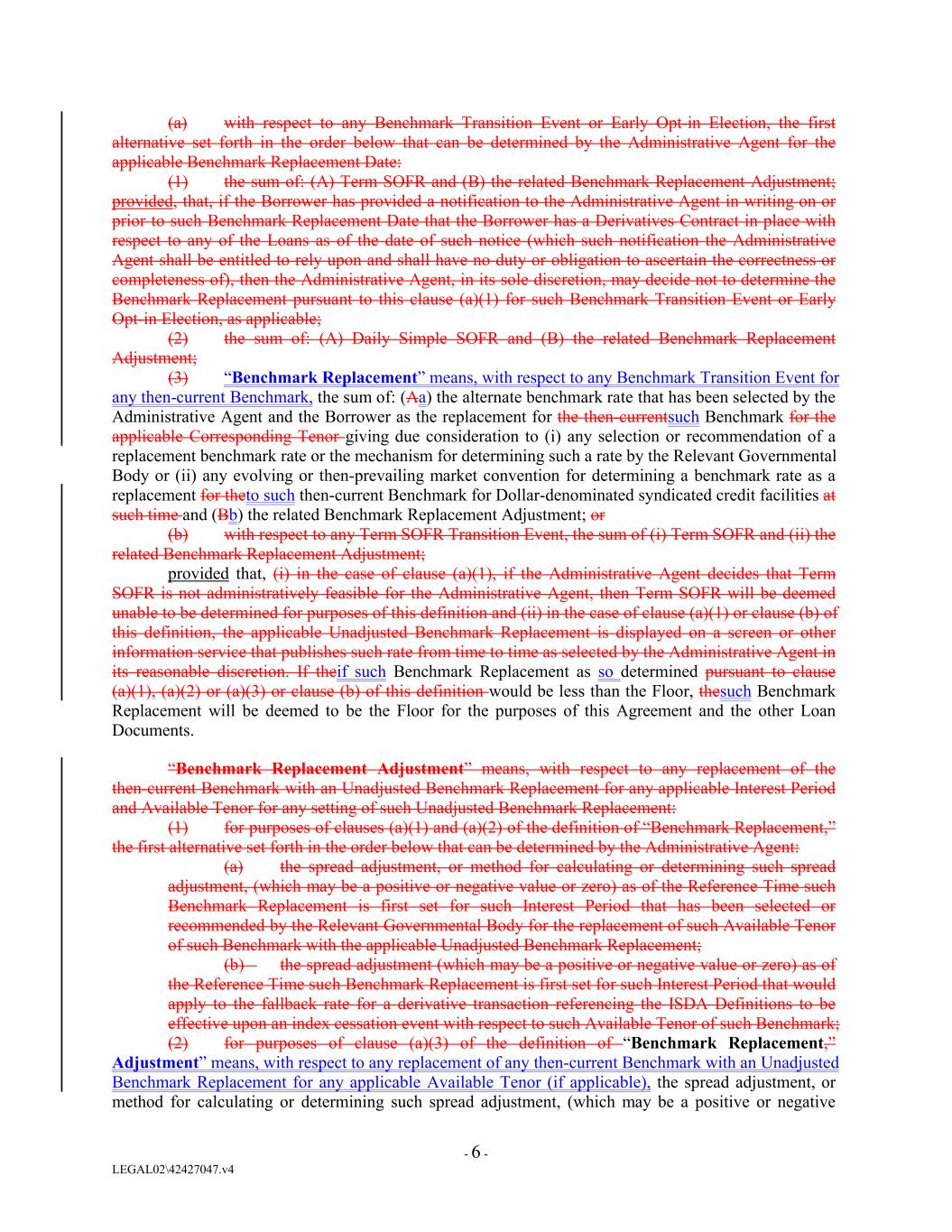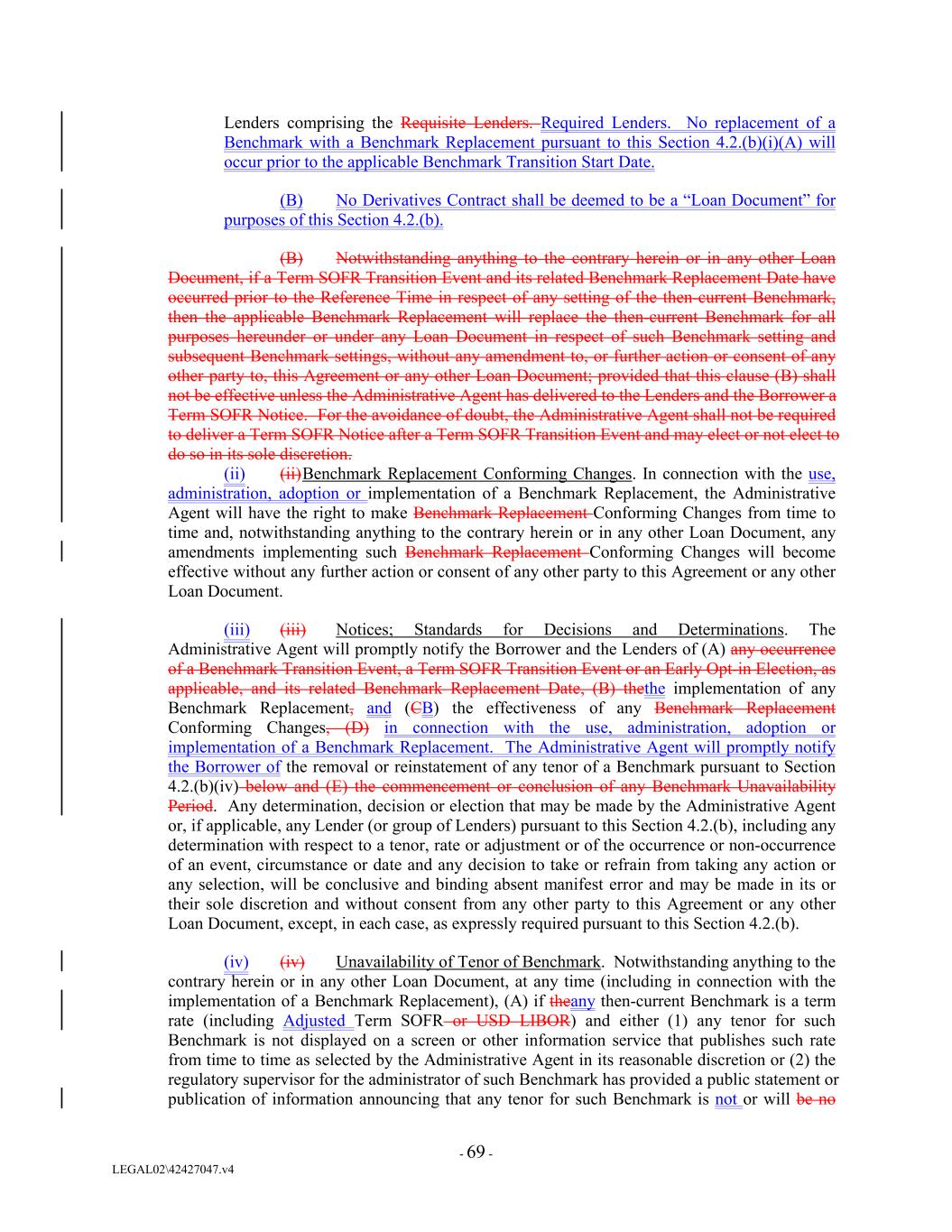 Lenders comprising the Requisite Lenders. Required Lenders. No replacement of a Benchmark with a Benchmark Replacement pursuant to this Section 4.2.(b)(i)(A) will occur prior to the applicable Benchmark Transition Start Date. (B) No Derivatives Contract shall be deemed to be a “Loan Document” for purposes of this Section 4.2.(b). (B) Notwithstanding anything to the contrary herein or in any other Loan Document, if a Term SOFR Transition Event and its related Benchmark Replacement Date have occurred prior to the Reference Time in respect of any setting of the then-current Benchmark, then the applicable Benchmark Replacement will replace the then-current Benchmark for all purposes hereunder or under any Loan Document in respect of such Benchmark setting and subsequent Benchmark settings, without any amendment to, or further action or consent of any other party to, this Agreement or any other Loan Document; provided that this clause (B) shall not be effective unless the Administrative Agent has delivered to the Lenders and the Borrower a Term SOFR Notice. For the avoidance of doubt, the Administrative Agent shall not be required to deliver a Term SOFR Notice after a Term SOFR Transition Event and may elect or not elect to do so in its sole discretion. (ii) (ii)Benchmark Replacement Conforming Changes. In connection with the use, administration, adoption or implementation of a Benchmark Replacement, the Administrative Agent will have the right to make Benchmark Replacement Conforming Changes from time to time and, notwithstanding anything to the contrary herein or in any other Loan Document, any amendments implementing such Benchmark Replacement Conforming Changes will become effective without any further action or consent of any other party to this Agreement or any other Loan Document. (iii) (iii) Notices; Standards for Decisions and Determinations. The Administrative Agent will promptly notify the Borrower and the Lenders of (A) any occurrence of a Benchmark Transition Event, a Term SOFR Transition Event or an Early Opt-in Election, as applicable, and its related Benchmark Replacement Date, (B) thethe implementation of any Benchmark Replacement, and (CB) the effectiveness of any Benchmark Replacement Conforming Changes, (D) in connection with the use, administration, adoption or implementation of a Benchmark Replacement. The Administrative Agent will promptly notify the Borrower of the removal or reinstatement of any tenor of a Benchmark pursuant to Section 4.2.(b)(iv) below and (E) the commencement or conclusion of any Benchmark Unavailability Period. Any determination, decision or election that may be made by the Administrative Agent or, if applicable, any Lender (or group of Lenders) pursuant to this Section 4.2.(b), including any determination with respect to a tenor, rate or adjustment or of the occurrence or non-occurrence of an event, circumstance or date and any decision to take or refrain from taking any action or any selection, will be conclusive and binding absent manifest error and may be made in its or their sole discretion and without consent from any other party to this Agreement or any other Loan Document, except, in each case, as expressly required pursuant to this Section 4.2.(b). (iv) (iv) Unavailability of Tenor of Benchmark. Notwithstanding anything to the contrary herein or in any other Loan Document, at any time (including in connection with the implementation of a Benchmark Replacement), (A) if theany then-current Benchmark is a term rate (including Adjusted Term SOFR or USD LIBOR) and either (1) any tenor for such Benchmark is not displayed on a screen or other information service that publishes such rate from time to time as selected by the Administrative Agent in its reasonable discretion or (2) the regulatory supervisor for the administrator of such Benchmark has provided a public statement or publication of information announcing that any tenor for such Benchmark is not or will be no - 69 - LEGAL02\42427047.v4
