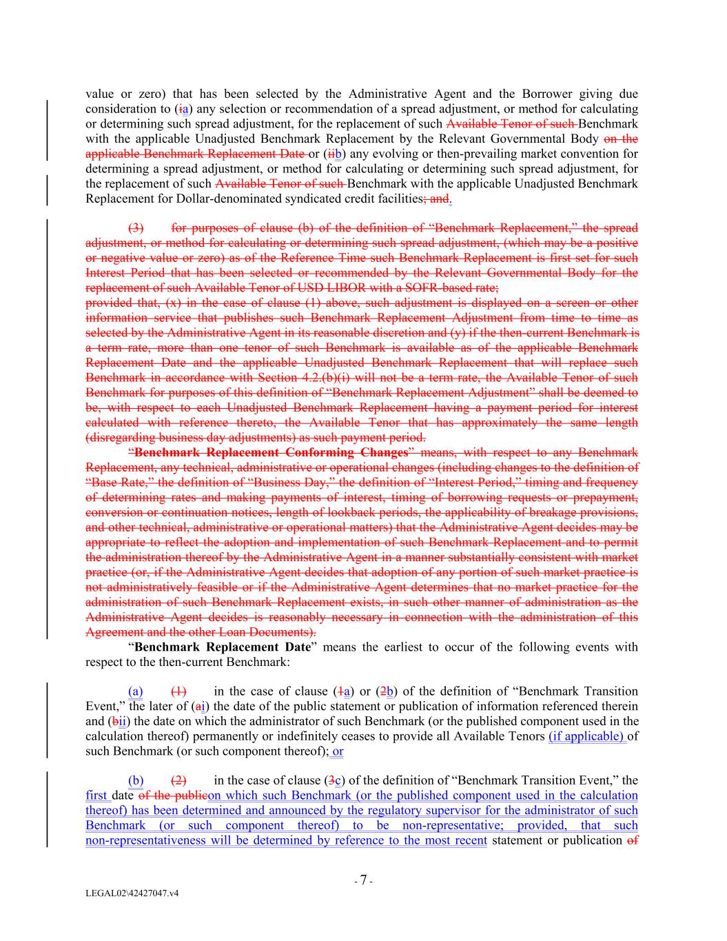 value or zero) that has been selected by the Administrative Agent and the Borrower giving due consideration to (ia) any selection or recommendation of a spread adjustment, or method for calculating or determining such spread adjustment, for the replacement of such Available Tenor of such Benchmark with the applicable Unadjusted Benchmark Replacement by the Relevant Governmental Body on the applicable Benchmark Replacement Date or (iib) any evolving or then-prevailing market convention for determining a spread adjustment, or method for calculating or determining such spread adjustment, for the replacement of such Available Tenor of such Benchmark with the applicable Unadjusted Benchmark Replacement for Dollar-denominated syndicated credit facilities; and. (3) for purposes of clause (b) of the definition of “Benchmark Replacement,” the spread adjustment, or method for calculating or determining such spread adjustment, (which may be a positive or negative value or zero) as of the Reference Time such Benchmark Replacement is first set for such Interest Period that has been selected or recommended by the Relevant Governmental Body for the replacement of such Available Tenor of USD LIBOR with a SOFR-based rate; provided that, (x) in the case of clause (1) above, such adjustment is displayed on a screen or other information service that publishes such Benchmark Replacement Adjustment from time to time as selected by the Administrative Agent in its reasonable discretion and (y) if the then-current Benchmark is a term rate, more than one tenor of such Benchmark is available as of the applicable Benchmark Replacement Date and the applicable Unadjusted Benchmark Replacement that will replace such Benchmark in accordance with Section 4.2.(b)(i) will not be a term rate, the Available Tenor of such Benchmark for purposes of this definition of “Benchmark Replacement Adjustment” shall be deemed to be, with respect to each Unadjusted Benchmark Replacement having a payment period for interest calculated with reference thereto, the Available Tenor that has approximately the same length (disregarding business day adjustments) as such payment period. “Benchmark Replacement Conforming Changes” means, with respect to any Benchmark Replacement, any technical, administrative or operational changes (including changes to the definition of “Base Rate,” the definition of “Business Day,” the definition of “Interest Period,” timing and frequency of determining rates and making payments of interest, timing of borrowing requests or prepayment, conversion or continuation notices, length of lookback periods, the applicability of breakage provisions, and other technical, administrative or operational matters) that the Administrative Agent decides may be appropriate to reflect the adoption and implementation of such Benchmark Replacement and to permit the administration thereof by the Administrative Agent in a manner substantially consistent with market practice (or, if the Administrative Agent decides that adoption of any portion of such market practice is not administratively feasible or if the Administrative Agent determines that no market practice for the administration of such Benchmark Replacement exists, in such other manner of administration as the Administrative Agent decides is reasonably necessary in connection with the administration of this Agreement and the other Loan Documents). “Benchmark Replacement Date” means the earliest to occur of the following events with respect to the then-current Benchmark: (a) (1) in the case of clause (1a) or (2b) of the definition of “Benchmark Transition Event,” the later of (ai) the date of the public statement or publication of information referenced therein and (bii) the date on which the administrator of such Benchmark (or the published component used in the calculation thereof) permanently or indefinitely ceases to provide all Available Tenors (if applicable) of such Benchmark (or such component thereof); or (b) (2) in the case of clause (3c) of the definition of “Benchmark Transition Event,” the first date of the publicon which such Benchmark (or the published component used in the calculation thereof) has been determined and announced by the regulatory supervisor for the administrator of such Benchmark (or such component thereof) to be non-representative; provided, that such non-representativeness will be determined by reference to the most recent statement or publication of - 7 - LEGAL02\42427047.v4