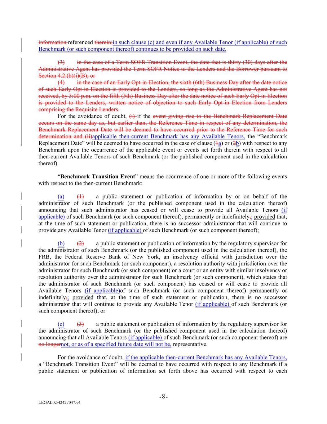 information referenced therein;in such clause (c) and even if any Available Tenor (if applicable) of such Benchmark (or such component thereof) continues to be provided on such date. (3) in the case of a Term SOFR Transition Event, the date that is thirty (30) days after the Administrative Agent has provided the Term SOFR Notice to the Lenders and the Borrower pursuant to Section 4.2.(b)(i)(B); or (4) in the case of an Early Opt-in Election, the sixth (6th) Business Day after the date notice of such Early Opt-in Election is provided to the Lenders, so long as the Administrative Agent has not received, by 5:00 p.m. on the fifth (5th) Business Day after the date notice of such Early Opt-in Election is provided to the Lenders, written notice of objection to such Early Opt-in Election from Lenders comprising the Requisite Lenders. For the avoidance of doubt, (i) if the event giving rise to the Benchmark Replacement Date occurs on the same day as, but earlier than, the Reference Time in respect of any determination, the Benchmark Replacement Date will be deemed to have occurred prior to the Reference Time for such determination and (ii)applicable then-current Benchmark has any Available Tenors, the “Benchmark Replacement Date” will be deemed to have occurred in the case of clause (1a) or (2b) with respect to any Benchmark upon the occurrence of the applicable event or events set forth therein with respect to all then-current Available Tenors of such Benchmark (or the published component used in the calculation thereof). “Benchmark Transition Event” means the occurrence of one or more of the following events with respect to the then-current Benchmark: (a) (1) a public statement or publication of information by or on behalf of the administrator of such Benchmark (or the published component used in the calculation thereof) announcing that such administrator has ceased or will cease to provide all Available Tenors (if applicable) of such Benchmark (or such component thereof), permanently or indefinitely,; provided that, at the time of such statement or publication, there is no successor administrator that will continue to provide any Available Tenor (if applicable) of such Benchmark (or such component thereof); (b) (2) a public statement or publication of information by the regulatory supervisor for the administrator of such Benchmark (or the published component used in the calculation thereof), the FRB, the Federal Reserve Bank of New York, an insolvency official with jurisdiction over the administrator for such Benchmark (or such component), a resolution authority with jurisdiction over the administrator for such Benchmark (or such component) or a court or an entity with similar insolvency or resolution authority over the administrator for such Benchmark (or such component), which states that the administrator of such Benchmark (or such component) has ceased or will cease to provide all Available Tenors (if applicable)of such Benchmark (or such component thereof) permanently or indefinitely,; provided that, at the time of such statement or publication, there is no successor administrator that will continue to provide any Available Tenor (if applicable) of such Benchmark (or such component thereof); or (c) (3) a public statement or publication of information by the regulatory supervisor for the administrator of such Benchmark (or the published component used in the calculation thereof) announcing that all Available Tenors (if applicable) of such Benchmark (or such component thereof) are no longernot, or as of a specified future date will not be, representative. For the avoidance of doubt, if the applicable then-current Benchmark has any Available Tenors, a “Benchmark Transition Event” will be deemed to have occurred with respect to any Benchmark if a public statement or publication of information set forth above has occurred with respect to each - 8 - LEGAL02\42427047.v4