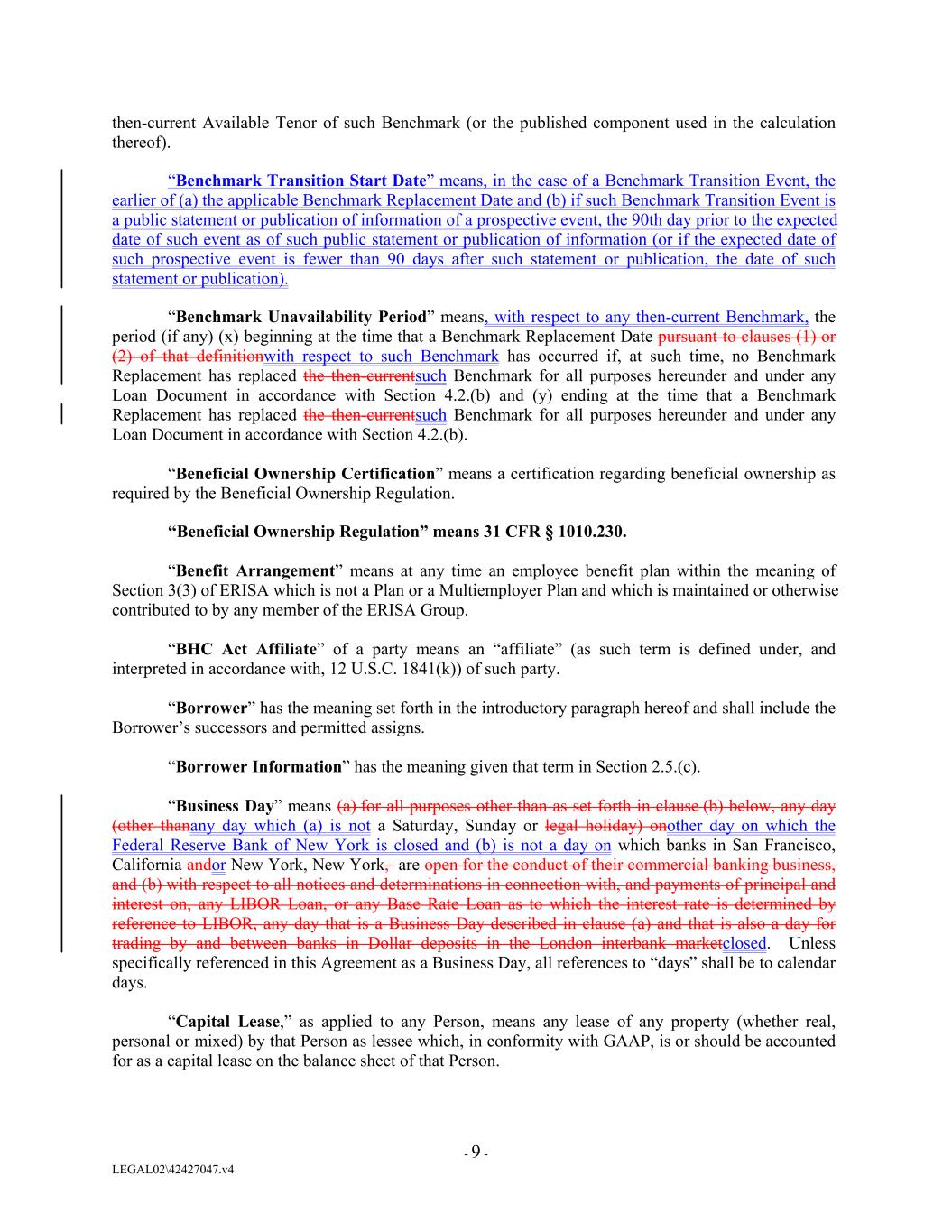 then-current Available Tenor of such Benchmark (or the published component used in the calculation thereof). “Benchmark Transition Start Date” means, in the case of a Benchmark Transition Event, the earlier of (a) the applicable Benchmark Replacement Date and (b) if such Benchmark Transition Event is a public statement or publication of information of a prospective event, the 90th day prior to the expected date of such event as of such public statement or publication of information (or if the expected date of such prospective event is fewer than 90 days after such statement or publication, the date of such statement or publication). “Benchmark Unavailability Period” means, with respect to any then-current Benchmark, the period (if any) (x) beginning at the time that a Benchmark Replacement Date pursuant to clauses (1) or (2) of that definitionwith respect to such Benchmark has occurred if, at such time, no Benchmark Replacement has replaced the then-currentsuch Benchmark for all purposes hereunder and under any Loan Document in accordance with Section 4.2.(b) and (y) ending at the time that a Benchmark Replacement has replaced the then-currentsuch Benchmark for all purposes hereunder and under any Loan Document in accordance with Section 4.2.(b). “Beneficial Ownership Certification” means a certification regarding beneficial ownership as required by the Beneficial Ownership Regulation. “Beneficial Ownership Regulation” means 31 CFR § 1010.230. “Benefit Arrangement” means at any time an employee benefit plan within the meaning of Section 3(3) of ERISA which is not a Plan or a Multiemployer Plan and which is maintained or otherwise contributed to by any member of the ERISA Group. “BHC Act Affiliate” of a party means an “affiliate” (as such term is defined under, and interpreted in accordance with, 12 U.S.C. 1841(k)) of such party. “Borrower” has the meaning set forth in the introductory paragraph hereof and shall include the Borrower’s successors and permitted assigns. “Borrower Information” has the meaning given that term in Section 2.5.(c). “Business Day” means (a) for all purposes other than as set forth in clause (b) below, any day (other thanany day which (a) is not a Saturday, Sunday or legal holiday) onother day on which the Federal Reserve Bank of New York is closed and (b) is not a day on which banks in San Francisco, California andor New York, New York, are open for the conduct of their commercial banking business, and (b) with respect to all notices and determinations in connection with, and payments of principal and interest on, any LIBOR Loan, or any Base Rate Loan as to which the interest rate is determined by reference to LIBOR, any day that is a Business Day described in clause (a) and that is also a day for trading by and between banks in Dollar deposits in the London interbank marketclosed. Unless specifically referenced in this Agreement as a Business Day, all references to “days” shall be to calendar days. “Capital Lease,” as applied to any Person, means any lease of any property (whether real, personal or mixed) by that Person as lessee which, in conformity with GAAP, is or should be accounted for as a capital lease on the balance sheet of that Person. - 9 - LEGAL02\42427047.v4