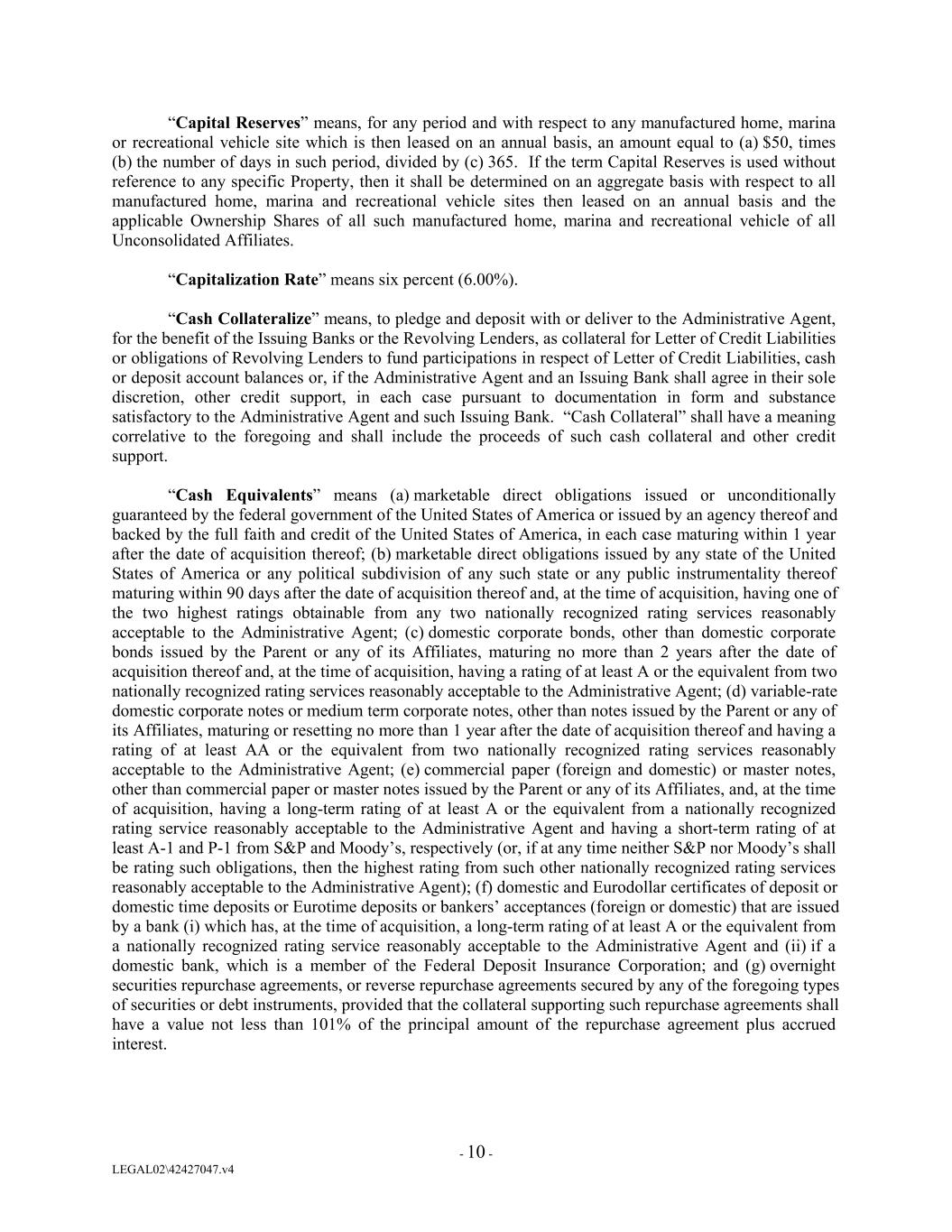 “Capital Reserves” means, for any period and with respect to any manufactured home, marina or recreational vehicle site which is then leased on an annual basis, an amount equal to (a) $50, times (b) the number of days in such period, divided by (c) 365. If the term Capital Reserves is used without reference to any specific Property, then it shall be determined on an aggregate basis with respect to all manufactured home, marina and recreational vehicle sites then leased on an annual basis and the applicable Ownership Shares of all such manufactured home, marina and recreational vehicle of all Unconsolidated Affiliates. “Capitalization Rate” means six percent (6.00%). “Cash Collateralize” means, to pledge and deposit with or deliver to the Administrative Agent, for the benefit of the Issuing Banks or the Revolving Lenders, as collateral for Letter of Credit Liabilities or obligations of Revolving Lenders to fund participations in respect of Letter of Credit Liabilities, cash or deposit account balances or, if the Administrative Agent and an Issuing Bank shall agree in their sole discretion, other credit support, in each case pursuant to documentation in form and substance satisfactory to the Administrative Agent and such Issuing Bank. “Cash Collateral” shall have a meaning correlative to the foregoing and shall include the proceeds of such cash collateral and other credit support. “Cash Equivalents” means (a) marketable direct obligations issued or unconditionally guaranteed by the federal government of the United States of America or issued by an agency thereof and backed by the full faith and credit of the United States of America, in each case maturing within 1 year after the date of acquisition thereof; (b) marketable direct obligations issued by any state of the United States of America or any political subdivision of any such state or any public instrumentality thereof maturing within 90 days after the date of acquisition thereof and, at the time of acquisition, having one of the two highest ratings obtainable from any two nationally recognized rating services reasonably acceptable to the Administrative Agent; (c) domestic corporate bonds, other than domestic corporate bonds issued by the Parent or any of its Affiliates, maturing no more than 2 years after the date of acquisition thereof and, at the time of acquisition, having a rating of at least A or the equivalent from two nationally recognized rating services reasonably acceptable to the Administrative Agent; (d) variable-rate domestic corporate notes or medium term corporate notes, other than notes issued by the Parent or any of its Affiliates, maturing or resetting no more than 1 year after the date of acquisition thereof and having a rating of at least AA or the equivalent from two nationally recognized rating services reasonably acceptable to the Administrative Agent; (e) commercial paper (foreign and domestic) or master notes, other than commercial paper or master notes issued by the Parent or any of its Affiliates, and, at the time of acquisition, having a long-term rating of at least A or the equivalent from a nationally recognized rating service reasonably acceptable to the Administrative Agent and having a short-term rating of at least A-1 and P-1 from S&P and Moody’s, respectively (or, if at any time neither S&P nor Moody’s shall be rating such obligations, then the highest rating from such other nationally recognized rating services reasonably acceptable to the Administrative Agent); (f) domestic and Eurodollar certificates of deposit or domestic time deposits or Eurotime deposits or bankers’ acceptances (foreign or domestic) that are issued by a bank (i) which has, at the time of acquisition, a long-term rating of at least A or the equivalent from a nationally recognized rating service reasonably acceptable to the Administrative Agent and (ii) if a domestic bank, which is a member of the Federal Deposit Insurance Corporation; and (g) overnight securities repurchase agreements, or reverse repurchase agreements secured by any of the foregoing types of securities or debt instruments, provided that the collateral supporting such repurchase agreements shall have a value not less than 101% of the principal amount of the repurchase agreement plus accrued interest. - 10 - LEGAL02\42427047.v4