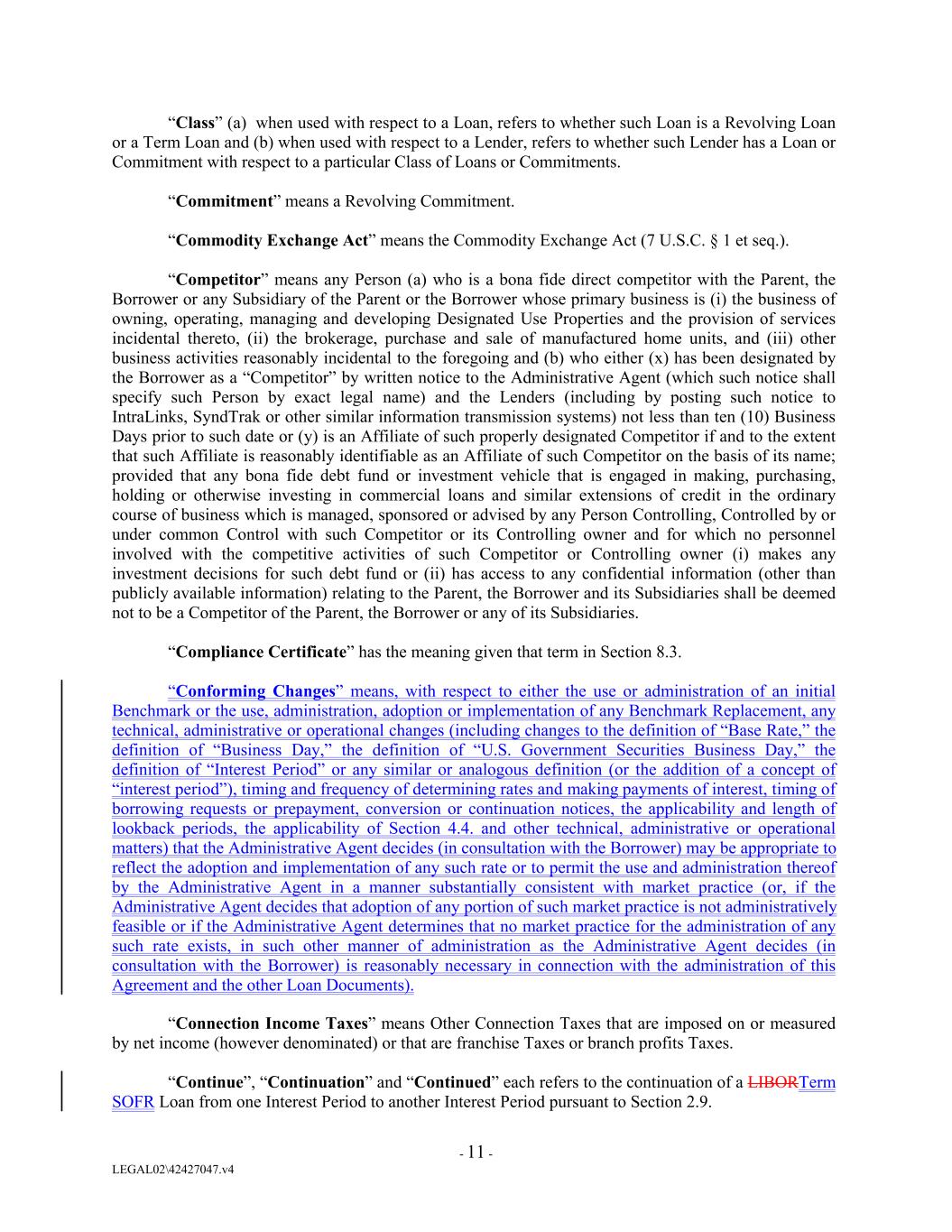 “Class” (a) when used with respect to a Loan, refers to whether such Loan is a Revolving Loan or a Term Loan and (b) when used with respect to a Lender, refers to whether such Lender has a Loan or Commitment with respect to a particular Class of Loans or Commitments. “Commitment” means a Revolving Commitment. “Commodity Exchange Act” means the Commodity Exchange Act (7 U.S.C. § 1 et seq.). “Competitor” means any Person (a) who is a bona fide direct competitor with the Parent, the Borrower or any Subsidiary of the Parent or the Borrower whose primary business is (i) the business of owning, operating, managing and developing Designated Use Properties and the provision of services incidental thereto, (ii) the brokerage, purchase and sale of manufactured home units, and (iii) other business activities reasonably incidental to the foregoing and (b) who either (x) has been designated by the Borrower as a “Competitor” by written notice to the Administrative Agent (which such notice shall specify such Person by exact legal name) and the Lenders (including by posting such notice to IntraLinks, SyndTrak or other similar information transmission systems) not less than ten (10) Business Days prior to such date or (y) is an Affiliate of such properly designated Competitor if and to the extent that such Affiliate is reasonably identifiable as an Affiliate of such Competitor on the basis of its name; provided that any bona fide debt fund or investment vehicle that is engaged in making, purchasing, holding or otherwise investing in commercial loans and similar extensions of credit in the ordinary course of business which is managed, sponsored or advised by any Person Controlling, Controlled by or under common Control with such Competitor or its Controlling owner and for which no personnel involved with the competitive activities of such Competitor or Controlling owner (i) makes any investment decisions for such debt fund or (ii) has access to any confidential information (other than publicly available information) relating to the Parent, the Borrower and its Subsidiaries shall be deemed not to be a Competitor of the Parent, the Borrower or any of its Subsidiaries. “Compliance Certificate” has the meaning given that term in Section 8.3. “Conforming Changes” means, with respect to either the use or administration of an initial Benchmark or the use, administration, adoption or implementation of any Benchmark Replacement, any technical, administrative or operational changes (including changes to the definition of “Base Rate,” the definition of “Business Day,” the definition of “U.S. Government Securities Business Day,” the definition of “Interest Period” or any similar or analogous definition (or the addition of a concept of “interest period”), timing and frequency of determining rates and making payments of interest, timing of borrowing requests or prepayment, conversion or continuation notices, the applicability and length of lookback periods, the applicability of Section 4.4. and other technical, administrative or operational matters) that the Administrative Agent decides (in consultation with the Borrower) may be appropriate to reflect the adoption and implementation of any such rate or to permit the use and administration thereof by the Administrative Agent in a manner substantially consistent with market practice (or, if the Administrative Agent decides that adoption of any portion of such market practice is not administratively feasible or if the Administrative Agent determines that no market practice for the administration of any such rate exists, in such other manner of administration as the Administrative Agent decides (in consultation with the Borrower) is reasonably necessary in connection with the administration of this Agreement and the other Loan Documents). “Connection Income Taxes” means Other Connection Taxes that are imposed on or measured by net income (however denominated) or that are franchise Taxes or branch profits Taxes. “Continue”, “Continuation” and “Continued” each refers to the continuation of a LIBORTerm SOFR Loan from one Interest Period to another Interest Period pursuant to Section 2.9. - 11 - LEGAL02\42427047.v4
