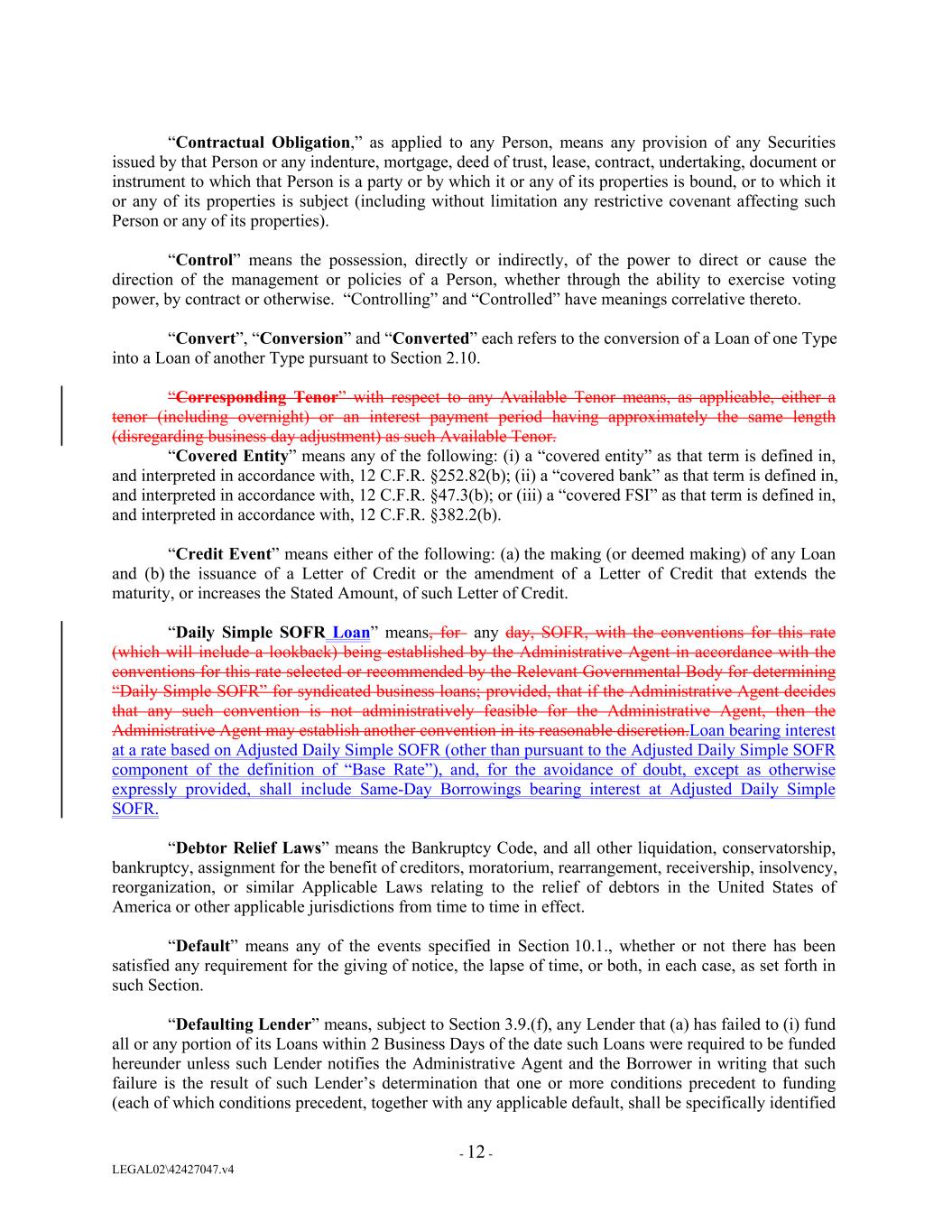 “Contractual Obligation,” as applied to any Person, means any provision of any Securities issued by that Person or any indenture, mortgage, deed of trust, lease, contract, undertaking, document or instrument to which that Person is a party or by which it or any of its properties is bound, or to which it or any of its properties is subject (including without limitation any restrictive covenant affecting such Person or any of its properties). “Control” means the possession, directly or indirectly, of the power to direct or cause the direction of the management or policies of a Person, whether through the ability to exercise voting power, by contract or otherwise. “Controlling” and “Controlled” have meanings correlative thereto. “Convert”, “Conversion” and “Converted” each refers to the conversion of a Loan of one Type into a Loan of another Type pursuant to Section 2.10. “Corresponding Tenor” with respect to any Available Tenor means, as applicable, either a tenor (including overnight) or an interest payment period having approximately the same length (disregarding business day adjustment) as such Available Tenor. “Covered Entity” means any of the following: (i) a “covered entity” as that term is defined in, and interpreted in accordance with, 12 C.F.R. §252.82(b); (ii) a “covered bank” as that term is defined in, and interpreted in accordance with, 12 C.F.R. §47.3(b); or (iii) a “covered FSI” as that term is defined in, and interpreted in accordance with, 12 C.F.R. §382.2(b). “Credit Event” means either of the following: (a) the making (or deemed making) of any Loan and (b) the issuance of a Letter of Credit or the amendment of a Letter of Credit that extends the maturity, or increases the Stated Amount, of such Letter of Credit. “Daily Simple SOFR Loan” means, for any day, SOFR, with the conventions for this rate (which will include a lookback) being established by the Administrative Agent in accordance with the conventions for this rate selected or recommended by the Relevant Governmental Body for determining “Daily Simple SOFR” for syndicated business loans; provided, that if the Administrative Agent decides that any such convention is not administratively feasible for the Administrative Agent, then the Administrative Agent may establish another convention in its reasonable discretion.Loan bearing interest at a rate based on Adjusted Daily Simple SOFR (other than pursuant to the Adjusted Daily Simple SOFR component of the definition of “Base Rate”), and, for the avoidance of doubt, except as otherwise expressly provided, shall include Same-Day Borrowings bearing interest at Adjusted Daily Simple SOFR. “Debtor Relief Laws” means the Bankruptcy Code, and all other liquidation, conservatorship, bankruptcy, assignment for the benefit of creditors, moratorium, rearrangement, receivership, insolvency, reorganization, or similar Applicable Laws relating to the relief of debtors in the United States of America or other applicable jurisdictions from time to time in effect. “Default” means any of the events specified in Section 10.1., whether or not there has been satisfied any requirement for the giving of notice, the lapse of time, or both, in each case, as set forth in such Section. “Defaulting Lender” means, subject to Section 3.9.(f), any Lender that (a) has failed to (i) fund all or any portion of its Loans within 2 Business Days of the date such Loans were required to be funded hereunder unless such Lender notifies the Administrative Agent and the Borrower in writing that such failure is the result of such Lender’s determination that one or more conditions precedent to funding (each of which conditions precedent, together with any applicable default, shall be specifically identified - 12 - LEGAL02\42427047.v4