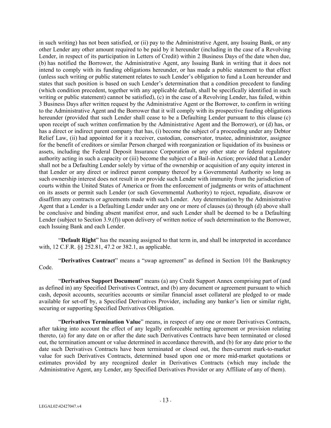 in such writing) has not been satisfied, or (ii) pay to the Administrative Agent, any Issuing Bank, or any other Lender any other amount required to be paid by it hereunder (including in the case of a Revolving Lender, in respect of its participation in Letters of Credit) within 2 Business Days of the date when due, (b) has notified the Borrower, the Administrative Agent, any Issuing Bank in writing that it does not intend to comply with its funding obligations hereunder, or has made a public statement to that effect (unless such writing or public statement relates to such Lender’s obligation to fund a Loan hereunder and states that such position is based on such Lender’s determination that a condition precedent to funding (which condition precedent, together with any applicable default, shall be specifically identified in such writing or public statement) cannot be satisfied), (c) in the case of a Revolving Lender, has failed, within 3 Business Days after written request by the Administrative Agent or the Borrower, to confirm in writing to the Administrative Agent and the Borrower that it will comply with its prospective funding obligations hereunder (provided that such Lender shall cease to be a Defaulting Lender pursuant to this clause (c) upon receipt of such written confirmation by the Administrative Agent and the Borrower), or (d) has, or has a direct or indirect parent company that has, (i) become the subject of a proceeding under any Debtor Relief Law, (ii) had appointed for it a receiver, custodian, conservator, trustee, administrator, assignee for the benefit of creditors or similar Person charged with reorganization or liquidation of its business or assets, including the Federal Deposit Insurance Corporation or any other state or federal regulatory authority acting in such a capacity or (iii) become the subject of a Bail-in Action; provided that a Lender shall not be a Defaulting Lender solely by virtue of the ownership or acquisition of any equity interest in that Lender or any direct or indirect parent company thereof by a Governmental Authority so long as such ownership interest does not result in or provide such Lender with immunity from the jurisdiction of courts within the United States of America or from the enforcement of judgments or writs of attachment on its assets or permit such Lender (or such Governmental Authority) to reject, repudiate, disavow or disaffirm any contracts or agreements made with such Lender. Any determination by the Administrative Agent that a Lender is a Defaulting Lender under any one or more of clauses (a) through (d) above shall be conclusive and binding absent manifest error, and such Lender shall be deemed to be a Defaulting Lender (subject to Section 3.9.(f)) upon delivery of written notice of such determination to the Borrower, each Issuing Bank and each Lender. “Default Right” has the meaning assigned to that term in, and shall be interpreted in accordance with, 12 C.F.R. §§ 252.81, 47.2 or 382.1, as applicable. “Derivatives Contract” means a “swap agreement” as defined in Section 101 the Bankruptcy Code. “Derivatives Support Document” means (a) any Credit Support Annex comprising part of (and as defined in) any Specified Derivatives Contract, and (b) any document or agreement pursuant to which cash, deposit accounts, securities accounts or similar financial asset collateral are pledged to or made available for set-off by, a Specified Derivatives Provider, including any banker’s lien or similar right, securing or supporting Specified Derivatives Obligation. “Derivatives Termination Value” means, in respect of any one or more Derivatives Contracts, after taking into account the effect of any legally enforceable netting agreement or provision relating thereto, (a) for any date on or after the date such Derivatives Contracts have been terminated or closed out, the termination amount or value determined in accordance therewith, and (b) for any date prior to the date such Derivatives Contracts have been terminated or closed out, the then-current mark-to-market value for such Derivatives Contracts, determined based upon one or more mid-market quotations or estimates provided by any recognized dealer in Derivatives Contracts (which may include the Administrative Agent, any Lender, any Specified Derivatives Provider or any Affiliate of any of them). - 13 - LEGAL02\42427047.v4