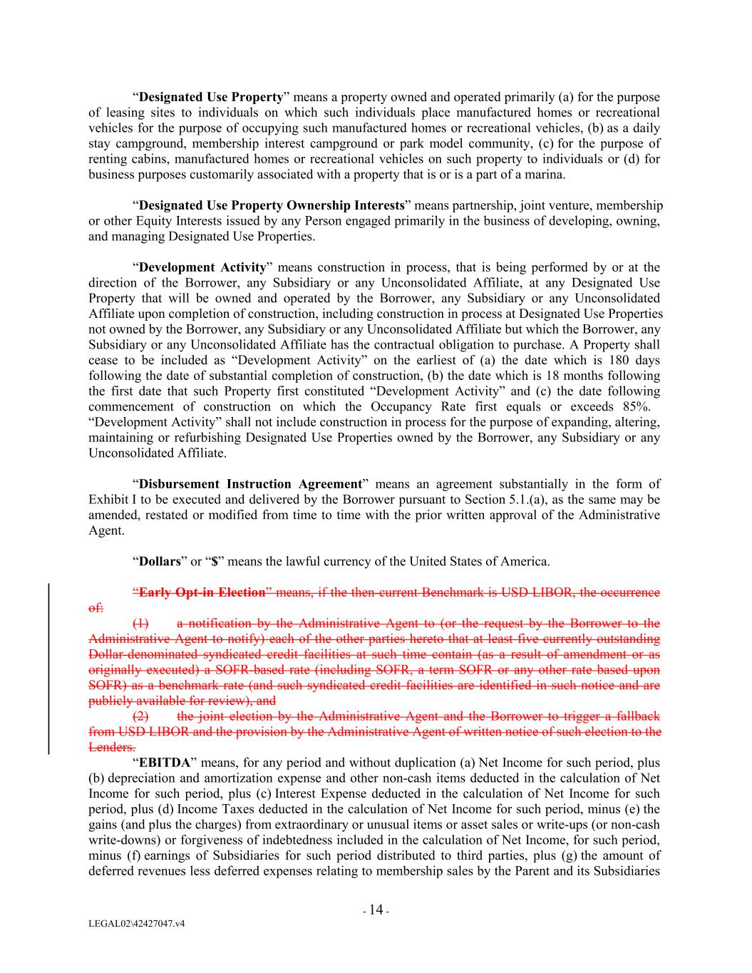 “Designated Use Property” means a property owned and operated primarily (a) for the purpose of leasing sites to individuals on which such individuals place manufactured homes or recreational vehicles for the purpose of occupying such manufactured homes or recreational vehicles, (b) as a daily stay campground, membership interest campground or park model community, (c) for the purpose of renting cabins, manufactured homes or recreational vehicles on such property to individuals or (d) for business purposes customarily associated with a property that is or is a part of a marina. “Designated Use Property Ownership Interests” means partnership, joint venture, membership or other Equity Interests issued by any Person engaged primarily in the business of developing, owning, and managing Designated Use Properties. “Development Activity” means construction in process, that is being performed by or at the direction of the Borrower, any Subsidiary or any Unconsolidated Affiliate, at any Designated Use Property that will be owned and operated by the Borrower, any Subsidiary or any Unconsolidated Affiliate upon completion of construction, including construction in process at Designated Use Properties not owned by the Borrower, any Subsidiary or any Unconsolidated Affiliate but which the Borrower, any Subsidiary or any Unconsolidated Affiliate has the contractual obligation to purchase. A Property shall cease to be included as “Development Activity” on the earliest of (a) the date which is 180 days following the date of substantial completion of construction, (b) the date which is 18 months following the first date that such Property first constituted “Development Activity” and (c) the date following commencement of construction on which the Occupancy Rate first equals or exceeds 85%. “Development Activity” shall not include construction in process for the purpose of expanding, altering, maintaining or refurbishing Designated Use Properties owned by the Borrower, any Subsidiary or any Unconsolidated Affiliate. “Disbursement Instruction Agreement” means an agreement substantially in the form of Exhibit I to be executed and delivered by the Borrower pursuant to Section 5.1.(a), as the same may be amended, restated or modified from time to time with the prior written approval of the Administrative Agent. “Dollars” or “$” means the lawful currency of the United States of America. “Early Opt-in Election” means, if the then-current Benchmark is USD LIBOR, the occurrence of: (1) a notification by the Administrative Agent to (or the request by the Borrower to the Administrative Agent to notify) each of the other parties hereto that at least five currently outstanding Dollar-denominated syndicated credit facilities at such time contain (as a result of amendment or as originally executed) a SOFR-based rate (including SOFR, a term SOFR or any other rate based upon SOFR) as a benchmark rate (and such syndicated credit facilities are identified in such notice and are publicly available for review), and (2) the joint election by the Administrative Agent and the Borrower to trigger a fallback from USD LIBOR and the provision by the Administrative Agent of written notice of such election to the Lenders. “EBITDA” means, for any period and without duplication (a) Net Income for such period, plus (b) depreciation and amortization expense and other non-cash items deducted in the calculation of Net Income for such period, plus (c) Interest Expense deducted in the calculation of Net Income for such period, plus (d) Income Taxes deducted in the calculation of Net Income for such period, minus (e) the gains (and plus the charges) from extraordinary or unusual items or asset sales or write-ups (or non-cash write-downs) or forgiveness of indebtedness included in the calculation of Net Income, for such period, minus (f) earnings of Subsidiaries for such period distributed to third parties, plus (g) the amount of deferred revenues less deferred expenses relating to membership sales by the Parent and its Subsidiaries - 14 - LEGAL02\42427047.v4
