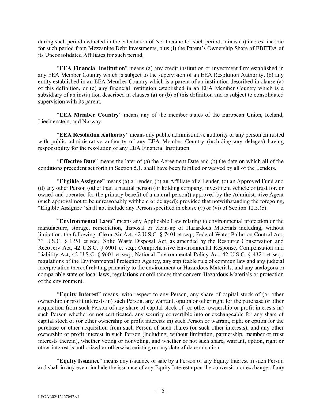 during such period deducted in the calculation of Net Income for such period, minus (h) interest income for such period from Mezzanine Debt Investments, plus (i) the Parent’s Ownership Share of EBITDA of its Unconsolidated Affiliates for such period. “EEA Financial Institution” means (a) any credit institution or investment firm established in any EEA Member Country which is subject to the supervision of an EEA Resolution Authority, (b) any entity established in an EEA Member Country which is a parent of an institution described in clause (a) of this definition, or (c) any financial institution established in an EEA Member Country which is a subsidiary of an institution described in clauses (a) or (b) of this definition and is subject to consolidated supervision with its parent. “EEA Member Country” means any of the member states of the European Union, Iceland, Liechtenstein, and Norway. “EEA Resolution Authority” means any public administrative authority or any person entrusted with public administrative authority of any EEA Member Country (including any delegee) having responsibility for the resolution of any EEA Financial Institution. “Effective Date” means the later of (a) the Agreement Date and (b) the date on which all of the conditions precedent set forth in Section 5.1. shall have been fulfilled or waived by all of the Lenders. “Eligible Assignee” means (a) a Lender, (b) an Affiliate of a Lender, (c) an Approved Fund and (d) any other Person (other than a natural person (or holding company, investment vehicle or trust for, or owned and operated for the primary benefit of a natural person)) approved by the Administrative Agent (such approval not to be unreasonably withheld or delayed); provided that notwithstanding the foregoing, “Eligible Assignee” shall not include any Person specified in clause (v) or (vi) of Section 12.5.(b). “Environmental Laws” means any Applicable Law relating to environmental protection or the manufacture, storage, remediation, disposal or clean-up of Hazardous Materials including, without limitation, the following: Clean Air Act, 42 U.S.C. § 7401 et seq.; Federal Water Pollution Control Act, 33 U.S.C. § 1251 et seq.; Solid Waste Disposal Act, as amended by the Resource Conservation and Recovery Act, 42 U.S.C. § 6901 et seq.; Comprehensive Environmental Response, Compensation and Liability Act, 42 U.S.C. § 9601 et seq.; National Environmental Policy Act, 42 U.S.C. § 4321 et seq.; regulations of the Environmental Protection Agency, any applicable rule of common law and any judicial interpretation thereof relating primarily to the environment or Hazardous Materials, and any analogous or comparable state or local laws, regulations or ordinances that concern Hazardous Materials or protection of the environment. “Equity Interest” means, with respect to any Person, any share of capital stock of (or other ownership or profit interests in) such Person, any warrant, option or other right for the purchase or other acquisition from such Person of any share of capital stock of (or other ownership or profit interests in) such Person whether or not certificated, any security convertible into or exchangeable for any share of capital stock of (or other ownership or profit interests in) such Person or warrant, right or option for the purchase or other acquisition from such Person of such shares (or such other interests), and any other ownership or profit interest in such Person (including, without limitation, partnership, member or trust interests therein), whether voting or nonvoting, and whether or not such share, warrant, option, right or other interest is authorized or otherwise existing on any date of determination. “Equity Issuance” means any issuance or sale by a Person of any Equity Interest in such Person and shall in any event include the issuance of any Equity Interest upon the conversion or exchange of any - 15 - LEGAL02\42427047.v4