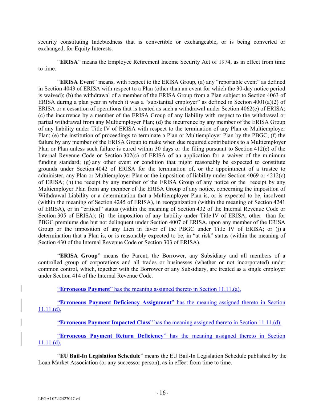 security constituting Indebtedness that is convertible or exchangeable, or is being converted or exchanged, for Equity Interests. “ERISA” means the Employee Retirement Income Security Act of 1974, as in effect from time to time. “ERISA Event” means, with respect to the ERISA Group, (a) any “reportable event” as defined in Section 4043 of ERISA with respect to a Plan (other than an event for which the 30-day notice period is waived); (b) the withdrawal of a member of the ERISA Group from a Plan subject to Section 4063 of ERISA during a plan year in which it was a “substantial employer” as defined in Section 4001(a)(2) of ERISA or a cessation of operations that is treated as such a withdrawal under Section 4062(e) of ERISA; (c) the incurrence by a member of the ERISA Group of any liability with respect to the withdrawal or partial withdrawal from any Multiemployer Plan; (d) the incurrence by any member of the ERISA Group of any liability under Title IV of ERISA with respect to the termination of any Plan or Multiemployer Plan; (e) the institution of proceedings to terminate a Plan or Multiemployer Plan by the PBGC; (f) the failure by any member of the ERISA Group to make when due required contributions to a Multiemployer Plan or Plan unless such failure is cured within 30 days or the filing pursuant to Section 412(c) of the Internal Revenue Code or Section 302(c) of ERISA of an application for a waiver of the minimum funding standard; (g) any other event or condition that might reasonably be expected to constitute grounds under Section 4042 of ERISA for the termination of, or the appointment of a trustee to administer, any Plan or Multiemployer Plan or the imposition of liability under Section 4069 or 4212(c) of ERISA; (h) the receipt by any member of the ERISA Group of any notice or the receipt by any Multiemployer Plan from any member of the ERISA Group of any notice, concerning the imposition of Withdrawal Liability or a determination that a Multiemployer Plan is, or is expected to be, insolvent (within the meaning of Section 4245 of ERISA), in reorganization (within the meaning of Section 4241 of ERISA), or in “critical” status (within the meaning of Section 432 of the Internal Revenue Code or Section 305 of ERISA); (i) the imposition of any liability under Title IV of ERISA, other than for PBGC premiums due but not delinquent under Section 4007 of ERISA, upon any member of the ERISA Group or the imposition of any Lien in favor of the PBGC under Title IV of ERISA; or (j) a determination that a Plan is, or is reasonably expected to be, in “at risk” status (within the meaning of Section 430 of the Internal Revenue Code or Section 303 of ERISA). “ERISA Group” means the Parent, the Borrower, any Subsidiary and all members of a controlled group of corporations and all trades or businesses (whether or not incorporated) under common control, which, together with the Borrower or any Subsidiary, are treated as a single employer under Section 414 of the Internal Revenue Code. “Erroneous Payment” has the meaning assigned thereto in Section 11.11.(a). “Erroneous Payment Deficiency Assignment” has the meaning assigned thereto in Section 11.11.(d). “Erroneous Payment Impacted Class” has the meaning assigned thereto in Section 11.11.(d). “Erroneous Payment Return Deficiency” has the meaning assigned thereto in Section 11.11.(d). “EU Bail-In Legislation Schedule” means the EU Bail-In Legislation Schedule published by the Loan Market Association (or any successor person), as in effect from time to time. - 16 - LEGAL02\42427047.v4