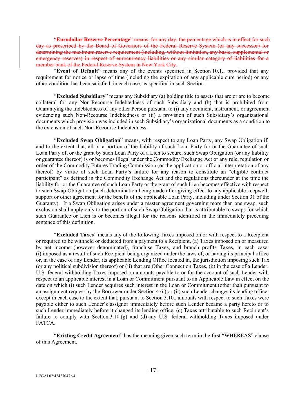 “Eurodollar Reserve Percentage” means, for any day, the percentage which is in effect for such day as prescribed by the Board of Governors of the Federal Reserve System (or any successor) for determining the maximum reserve requirement (including, without limitation, any basic, supplemental or emergency reserves) in respect of eurocurrency liabilities or any similar category of liabilities for a member bank of the Federal Reserve System in New York City. “Event of Default” means any of the events specified in Section 10.1., provided that any requirement for notice or lapse of time (including the expiration of any applicable cure period) or any other condition has been satisfied, in each case, as specified in such Section. “Excluded Subsidiary” means any Subsidiary (a) holding title to assets that are or are to become collateral for any Non-Recourse Indebtedness of such Subsidiary and (b) that is prohibited from Guarantying the Indebtedness of any other Person pursuant to (i) any document, instrument, or agreement evidencing such Non-Recourse Indebtedness or (ii) a provision of such Subsidiary’s organizational documents which provision was included in such Subsidiary’s organizational documents as a condition to the extension of such Non-Recourse Indebtedness. “Excluded Swap Obligation” means, with respect to any Loan Party, any Swap Obligation if, and to the extent that, all or a portion of the liability of such Loan Party for or the Guarantee of such Loan Party of, or the grant by such Loan Party of a Lien to secure, such Swap Obligation (or any liability or guarantee thereof) is or becomes illegal under the Commodity Exchange Act or any rule, regulation or order of the Commodity Futures Trading Commission (or the application or official interpretation of any thereof) by virtue of such Loan Party’s failure for any reason to constitute an “eligible contract participant” as defined in the Commodity Exchange Act and the regulations thereunder at the time the liability for or the Guarantee of such Loan Party or the grant of such Lien becomes effective with respect to such Swap Obligation (such determination being made after giving effect to any applicable keepwell, support or other agreement for the benefit of the applicable Loan Party, including under Section 31 of the Guaranty). If a Swap Obligation arises under a master agreement governing more than one swap, such exclusion shall apply only to the portion of such Swap Obligation that is attributable to swaps for which such Guarantee or Lien is or becomes illegal for the reasons identified in the immediately preceding sentence of this definition. “Excluded Taxes” means any of the following Taxes imposed on or with respect to a Recipient or required to be withheld or deducted from a payment to a Recipient, (a) Taxes imposed on or measured by net income (however denominated), franchise Taxes, and branch profits Taxes, in each case, (i) imposed as a result of such Recipient being organized under the laws of, or having its principal office or, in the case of any Lender, its applicable Lending Office located in, the jurisdiction imposing such Tax (or any political subdivision thereof) or (ii) that are Other Connection Taxes, (b) in the case of a Lender, U.S. federal withholding Taxes imposed on amounts payable to or for the account of such Lender with respect to an applicable interest in a Loan or Commitment pursuant to an Applicable Law in effect on the date on which (i) such Lender acquires such interest in the Loan or Commitment (other than pursuant to an assignment request by the Borrower under Section 4.6.) or (ii) such Lender changes its lending office, except in each case to the extent that, pursuant to Section 3.10., amounts with respect to such Taxes were payable either to such Lender’s assignor immediately before such Lender became a party hereto or to such Lender immediately before it changed its lending office, (c) Taxes attributable to such Recipient’s failure to comply with Section 3.10.(g) and (d) any U.S. federal withholding Taxes imposed under FATCA. “Existing Credit Agreement” has the meaning given such term in the first “WHEREAS” clause of this Agreement. - 17 - LEGAL02\42427047.v4