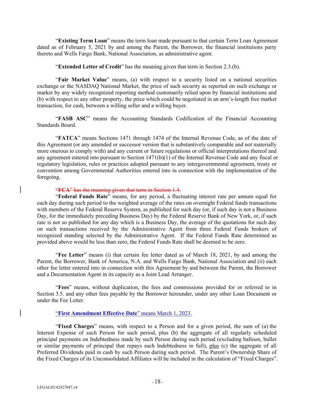 “Existing Term Loan” means the term loan made pursuant to that certain Term Loan Agreement dated as of February 5, 2021 by and among the Parent, the Borrower, the financial institutions party thereto and Wells Fargo Bank, National Association, as administrative agent. “Extended Letter of Credit” has the meaning given that term in Section 2.3.(b). “Fair Market Value” means, (a) with respect to a security listed on a national securities exchange or the NASDAQ National Market, the price of such security as reported on such exchange or market by any widely recognized reporting method customarily relied upon by financial institutions and (b) with respect to any other property, the price which could be negotiated in an arm’s-length free market transaction, for cash, between a willing seller and a willing buyer. “FASB ASC” means the Accounting Standards Codification of the Financial Accounting Standards Board. “FATCA” means Sections 1471 through 1474 of the Internal Revenue Code, as of the date of this Agreement (or any amended or successor version that is substantively comparable and not materially more onerous to comply with) and any current or future regulations or official interpretations thereof and any agreement entered into pursuant to Section 1471(b)(1) of the Internal Revenue Code and any fiscal or regulatory legislation, rules or practices adopted pursuant to any intergovernmental agreement, treaty or convention among Governmental Authorities entered into in connection with the implementation of the foregoing. “FCA” has the meaning given that term in Section 1.4. “Federal Funds Rate” means, for any period, a fluctuating interest rate per annum equal for each day during such period to the weighted average of the rates on overnight Federal funds transactions with members of the Federal Reserve System, as published for such day (or, if such day is not a Business Day, for the immediately preceding Business Day) by the Federal Reserve Bank of New York, or, if such rate is not so published for any day which is a Business Day, the average of the quotations for such day on such transactions received by the Administrative Agent from three Federal Funds brokers of recognized standing selected by the Administrative Agent. If the Federal Funds Rate determined as provided above would be less than zero, the Federal Funds Rate shall be deemed to be zero. “Fee Letter” means (i) that certain fee letter dated as of March 18, 2021, by and among the Parent, the Borrower, Bank of America, N.A. and Wells Fargo Bank, National Association and (ii) each other fee letter entered into in connection with this Agreement by and between the Parent, the Borrower and a Documentation Agent in its capacity as a Joint Lead Arranger. “Fees” means, without duplication, the fees and commissions provided for or referred to in Section 3.5. and any other fees payable by the Borrower hereunder, under any other Loan Document or under the Fee Letter. “First Amendment Effective Date” means March 1, 2023. “Fixed Charges” means, with respect to a Person and for a given period, the sum of (a) the Interest Expense of such Person for such period, plus (b) the aggregate of all regularly scheduled principal payments on Indebtedness made by such Person during such period (excluding balloon, bullet or similar payments of principal that repays such Indebtedness in full), plus (c) the aggregate of all Preferred Dividends paid in cash by such Person during such period. The Parent’s Ownership Share of the Fixed Charges of its Unconsolidated Affiliates will be included in the calculation of “Fixed Charges”. - 18 - LEGAL02\42427047.v4