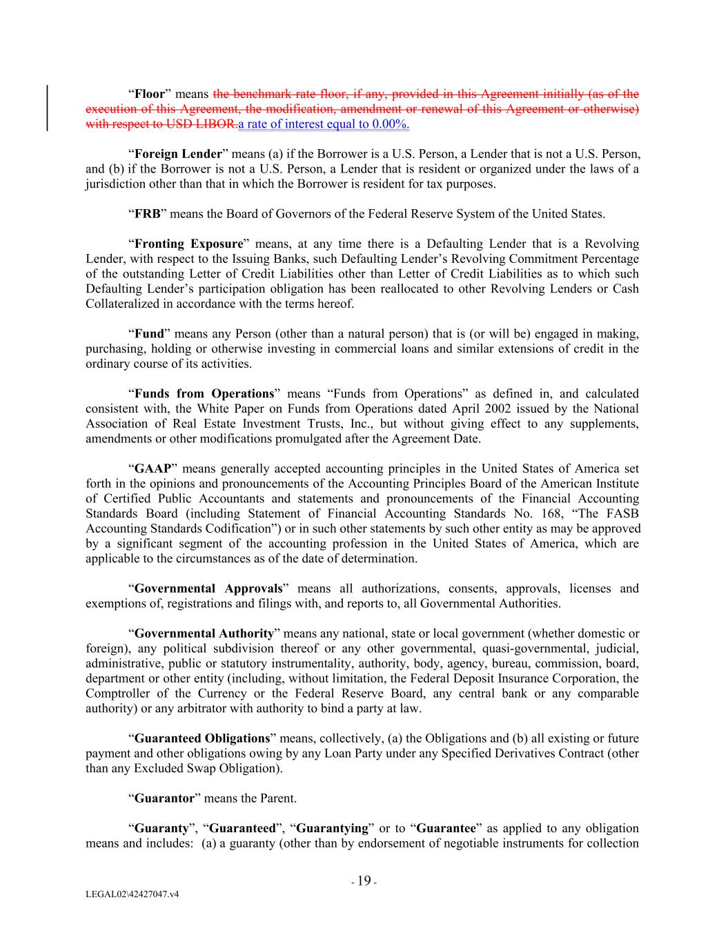 “Floor” means the benchmark rate floor, if any, provided in this Agreement initially (as of the execution of this Agreement, the modification, amendment or renewal of this Agreement or otherwise) with respect to USD LIBOR.a rate of interest equal to 0.00%. “Foreign Lender” means (a) if the Borrower is a U.S. Person, a Lender that is not a U.S. Person, and (b) if the Borrower is not a U.S. Person, a Lender that is resident or organized under the laws of a jurisdiction other than that in which the Borrower is resident for tax purposes. “FRB” means the Board of Governors of the Federal Reserve System of the United States. “Fronting Exposure” means, at any time there is a Defaulting Lender that is a Revolving Lender, with respect to the Issuing Banks, such Defaulting Lender’s Revolving Commitment Percentage of the outstanding Letter of Credit Liabilities other than Letter of Credit Liabilities as to which such Defaulting Lender’s participation obligation has been reallocated to other Revolving Lenders or Cash Collateralized in accordance with the terms hereof. “Fund” means any Person (other than a natural person) that is (or will be) engaged in making, purchasing, holding or otherwise investing in commercial loans and similar extensions of credit in the ordinary course of its activities. “Funds from Operations” means “Funds from Operations” as defined in, and calculated consistent with, the White Paper on Funds from Operations dated April 2002 issued by the National Association of Real Estate Investment Trusts, Inc., but without giving effect to any supplements, amendments or other modifications promulgated after the Agreement Date. “GAAP” means generally accepted accounting principles in the United States of America set forth in the opinions and pronouncements of the Accounting Principles Board of the American Institute of Certified Public Accountants and statements and pronouncements of the Financial Accounting Standards Board (including Statement of Financial Accounting Standards No. 168, “The FASB Accounting Standards Codification”) or in such other statements by such other entity as may be approved by a significant segment of the accounting profession in the United States of America, which are applicable to the circumstances as of the date of determination. “Governmental Approvals” means all authorizations, consents, approvals, licenses and exemptions of, registrations and filings with, and reports to, all Governmental Authorities. “Governmental Authority” means any national, state or local government (whether domestic or foreign), any political subdivision thereof or any other governmental, quasi-governmental, judicial, administrative, public or statutory instrumentality, authority, body, agency, bureau, commission, board, department or other entity (including, without limitation, the Federal Deposit Insurance Corporation, the Comptroller of the Currency or the Federal Reserve Board, any central bank or any comparable authority) or any arbitrator with authority to bind a party at law. “Guaranteed Obligations” means, collectively, (a) the Obligations and (b) all existing or future payment and other obligations owing by any Loan Party under any Specified Derivatives Contract (other than any Excluded Swap Obligation). “Guarantor” means the Parent. “Guaranty”, “Guaranteed”, “Guarantying” or to “Guarantee” as applied to any obligation means and includes: (a) a guaranty (other than by endorsement of negotiable instruments for collection - 19 - LEGAL02\42427047.v4
