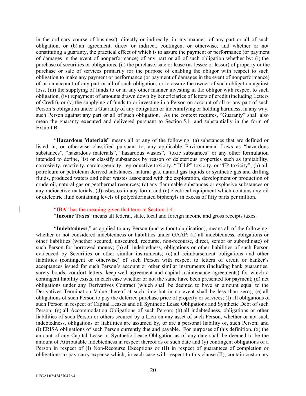 in the ordinary course of business), directly or indirectly, in any manner, of any part or all of such obligation, or (b) an agreement, direct or indirect, contingent or otherwise, and whether or not constituting a guaranty, the practical effect of which is to assure the payment or performance (or payment of damages in the event of nonperformance) of any part or all of such obligation whether by: (i) the purchase of securities or obligations, (ii) the purchase, sale or lease (as lessee or lessor) of property or the purchase or sale of services primarily for the purpose of enabling the obligor with respect to such obligation to make any payment or performance (or payment of damages in the event of nonperformance) of or on account of any part or all of such obligation, or to assure the owner of such obligation against loss, (iii) the supplying of funds to or in any other manner investing in the obligor with respect to such obligation, (iv) repayment of amounts drawn down by beneficiaries of letters of credit (including Letters of Credit), or (v) the supplying of funds to or investing in a Person on account of all or any part of such Person’s obligation under a Guaranty of any obligation or indemnifying or holding harmless, in any way, such Person against any part or all of such obligation. As the context requires, “Guaranty” shall also mean the guaranty executed and delivered pursuant to Section 5.1. and substantially in the form of Exhibit B. “Hazardous Materials” means all or any of the following: (a) substances that are defined or listed in, or otherwise classified pursuant to, any applicable Environmental Laws as “hazardous substances”, “hazardous materials”, “hazardous wastes”, “toxic substances” or any other formulation intended to define, list or classify substances by reason of deleterious properties such as ignitability, corrosivity, reactivity, carcinogenicity, reproductive toxicity, “TCLP” toxicity, or “EP toxicity”; (b) oil, petroleum or petroleum derived substances, natural gas, natural gas liquids or synthetic gas and drilling fluids, produced waters and other wastes associated with the exploration, development or production of crude oil, natural gas or geothermal resources; (c) any flammable substances or explosive substances or any radioactive materials; (d) asbestos in any form; and (e) electrical equipment which contains any oil or dielectric fluid containing levels of polychlorinated biphenyls in excess of fifty parts per million. “IBA” has the meaning given that term in Section 1.4. “Income Taxes” means all federal, state, local and foreign income and gross receipts taxes. “Indebtedness,” as applied to any Person (and without duplication), means all of the following, whether or not considered indebtedness or liabilities under GAAP: (a) all indebtedness, obligations or other liabilities (whether secured, unsecured, recourse, non-recourse, direct, senior or subordinate) of such Person for borrowed money; (b) all indebtedness, obligations or other liabilities of such Person evidenced by Securities or other similar instruments; (c) all reimbursement obligations and other liabilities (contingent or otherwise) of such Person with respect to letters of credit or banker’s acceptances issued for such Person’s account or other similar instruments (including bank guaranties, surety bonds, comfort letters, keep-well agreement and capital maintenance agreements) for which a contingent liability exists, in each case whether or not the same have been presented for payment; (d) net obligations under any Derivatives Contract (which shall be deemed to have an amount equal to the Derivatives Termination Value thereof at such time but in no event shall be less than zero); (e) all obligations of such Person to pay the deferred purchase price of property or services; (f) all obligations of such Person in respect of Capital Leases and all Synthetic Lease Obligations and Synthetic Debt of such Person; (g) all Accommodation Obligations of such Person; (h) all indebtedness, obligations or other liabilities of such Person or others secured by a Lien on any asset of such Person, whether or not such indebtedness, obligations or liabilities are assumed by, or are a personal liability of, such Person; and (i) ERISA obligations of such Person currently due and payable. For purposes of this definition, (x) the amount of any Capital Lease or Synthetic Lease Obligation as of any date shall be deemed to be the amount of Attributable Indebtedness in respect thereof as of such date and (y) contingent obligations of a Person in respect of (I) Non-Recourse Exceptions or (II) in respect of guarantees of completion or obligations to pay carry expense which, in each case with respect to this clause (II), contain customary - 20 - LEGAL02\42427047.v4