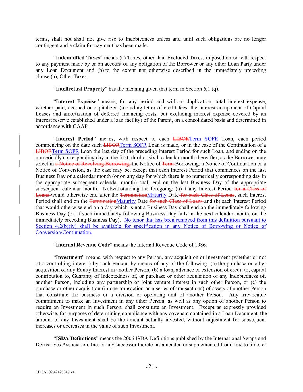 terms, shall not shall not give rise to Indebtedness unless and until such obligations are no longer contingent and a claim for payment has been made. “Indemnified Taxes” means (a) Taxes, other than Excluded Taxes, imposed on or with respect to any payment made by or on account of any obligation of the Borrower or any other Loan Party under any Loan Document and (b) to the extent not otherwise described in the immediately preceding clause (a), Other Taxes. “Intellectual Property” has the meaning given that term in Section 6.1.(q). “Interest Expense” means, for any period and without duplication, total interest expense, whether paid, accrued or capitalized (including letter of credit fees, the interest component of Capital Leases and amortization of deferred financing costs, but excluding interest expense covered by an interest reserve established under a loan facility) of the Parent, on a consolidated basis and determined in accordance with GAAP. “Interest Period” means, with respect to each LIBORTerm SOFR Loan, each period commencing on the date such LIBORTerm SOFR Loan is made, or in the case of the Continuation of a LIBORTerm SOFR Loan the last day of the preceding Interest Period for such Loan, and ending on the numerically corresponding day in the first, third or sixth calendar month thereafter, as the Borrower may select in a Notice of Revolving Borrowing, the Notice of Term Borrowing, a Notice of Continuation or a Notice of Conversion, as the case may be, except that each Interest Period that commences on the last Business Day of a calendar month (or on any day for which there is no numerically corresponding day in the appropriate subsequent calendar month) shall end on the last Business Day of the appropriate subsequent calendar month. Notwithstanding the foregoing: (a) if any Interest Period for a Class of Loans would otherwise end after the TerminationMaturity Date for such Class of Loans, such Interest Period shall end on the TerminationMaturity Date for such Class of Loans and (b) each Interest Period that would otherwise end on a day which is not a Business Day shall end on the immediately following Business Day (or, if such immediately following Business Day falls in the next calendar month, on the immediately preceding Business Day). No tenor that has been removed from this definition pursuant to Section 4.2(b)(iv) shall be available for specification in any Notice of Borrowing or Notice of Conversion/Continuation. “Internal Revenue Code” means the Internal Revenue Code of 1986. “Investment” means, with respect to any Person, any acquisition or investment (whether or not of a controlling interest) by such Person, by means of any of the following: (a) the purchase or other acquisition of any Equity Interest in another Person, (b) a loan, advance or extension of credit to, capital contribution to, Guaranty of Indebtedness of, or purchase or other acquisition of any Indebtedness of, another Person, including any partnership or joint venture interest in such other Person, or (c) the purchase or other acquisition (in one transaction or a series of transactions) of assets of another Person that constitute the business or a division or operating unit of another Person. Any irrevocable commitment to make an Investment in any other Person, as well as any option of another Person to require an Investment in such Person, shall constitute an Investment. Except as expressly provided otherwise, for purposes of determining compliance with any covenant contained in a Loan Document, the amount of any Investment shall be the amount actually invested, without adjustment for subsequent increases or decreases in the value of such Investment. “ISDA Definitions” means the 2006 ISDA Definitions published by the International Swaps and Derivatives Association, Inc. or any successor thereto, as amended or supplemented from time to time, or - 21 - LEGAL02\42427047.v4