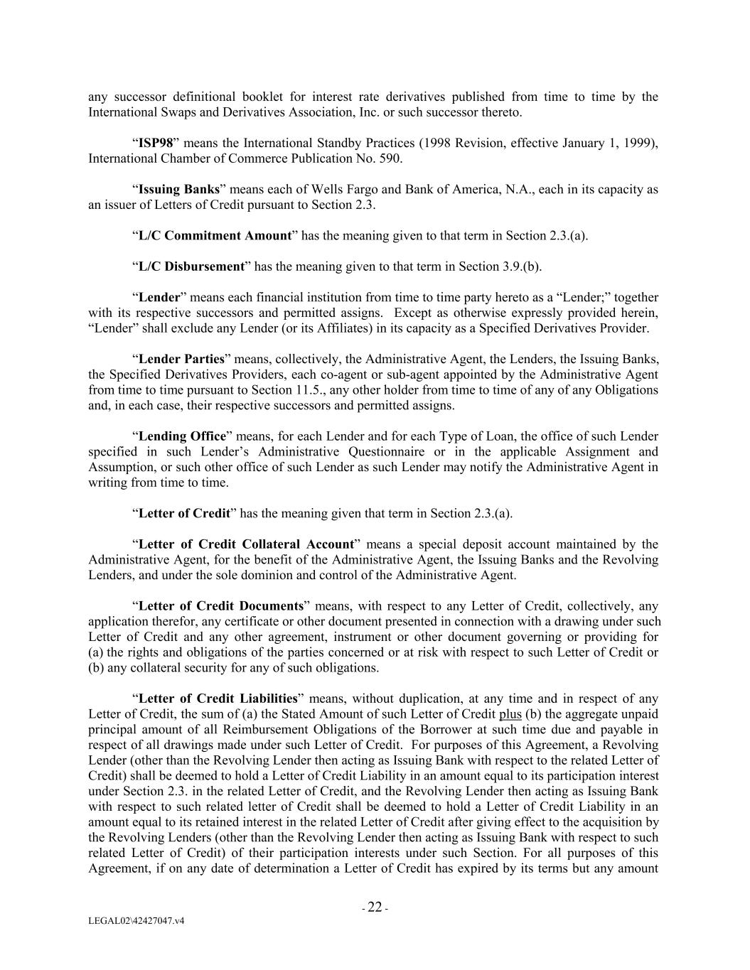 any successor definitional booklet for interest rate derivatives published from time to time by the International Swaps and Derivatives Association, Inc. or such successor thereto. “ISP98” means the International Standby Practices (1998 Revision, effective January 1, 1999), International Chamber of Commerce Publication No. 590. “Issuing Banks” means each of Wells Fargo and Bank of America, N.A., each in its capacity as an issuer of Letters of Credit pursuant to Section 2.3. “L/C Commitment Amount” has the meaning given to that term in Section 2.3.(a). “L/C Disbursement” has the meaning given to that term in Section 3.9.(b). “Lender” means each financial institution from time to time party hereto as a “Lender;” together with its respective successors and permitted assigns. Except as otherwise expressly provided herein, “Lender” shall exclude any Lender (or its Affiliates) in its capacity as a Specified Derivatives Provider. “Lender Parties” means, collectively, the Administrative Agent, the Lenders, the Issuing Banks, the Specified Derivatives Providers, each co-agent or sub-agent appointed by the Administrative Agent from time to time pursuant to Section 11.5., any other holder from time to time of any of any Obligations and, in each case, their respective successors and permitted assigns. “Lending Office” means, for each Lender and for each Type of Loan, the office of such Lender specified in such Lender’s Administrative Questionnaire or in the applicable Assignment and Assumption, or such other office of such Lender as such Lender may notify the Administrative Agent in writing from time to time. “Letter of Credit” has the meaning given that term in Section 2.3.(a). “Letter of Credit Collateral Account” means a special deposit account maintained by the Administrative Agent, for the benefit of the Administrative Agent, the Issuing Banks and the Revolving Lenders, and under the sole dominion and control of the Administrative Agent. “Letter of Credit Documents” means, with respect to any Letter of Credit, collectively, any application therefor, any certificate or other document presented in connection with a drawing under such Letter of Credit and any other agreement, instrument or other document governing or providing for (a) the rights and obligations of the parties concerned or at risk with respect to such Letter of Credit or (b) any collateral security for any of such obligations. “Letter of Credit Liabilities” means, without duplication, at any time and in respect of any Letter of Credit, the sum of (a) the Stated Amount of such Letter of Credit plus (b) the aggregate unpaid principal amount of all Reimbursement Obligations of the Borrower at such time due and payable in respect of all drawings made under such Letter of Credit. For purposes of this Agreement, a Revolving Lender (other than the Revolving Lender then acting as Issuing Bank with respect to the related Letter of Credit) shall be deemed to hold a Letter of Credit Liability in an amount equal to its participation interest under Section 2.3. in the related Letter of Credit, and the Revolving Lender then acting as Issuing Bank with respect to such related letter of Credit shall be deemed to hold a Letter of Credit Liability in an amount equal to its retained interest in the related Letter of Credit after giving effect to the acquisition by the Revolving Lenders (other than the Revolving Lender then acting as Issuing Bank with respect to such related Letter of Credit) of their participation interests under such Section. For all purposes of this Agreement, if on any date of determination a Letter of Credit has expired by its terms but any amount - 22 - LEGAL02\42427047.v4