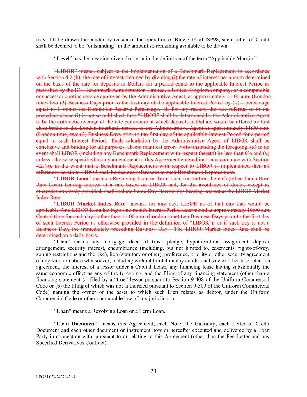 may still be drawn thereunder by reason of the operation of Rule 3.14 of ISP98, such Letter of Credit shall be deemed to be “outstanding” in the amount so remaining available to be drawn. “Level” has the meaning given that term in the definition of the term “Applicable Margin.” “LIBOR” means, subject to the implementation of a Benchmark Replacement in accordance with Section 4.2.(b), the rate of interest obtained by dividing (i) the rate of interest per annum determined on the basis of the rate for deposits in Dollars for a period equal to the applicable Interest Period as published by the ICE Benchmark Administration Limited, a United Kingdom company, or a comparable or successor quoting service approved by the Administrative Agent, at approximately 11:00 a.m. (London time) two (2) Business Days prior to the first day of the applicable Interest Period by (ii) a percentage equal to 1 minus the Eurodollar Reserve Percentage. If, for any reason, the rate referred to in the preceding clause (i) is not so published, then “LIBOR” shall be determined by the Administrative Agent to be the arithmetic average of the rate per annum at which deposits in Dollars would be offered by first class banks in the London interbank market to the Administrative Agent at approximately 11:00 a.m. (London time) two (2) Business Days prior to the first day of the applicable Interest Period for a period equal to such Interest Period. Each calculation by the Administrative Agent of LIBOR shall be conclusive and binding for all purposes, absent manifest error. Notwithstanding the foregoing, (x) in no event shall LIBOR (including any Benchmark Replacement with respect thereto) be less than 0% and (y) unless otherwise specified in any amendment to this Agreement entered into in accordance with Section 4.2.(b), in the event that a Benchmark Replacement with respect to LIBOR is implemented then all references herein to LIBOR shall be deemed references to such Benchmark Replacement. “LIBOR Loan” means a Revolving Loan or Term Loan (or portion thereof) (other than a Base Rate Loan) bearing interest at a rate based on LIBOR and, for the avoidance of doubt, except as otherwise expressly provided, shall include Same-Day Borrowings bearing interest at the LIBOR Market Index Rate. “LIBOR Market Index Rate” means, for any day, LIBOR as of that day that would be applicable for a LIBOR Loan having a one-month Interest Period determined at approximately 10:00 a.m. Central time for such day (rather than 11:00 a.m. (London time) two Business Days prior to the first day of such Interest Period as otherwise provided in the definition of “LIBOR”), or if such day is not a Business Day, the immediately preceding Business Day. The LIBOR Market Index Rate shall be determined on a daily basis. “Lien” means any mortgage, deed of trust, pledge, hypothecation, assignment, deposit arrangement, security interest, encumbrance (including, but not limited to, easements, rights-of-way, zoning restrictions and the like), lien (statutory or other), preference, priority or other security agreement of any kind or nature whatsoever, including without limitation any conditional sale or other title retention agreement, the interest of a lessor under a Capital Lease, any financing lease having substantially the same economic effect as any of the foregoing, and the filing of any financing statement (other than a financing statement (a) filed by a “true” lessor pursuant to Section 9-408 of the Uniform Commercial Code or (b) the filing of which was not authorized pursuant to Section 9-509 of the Uniform Commercial Code) naming the owner of the asset to which such Lien relates as debtor, under the Uniform Commercial Code or other comparable law of any jurisdiction. “Loan” means a Revolving Loan or a Term Loan. “Loan Document” means this Agreement, each Note, the Guaranty, each Letter of Credit Document and each other document or instrument now or hereafter executed and delivered by a Loan Party in connection with, pursuant to or relating to this Agreement (other than the Fee Letter and any Specified Derivatives Contract). - 23 - LEGAL02\42427047.v4