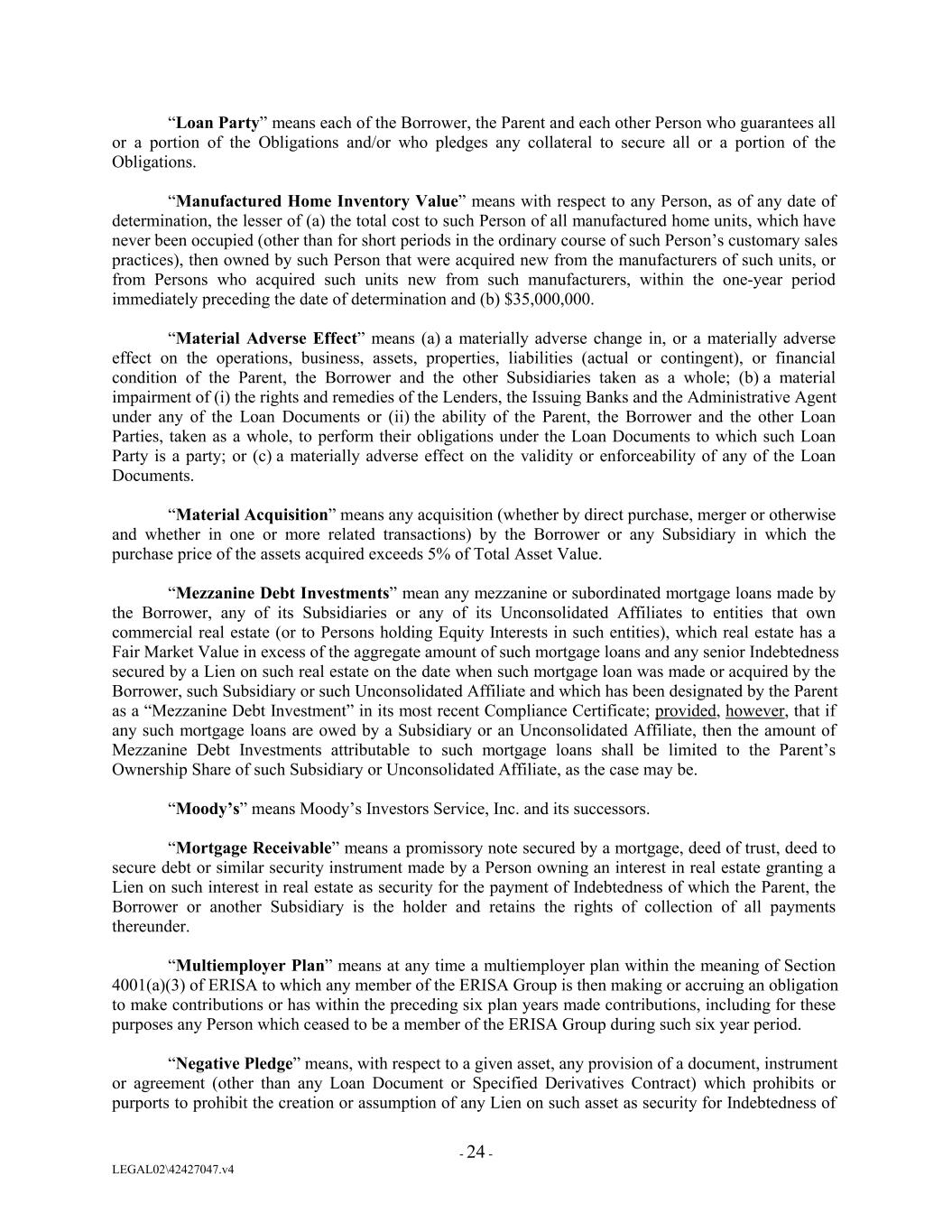 “Loan Party” means each of the Borrower, the Parent and each other Person who guarantees all or a portion of the Obligations and/or who pledges any collateral to secure all or a portion of the Obligations. “Manufactured Home Inventory Value” means with respect to any Person, as of any date of determination, the lesser of (a) the total cost to such Person of all manufactured home units, which have never been occupied (other than for short periods in the ordinary course of such Person’s customary sales practices), then owned by such Person that were acquired new from the manufacturers of such units, or from Persons who acquired such units new from such manufacturers, within the one-year period immediately preceding the date of determination and (b) $35,000,000. “Material Adverse Effect” means (a) a materially adverse change in, or a materially adverse effect on the operations, business, assets, properties, liabilities (actual or contingent), or financial condition of the Parent, the Borrower and the other Subsidiaries taken as a whole; (b) a material impairment of (i) the rights and remedies of the Lenders, the Issuing Banks and the Administrative Agent under any of the Loan Documents or (ii) the ability of the Parent, the Borrower and the other Loan Parties, taken as a whole, to perform their obligations under the Loan Documents to which such Loan Party is a party; or (c) a materially adverse effect on the validity or enforceability of any of the Loan Documents. “Material Acquisition” means any acquisition (whether by direct purchase, merger or otherwise and whether in one or more related transactions) by the Borrower or any Subsidiary in which the purchase price of the assets acquired exceeds 5% of Total Asset Value. “Mezzanine Debt Investments” mean any mezzanine or subordinated mortgage loans made by the Borrower, any of its Subsidiaries or any of its Unconsolidated Affiliates to entities that own commercial real estate (or to Persons holding Equity Interests in such entities), which real estate has a Fair Market Value in excess of the aggregate amount of such mortgage loans and any senior Indebtedness secured by a Lien on such real estate on the date when such mortgage loan was made or acquired by the Borrower, such Subsidiary or such Unconsolidated Affiliate and which has been designated by the Parent as a “Mezzanine Debt Investment” in its most recent Compliance Certificate; provided, however, that if any such mortgage loans are owed by a Subsidiary or an Unconsolidated Affiliate, then the amount of Mezzanine Debt Investments attributable to such mortgage loans shall be limited to the Parent’s Ownership Share of such Subsidiary or Unconsolidated Affiliate, as the case may be. “Moody’s” means Moody’s Investors Service, Inc. and its successors. “Mortgage Receivable” means a promissory note secured by a mortgage, deed of trust, deed to secure debt or similar security instrument made by a Person owning an interest in real estate granting a Lien on such interest in real estate as security for the payment of Indebtedness of which the Parent, the Borrower or another Subsidiary is the holder and retains the rights of collection of all payments thereunder. “Multiemployer Plan” means at any time a multiemployer plan within the meaning of Section 4001(a)(3) of ERISA to which any member of the ERISA Group is then making or accruing an obligation to make contributions or has within the preceding six plan years made contributions, including for these purposes any Person which ceased to be a member of the ERISA Group during such six year period. “Negative Pledge” means, with respect to a given asset, any provision of a document, instrument or agreement (other than any Loan Document or Specified Derivatives Contract) which prohibits or purports to prohibit the creation or assumption of any Lien on such asset as security for Indebtedness of - 24 - LEGAL02\42427047.v4