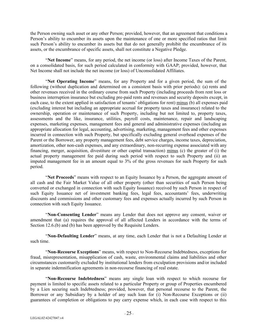 the Person owning such asset or any other Person; provided, however, that an agreement that conditions a Person’s ability to encumber its assets upon the maintenance of one or more specified ratios that limit such Person’s ability to encumber its assets but that do not generally prohibit the encumbrance of its assets, or the encumbrance of specific assets, shall not constitute a Negative Pledge. “Net Income” means, for any period, the net income (or loss) after Income Taxes of the Parent, on a consolidated basis, for such period calculated in conformity with GAAP; provided, however, that Net Income shall not include the net income (or loss) of Unconsolidated Affiliates. “Net Operating Income” means, for any Property and for a given period, the sum of the following (without duplication and determined on a consistent basis with prior periods): (a) rents and other revenues received in the ordinary course from such Property (including proceeds from rent loss or business interruption insurance but excluding pre-paid rents and revenues and security deposits except, in each case, to the extent applied in satisfaction of tenants’ obligations for rent) minus (b) all expenses paid (excluding interest but including an appropriate accrual for property taxes and insurance) related to the ownership, operation or maintenance of such Property, including but not limited to, property taxes, assessments and the like, insurance, utilities, payroll costs, maintenance, repair and landscaping expenses, marketing expenses, management fees and general and administrative expenses (including an appropriate allocation for legal, accounting, advertising, marketing, management fees and other expenses incurred in connection with such Property, but specifically excluding general overhead expenses of the Parent or the Borrower, any property management fees, debt service charges, income taxes, depreciation, amortization, other non-cash expenses, and any extraordinary, non-recurring expense associated with any financing, merger, acquisition, divestiture or other capital transaction) minus (c) the greater of (i) the actual property management fee paid during such period with respect to such Property and (ii) an imputed management fee in an amount equal to 3% of the gross revenues for such Property for such period. “Net Proceeds” means with respect to an Equity Issuance by a Person, the aggregate amount of all cash and the Fair Market Value of all other property (other than securities of such Person being converted or exchanged in connection with such Equity Issuance) received by such Person in respect of such Equity Issuance net of investment banking fees, legal fees, accountants’ fees, underwriting discounts and commissions and other customary fees and expenses actually incurred by such Person in connection with such Equity Issuance. “Non-Consenting Lender” means any Lender that does not approve any consent, waiver or amendment that (a) requires the approval of all affected Lenders in accordance with the terms of Section 12.6.(b) and (b) has been approved by the Requisite Lenders. “Non-Defaulting Lender” means, at any time, each Lender that is not a Defaulting Lender at such time. “Non-Recourse Exceptions” means, with respect to Non-Recourse Indebtedness, exceptions for fraud, misrepresentation, misapplication of cash, waste, environmental claims and liabilities and other circumstances customarily excluded by institutional lenders from exculpation provisions and/or included in separate indemnification agreements in non-recourse financing of real estate. “Non-Recourse Indebtedness” means any single loan with respect to which recourse for payment is limited to specific assets related to a particular Property or group of Properties encumbered by a Lien securing such Indebtedness; provided, however, that personal recourse to the Parent, the Borrower or any Subsidiary by a holder of any such loan for (i) Non-Recourse Exceptions or (ii) guarantees of completion or obligations to pay carry expense which, in each case with respect to this - 25 - LEGAL02\42427047.v4