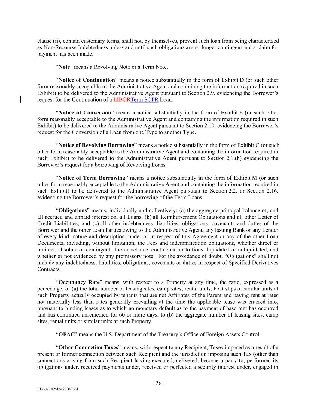 clause (ii), contain customary terms, shall not, by themselves, prevent such loan from being characterized as Non-Recourse Indebtedness unless and until such obligations are no longer contingent and a claim for payment has been made. “Note” means a Revolving Note or a Term Note. “Notice of Continuation” means a notice substantially in the form of Exhibit D (or such other form reasonably acceptable to the Administrative Agent and containing the information required in such Exhibit) to be delivered to the Administrative Agent pursuant to Section 2.9. evidencing the Borrower’s request for the Continuation of a LIBORTerm SOFR Loan. “Notice of Conversion” means a notice substantially in the form of Exhibit E (or such other form reasonably acceptable to the Administrative Agent and containing the information required in such Exhibit) to be delivered to the Administrative Agent pursuant to Section 2.10. evidencing the Borrower’s request for the Conversion of a Loan from one Type to another Type. “Notice of Revolving Borrowing” means a notice substantially in the form of Exhibit C (or such other form reasonably acceptable to the Administrative Agent and containing the information required in such Exhibit) to be delivered to the Administrative Agent pursuant to Section 2.1.(b) evidencing the Borrower’s request for a borrowing of Revolving Loans. “Notice of Term Borrowing” means a notice substantially in the form of Exhibit M (or such other form reasonably acceptable to the Administrative Agent and containing the information required in such Exhibit) to be delivered to the Administrative Agent pursuant to Section 2.2. or Section 2.16. evidencing the Borrower’s request for the borrowing of the Term Loans. “Obligations” means, individually and collectively: (a) the aggregate principal balance of, and all accrued and unpaid interest on, all Loans; (b) all Reimbursement Obligations and all other Letter of Credit Liabilities; and (c) all other indebtedness, liabilities, obligations, covenants and duties of the Borrower and the other Loan Parties owing to the Administrative Agent, any Issuing Bank or any Lender of every kind, nature and description, under or in respect of this Agreement or any of the other Loan Documents, including, without limitation, the Fees and indemnification obligations, whether direct or indirect, absolute or contingent, due or not due, contractual or tortious, liquidated or unliquidated, and whether or not evidenced by any promissory note. For the avoidance of doubt, “Obligations” shall not include any indebtedness, liabilities, obligations, covenants or duties in respect of Specified Derivatives Contracts. “Occupancy Rate” means, with respect to a Property at any time, the ratio, expressed as a percentage, of (a) the total number of leasing sites, camp sites, rental units, boat slips or similar units at such Property actually occupied by tenants that are not Affiliates of the Parent and paying rent at rates not materially less than rates generally prevailing at the time the applicable lease was entered into, pursuant to binding leases as to which no monetary default as to the payment of base rent has occurred and has continued unremedied for 60 or more days, to (b) the aggregate number of leasing sites, camp sites, rental units or similar units at such Property. “OFAC” means the U.S. Department of the Treasury’s Office of Foreign Assets Control. “Other Connection Taxes” means, with respect to any Recipient, Taxes imposed as a result of a present or former connection between such Recipient and the jurisdiction imposing such Tax (other than connections arising from such Recipient having executed, delivered, become a party to, performed its obligations under, received payments under, received or perfected a security interest under, engaged in - 26 - LEGAL02\42427047.v4