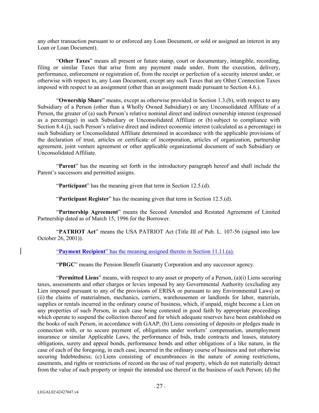 any other transaction pursuant to or enforced any Loan Document, or sold or assigned an interest in any Loan or Loan Document). “Other Taxes” means all present or future stamp, court or documentary, intangible, recording, filing or similar Taxes that arise from any payment made under, from the execution, delivery, performance, enforcement or registration of, from the receipt or perfection of a security interest under, or otherwise with respect to, any Loan Document, except any such Taxes that are Other Connection Taxes imposed with respect to an assignment (other than an assignment made pursuant to Section 4.6.). “Ownership Share” means, except as otherwise provided in Section 1.3.(b), with respect to any Subsidiary of a Person (other than a Wholly Owned Subsidiary) or any Unconsolidated Affiliate of a Person, the greater of (a) such Person’s relative nominal direct and indirect ownership interest (expressed as a percentage) in such Subsidiary or Unconsolidated Affiliate or (b) subject to compliance with Section 8.4.(j), such Person’s relative direct and indirect economic interest (calculated as a percentage) in such Subsidiary or Unconsolidated Affiliate determined in accordance with the applicable provisions of the declaration of trust, articles or certificate of incorporation, articles of organization, partnership agreement, joint venture agreement or other applicable organizational document of such Subsidiary or Unconsolidated Affiliate. “Parent” has the meaning set forth in the introductory paragraph hereof and shall include the Parent’s successors and permitted assigns. “Participant” has the meaning given that term in Section 12.5.(d). “Participant Register” has the meaning given that term in Section 12.5.(d). “Partnership Agreement” means the Second Amended and Restated Agreement of Limited Partnership dated as of March 15, 1996 for the Borrower. “PATRIOT Act” means the USA PATRIOT Act (Title III of Pub. L. 107-56 (signed into law October 26, 2001)). “Payment Recipient” has the meaning assigned thereto in Section 11.11.(a). “PBGC” means the Pension Benefit Guaranty Corporation and any successor agency. “Permitted Liens” means, with respect to any asset or property of a Person, (a)(i) Liens securing taxes, assessments and other charges or levies imposed by any Governmental Authority (excluding any Lien imposed pursuant to any of the provisions of ERISA or pursuant to any Environmental Laws) or (ii) the claims of materialmen, mechanics, carriers, warehousemen or landlords for labor, materials, supplies or rentals incurred in the ordinary course of business, which, if unpaid, might become a Lien on any properties of such Person, in each case being contested in good faith by appropriate proceedings which operate to suspend the collection thereof and for which adequate reserves have been established on the books of such Person, in accordance with GAAP; (b) Liens consisting of deposits or pledges made in connection with, or to secure payment of, obligations under workers’ compensation, unemployment insurance or similar Applicable Laws, the performance of bids, trade contracts and leases, statutory obligations, surety and appeal bonds, performance bonds and other obligations of a like nature, in the case of each of the foregoing, in each case, incurred in the ordinary course of business and not otherwise securing Indebtedness; (c) Liens consisting of encumbrances in the nature of zoning restrictions, easements, and rights or restrictions of record on the use of real property, which do not materially detract from the value of such property or impair the intended use thereof in the business of such Person; (d) the - 27 - LEGAL02\42427047.v4