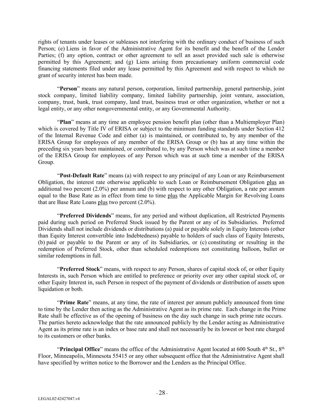 rights of tenants under leases or subleases not interfering with the ordinary conduct of business of such Person; (e) Liens in favor of the Administrative Agent for its benefit and the benefit of the Lender Parties; (f) any option, contract or other agreement to sell an asset provided such sale is otherwise permitted by this Agreement; and (g) Liens arising from precautionary uniform commercial code financing statements filed under any lease permitted by this Agreement and with respect to which no grant of security interest has been made. “Person” means any natural person, corporation, limited partnership, general partnership, joint stock company, limited liability company, limited liability partnership, joint venture, association, company, trust, bank, trust company, land trust, business trust or other organization, whether or not a legal entity, or any other nongovernmental entity, or any Governmental Authority. “Plan” means at any time an employee pension benefit plan (other than a Multiemployer Plan) which is covered by Title IV of ERISA or subject to the minimum funding standards under Section 412 of the Internal Revenue Code and either (a) is maintained, or contributed to, by any member of the ERISA Group for employees of any member of the ERISA Group or (b) has at any time within the preceding six years been maintained, or contributed to, by any Person which was at such time a member of the ERISA Group for employees of any Person which was at such time a member of the ERISA Group. “Post-Default Rate” means (a) with respect to any principal of any Loan or any Reimbursement Obligation, the interest rate otherwise applicable to such Loan or Reimbursement Obligation plus an additional two percent (2.0%) per annum and (b) with respect to any other Obligation, a rate per annum equal to the Base Rate as in effect from time to time plus the Applicable Margin for Revolving Loans that are Base Rate Loans plus two percent (2.0%). “Preferred Dividends” means, for any period and without duplication, all Restricted Payments paid during such period on Preferred Stock issued by the Parent or any of its Subsidiaries. Preferred Dividends shall not include dividends or distributions (a) paid or payable solely in Equity Interests (other than Equity Interest convertible into Indebtedness) payable to holders of such class of Equity Interests, (b) paid or payable to the Parent or any of its Subsidiaries, or (c) constituting or resulting in the redemption of Preferred Stock, other than scheduled redemptions not constituting balloon, bullet or similar redemptions in full. “Preferred Stock” means, with respect to any Person, shares of capital stock of, or other Equity Interests in, such Person which are entitled to preference or priority over any other capital stock of, or other Equity Interest in, such Person in respect of the payment of dividends or distribution of assets upon liquidation or both. “Prime Rate” means, at any time, the rate of interest per annum publicly announced from time to time by the Lender then acting as the Administrative Agent as its prime rate. Each change in the Prime Rate shall be effective as of the opening of business on the day such change in such prime rate occurs. The parties hereto acknowledge that the rate announced publicly by the Lender acting as Administrative Agent as its prime rate is an index or base rate and shall not necessarily be its lowest or best rate charged to its customers or other banks. “Principal Office” means the office of the Administrative Agent located at 600 South 4th St., 8th Floor, Minneapolis, Minnesota 55415 or any other subsequent office that the Administrative Agent shall have specified by written notice to the Borrower and the Lenders as the Principal Office. - 28 - LEGAL02\42427047.v4