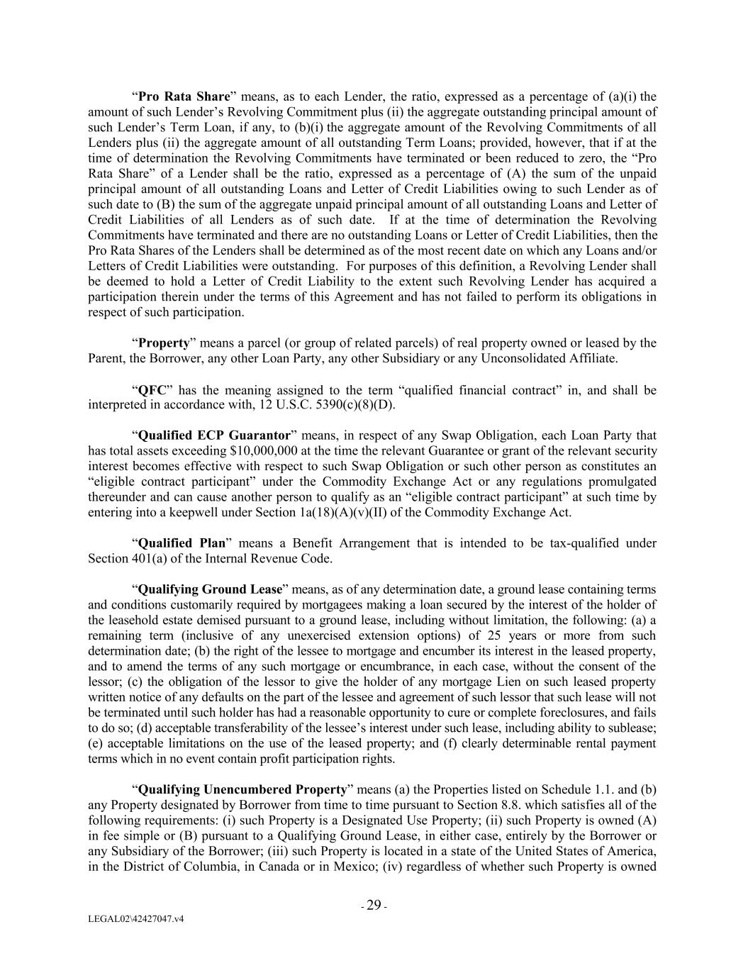 “Pro Rata Share” means, as to each Lender, the ratio, expressed as a percentage of (a)(i) the amount of such Lender’s Revolving Commitment plus (ii) the aggregate outstanding principal amount of such Lender’s Term Loan, if any, to (b)(i) the aggregate amount of the Revolving Commitments of all Lenders plus (ii) the aggregate amount of all outstanding Term Loans; provided, however, that if at the time of determination the Revolving Commitments have terminated or been reduced to zero, the “Pro Rata Share” of a Lender shall be the ratio, expressed as a percentage of (A) the sum of the unpaid principal amount of all outstanding Loans and Letter of Credit Liabilities owing to such Lender as of such date to (B) the sum of the aggregate unpaid principal amount of all outstanding Loans and Letter of Credit Liabilities of all Lenders as of such date. If at the time of determination the Revolving Commitments have terminated and there are no outstanding Loans or Letter of Credit Liabilities, then the Pro Rata Shares of the Lenders shall be determined as of the most recent date on which any Loans and/or Letters of Credit Liabilities were outstanding. For purposes of this definition, a Revolving Lender shall be deemed to hold a Letter of Credit Liability to the extent such Revolving Lender has acquired a participation therein under the terms of this Agreement and has not failed to perform its obligations in respect of such participation. “Property” means a parcel (or group of related parcels) of real property owned or leased by the Parent, the Borrower, any other Loan Party, any other Subsidiary or any Unconsolidated Affiliate. “QFC” has the meaning assigned to the term “qualified financial contract” in, and shall be interpreted in accordance with, 12 U.S.C. 5390(c)(8)(D). “Qualified ECP Guarantor” means, in respect of any Swap Obligation, each Loan Party that has total assets exceeding $10,000,000 at the time the relevant Guarantee or grant of the relevant security interest becomes effective with respect to such Swap Obligation or such other person as constitutes an “eligible contract participant” under the Commodity Exchange Act or any regulations promulgated thereunder and can cause another person to qualify as an “eligible contract participant” at such time by entering into a keepwell under Section 1a(18)(A)(v)(II) of the Commodity Exchange Act. “Qualified Plan” means a Benefit Arrangement that is intended to be tax-qualified under Section 401(a) of the Internal Revenue Code. “Qualifying Ground Lease” means, as of any determination date, a ground lease containing terms and conditions customarily required by mortgagees making a loan secured by the interest of the holder of the leasehold estate demised pursuant to a ground lease, including without limitation, the following: (a) a remaining term (inclusive of any unexercised extension options) of 25 years or more from such determination date; (b) the right of the lessee to mortgage and encumber its interest in the leased property, and to amend the terms of any such mortgage or encumbrance, in each case, without the consent of the lessor; (c) the obligation of the lessor to give the holder of any mortgage Lien on such leased property written notice of any defaults on the part of the lessee and agreement of such lessor that such lease will not be terminated until such holder has had a reasonable opportunity to cure or complete foreclosures, and fails to do so; (d) acceptable transferability of the lessee’s interest under such lease, including ability to sublease; (e) acceptable limitations on the use of the leased property; and (f) clearly determinable rental payment terms which in no event contain profit participation rights. “Qualifying Unencumbered Property” means (a) the Properties listed on Schedule 1.1. and (b) any Property designated by Borrower from time to time pursuant to Section 8.8. which satisfies all of the following requirements: (i) such Property is a Designated Use Property; (ii) such Property is owned (A) in fee simple or (B) pursuant to a Qualifying Ground Lease, in either case, entirely by the Borrower or any Subsidiary of the Borrower; (iii) such Property is located in a state of the United States of America, in the District of Columbia, in Canada or in Mexico; (iv) regardless of whether such Property is owned - 29 - LEGAL02\42427047.v4