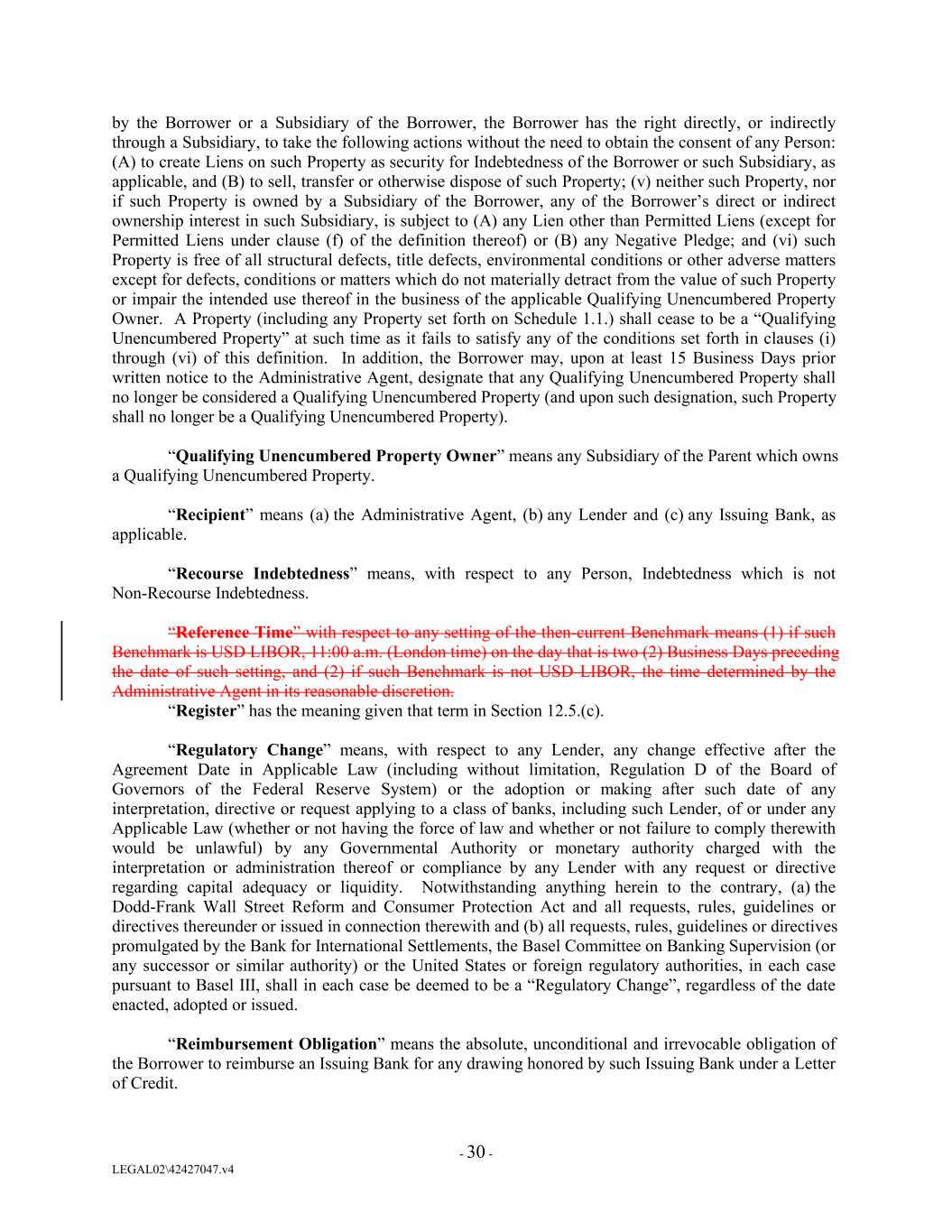 by the Borrower or a Subsidiary of the Borrower, the Borrower has the right directly, or indirectly through a Subsidiary, to take the following actions without the need to obtain the consent of any Person: (A) to create Liens on such Property as security for Indebtedness of the Borrower or such Subsidiary, as applicable, and (B) to sell, transfer or otherwise dispose of such Property; (v) neither such Property, nor if such Property is owned by a Subsidiary of the Borrower, any of the Borrower’s direct or indirect ownership interest in such Subsidiary, is subject to (A) any Lien other than Permitted Liens (except for Permitted Liens under clause (f) of the definition thereof) or (B) any Negative Pledge; and (vi) such Property is free of all structural defects, title defects, environmental conditions or other adverse matters except for defects, conditions or matters which do not materially detract from the value of such Property or impair the intended use thereof in the business of the applicable Qualifying Unencumbered Property Owner. A Property (including any Property set forth on Schedule 1.1.) shall cease to be a “Qualifying Unencumbered Property” at such time as it fails to satisfy any of the conditions set forth in clauses (i) through (vi) of this definition. In addition, the Borrower may, upon at least 15 Business Days prior written notice to the Administrative Agent, designate that any Qualifying Unencumbered Property shall no longer be considered a Qualifying Unencumbered Property (and upon such designation, such Property shall no longer be a Qualifying Unencumbered Property). “Qualifying Unencumbered Property Owner” means any Subsidiary of the Parent which owns a Qualifying Unencumbered Property. “Recipient” means (a) the Administrative Agent, (b) any Lender and (c) any Issuing Bank, as applicable. “Recourse Indebtedness” means, with respect to any Person, Indebtedness which is not Non-Recourse Indebtedness. “Reference Time” with respect to any setting of the then-current Benchmark means (1) if such Benchmark is USD LIBOR, 11:00 a.m. (London time) on the day that is two (2) Business Days preceding the date of such setting, and (2) if such Benchmark is not USD LIBOR, the time determined by the Administrative Agent in its reasonable discretion. “Register” has the meaning given that term in Section 12.5.(c). “Regulatory Change” means, with respect to any Lender, any change effective after the Agreement Date in Applicable Law (including without limitation, Regulation D of the Board of Governors of the Federal Reserve System) or the adoption or making after such date of any interpretation, directive or request applying to a class of banks, including such Lender, of or under any Applicable Law (whether or not having the force of law and whether or not failure to comply therewith would be unlawful) by any Governmental Authority or monetary authority charged with the interpretation or administration thereof or compliance by any Lender with any request or directive regarding capital adequacy or liquidity. Notwithstanding anything herein to the contrary, (a) the Dodd-Frank Wall Street Reform and Consumer Protection Act and all requests, rules, guidelines or directives thereunder or issued in connection therewith and (b) all requests, rules, guidelines or directives promulgated by the Bank for International Settlements, the Basel Committee on Banking Supervision (or any successor or similar authority) or the United States or foreign regulatory authorities, in each case pursuant to Basel III, shall in each case be deemed to be a “Regulatory Change”, regardless of the date enacted, adopted or issued. “Reimbursement Obligation” means the absolute, unconditional and irrevocable obligation of the Borrower to reimburse an Issuing Bank for any drawing honored by such Issuing Bank under a Letter of Credit. - 30 - LEGAL02\42427047.v4