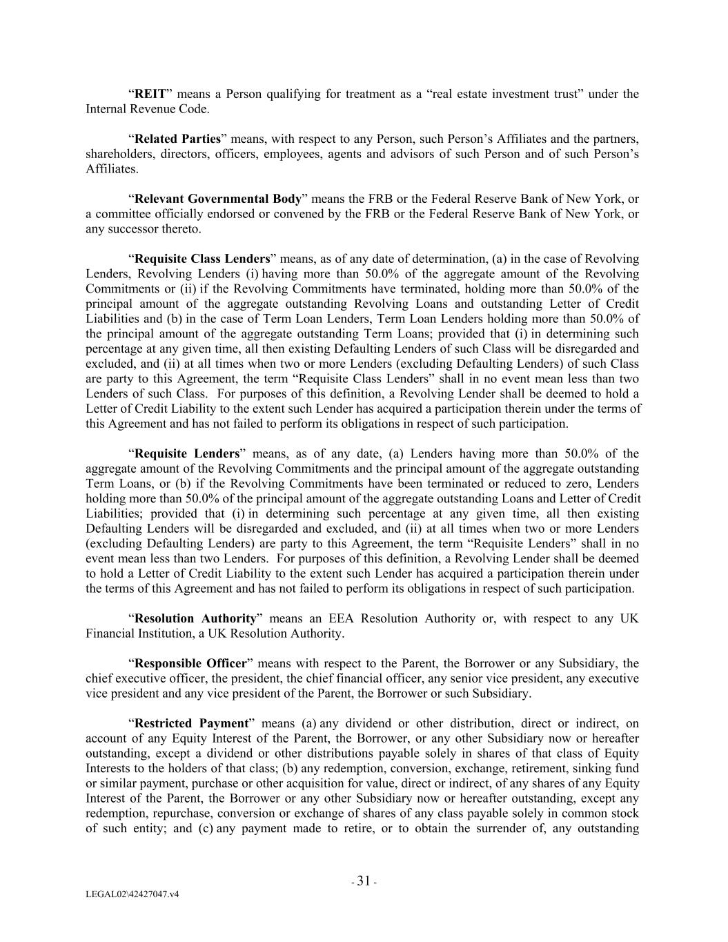 “REIT” means a Person qualifying for treatment as a “real estate investment trust” under the Internal Revenue Code. “Related Parties” means, with respect to any Person, such Person’s Affiliates and the partners, shareholders, directors, officers, employees, agents and advisors of such Person and of such Person’s Affiliates. “Relevant Governmental Body” means the FRB or the Federal Reserve Bank of New York, or a committee officially endorsed or convened by the FRB or the Federal Reserve Bank of New York, or any successor thereto. “Requisite Class Lenders” means, as of any date of determination, (a) in the case of Revolving Lenders, Revolving Lenders (i) having more than 50.0% of the aggregate amount of the Revolving Commitments or (ii) if the Revolving Commitments have terminated, holding more than 50.0% of the principal amount of the aggregate outstanding Revolving Loans and outstanding Letter of Credit Liabilities and (b) in the case of Term Loan Lenders, Term Loan Lenders holding more than 50.0% of the principal amount of the aggregate outstanding Term Loans; provided that (i) in determining such percentage at any given time, all then existing Defaulting Lenders of such Class will be disregarded and excluded, and (ii) at all times when two or more Lenders (excluding Defaulting Lenders) of such Class are party to this Agreement, the term “Requisite Class Lenders” shall in no event mean less than two Lenders of such Class. For purposes of this definition, a Revolving Lender shall be deemed to hold a Letter of Credit Liability to the extent such Lender has acquired a participation therein under the terms of this Agreement and has not failed to perform its obligations in respect of such participation. “Requisite Lenders” means, as of any date, (a) Lenders having more than 50.0% of the aggregate amount of the Revolving Commitments and the principal amount of the aggregate outstanding Term Loans, or (b) if the Revolving Commitments have been terminated or reduced to zero, Lenders holding more than 50.0% of the principal amount of the aggregate outstanding Loans and Letter of Credit Liabilities; provided that (i) in determining such percentage at any given time, all then existing Defaulting Lenders will be disregarded and excluded, and (ii) at all times when two or more Lenders (excluding Defaulting Lenders) are party to this Agreement, the term “Requisite Lenders” shall in no event mean less than two Lenders. For purposes of this definition, a Revolving Lender shall be deemed to hold a Letter of Credit Liability to the extent such Lender has acquired a participation therein under the terms of this Agreement and has not failed to perform its obligations in respect of such participation. “Resolution Authority” means an EEA Resolution Authority or, with respect to any UK Financial Institution, a UK Resolution Authority. “Responsible Officer” means with respect to the Parent, the Borrower or any Subsidiary, the chief executive officer, the president, the chief financial officer, any senior vice president, any executive vice president and any vice president of the Parent, the Borrower or such Subsidiary. “Restricted Payment” means (a) any dividend or other distribution, direct or indirect, on account of any Equity Interest of the Parent, the Borrower, or any other Subsidiary now or hereafter outstanding, except a dividend or other distributions payable solely in shares of that class of Equity Interests to the holders of that class; (b) any redemption, conversion, exchange, retirement, sinking fund or similar payment, purchase or other acquisition for value, direct or indirect, of any shares of any Equity Interest of the Parent, the Borrower or any other Subsidiary now or hereafter outstanding, except any redemption, repurchase, conversion or exchange of shares of any class payable solely in common stock of such entity; and (c) any payment made to retire, or to obtain the surrender of, any outstanding - 31 - LEGAL02\42427047.v4