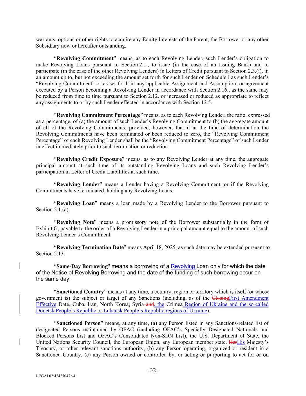 warrants, options or other rights to acquire any Equity Interests of the Parent, the Borrower or any other Subsidiary now or hereafter outstanding. “Revolving Commitment” means, as to each Revolving Lender, such Lender’s obligation to make Revolving Loans pursuant to Section 2.1., to issue (in the case of an Issuing Bank) and to participate (in the case of the other Revolving Lenders) in Letters of Credit pursuant to Section 2.3.(i), in an amount up to, but not exceeding the amount set forth for such Lender on Schedule I as such Lender’s “Revolving Commitment” or as set forth in any applicable Assignment and Assumption, or agreement executed by a Person becoming a Revolving Lender in accordance with Section 2.16., as the same may be reduced from time to time pursuant to Section 2.12. or increased or reduced as appropriate to reflect any assignments to or by such Lender effected in accordance with Section 12.5. “Revolving Commitment Percentage” means, as to each Revolving Lender, the ratio, expressed as a percentage, of (a) the amount of such Lender’s Revolving Commitment to (b) the aggregate amount of all of the Revolving Commitments; provided, however, that if at the time of determination the Revolving Commitments have been terminated or been reduced to zero, the “Revolving Commitment Percentage” of each Revolving Lender shall be the “Revolving Commitment Percentage” of such Lender in effect immediately prior to such termination or reduction. “Revolving Credit Exposure” means, as to any Revolving Lender at any time, the aggregate principal amount at such time of its outstanding Revolving Loans and such Revolving Lender’s participation in Letter of Credit Liabilities at such time. “Revolving Lender” means a Lender having a Revolving Commitment, or if the Revolving Commitments have terminated, holding any Revolving Loans. “Revolving Loan” means a loan made by a Revolving Lender to the Borrower pursuant to Section 2.1.(a). “Revolving Note” means a promissory note of the Borrower substantially in the form of Exhibit G, payable to the order of a Revolving Lender in a principal amount equal to the amount of such Revolving Lender’s Commitment. “Revolving Termination Date” means April 18, 2025, as such date may be extended pursuant to Section 2.13. “Same-Day Borrowing” means a borrowing of a Revolving Loan only for which the date of the Notice of Revolving Borrowing and the date of the funding of such borrowing occur on the same day. “Sanctioned Country” means at any time, a country, region or territory which is itself (or whose government is) the subject or target of any Sanctions (including, as of the ClosingFirst Amendment Effective Date, Cuba, Iran, North Korea, Syria and, the Crimea Region of Ukraine and the so-called Donetsk People’s Republic or Luhansk People’s Republic regions of Ukraine). “Sanctioned Person” means, at any time, (a) any Person listed in any Sanctions-related list of designated Persons maintained by OFAC (including OFAC’s Specially Designated Nationals and Blocked Persons List and OFAC’s Consolidated Non-SDN List), the U.S. Department of State, the United Nations Security Council, the European Union, any European member state, HerHis Majesty’s Treasury, or other relevant sanctions authority, (b) any Person operating, organized or resident in a Sanctioned Country, (c) any Person owned or controlled by, or acting or purporting to act for or on - 32 - LEGAL02\42427047.v4