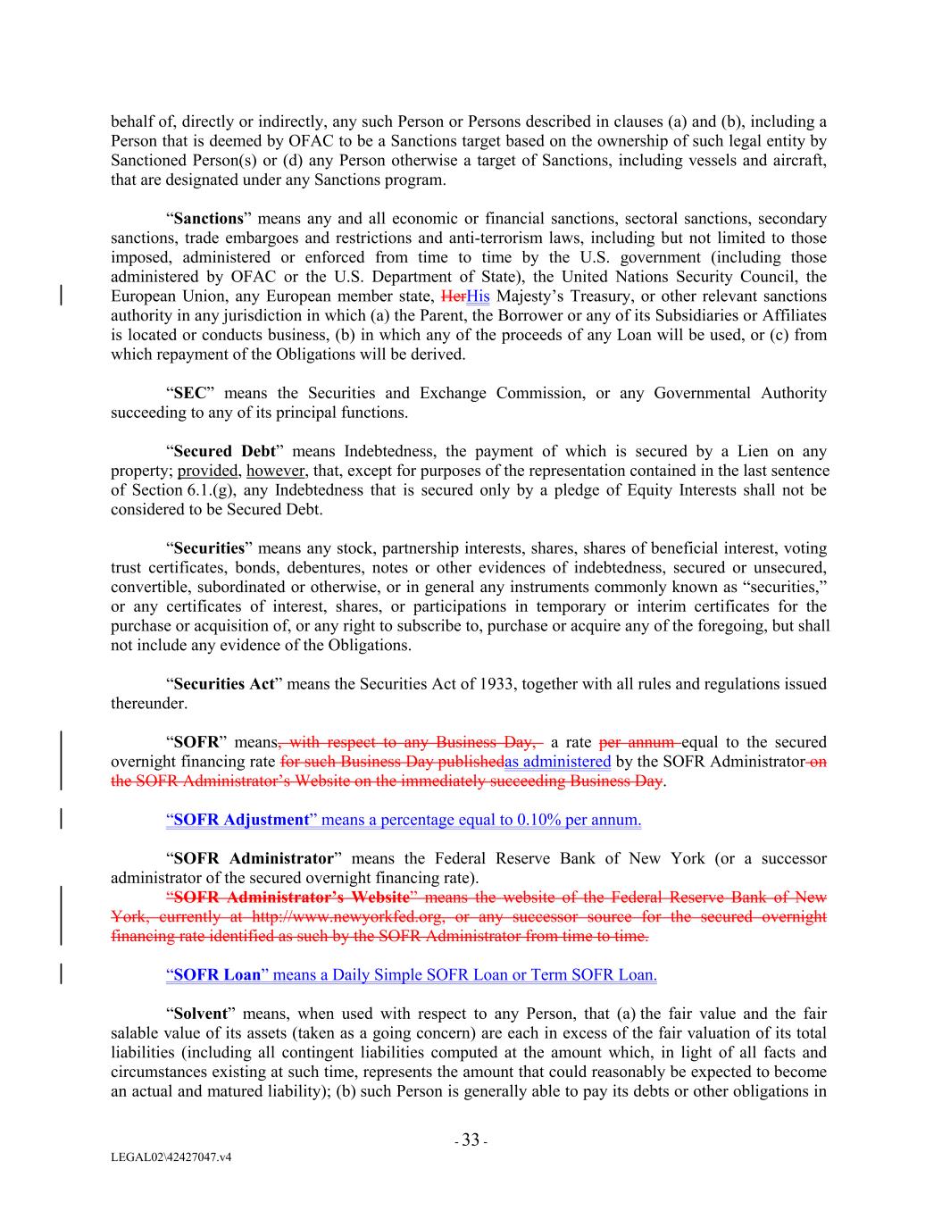 behalf of, directly or indirectly, any such Person or Persons described in clauses (a) and (b), including a Person that is deemed by OFAC to be a Sanctions target based on the ownership of such legal entity by Sanctioned Person(s) or (d) any Person otherwise a target of Sanctions, including vessels and aircraft, that are designated under any Sanctions program. “Sanctions” means any and all economic or financial sanctions, sectoral sanctions, secondary sanctions, trade embargoes and restrictions and anti-terrorism laws, including but not limited to those imposed, administered or enforced from time to time by the U.S. government (including those administered by OFAC or the U.S. Department of State), the United Nations Security Council, the European Union, any European member state, HerHis Majesty’s Treasury, or other relevant sanctions authority in any jurisdiction in which (a) the Parent, the Borrower or any of its Subsidiaries or Affiliates is located or conducts business, (b) in which any of the proceeds of any Loan will be used, or (c) from which repayment of the Obligations will be derived. “SEC” means the Securities and Exchange Commission, or any Governmental Authority succeeding to any of its principal functions. “Secured Debt” means Indebtedness, the payment of which is secured by a Lien on any property; provided, however, that, except for purposes of the representation contained in the last sentence of Section 6.1.(g), any Indebtedness that is secured only by a pledge of Equity Interests shall not be considered to be Secured Debt. “Securities” means any stock, partnership interests, shares, shares of beneficial interest, voting trust certificates, bonds, debentures, notes or other evidences of indebtedness, secured or unsecured, convertible, subordinated or otherwise, or in general any instruments commonly known as “securities,” or any certificates of interest, shares, or participations in temporary or interim certificates for the purchase or acquisition of, or any right to subscribe to, purchase or acquire any of the foregoing, but shall not include any evidence of the Obligations. “Securities Act” means the Securities Act of 1933, together with all rules and regulations issued thereunder. “SOFR” means, with respect to any Business Day, a rate per annum equal to the secured overnight financing rate for such Business Day publishedas administered by the SOFR Administrator on the SOFR Administrator’s Website on the immediately succeeding Business Day. “SOFR Adjustment” means a percentage equal to 0.10% per annum. “SOFR Administrator” means the Federal Reserve Bank of New York (or a successor administrator of the secured overnight financing rate). “SOFR Administrator’s Website” means the website of the Federal Reserve Bank of New York, currently at http://www.newyorkfed.org, or any successor source for the secured overnight financing rate identified as such by the SOFR Administrator from time to time. “SOFR Loan” means a Daily Simple SOFR Loan or Term SOFR Loan. “Solvent” means, when used with respect to any Person, that (a) the fair value and the fair salable value of its assets (taken as a going concern) are each in excess of the fair valuation of its total liabilities (including all contingent liabilities computed at the amount which, in light of all facts and circumstances existing at such time, represents the amount that could reasonably be expected to become an actual and matured liability); (b) such Person is generally able to pay its debts or other obligations in - 33 - LEGAL02\42427047.v4