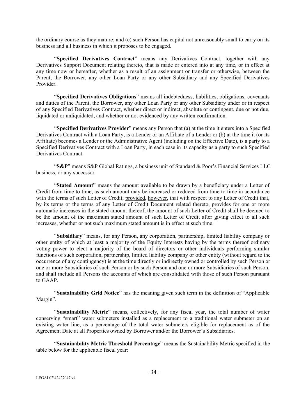 the ordinary course as they mature; and (c) such Person has capital not unreasonably small to carry on its business and all business in which it proposes to be engaged. “Specified Derivatives Contract” means any Derivatives Contract, together with any Derivatives Support Document relating thereto, that is made or entered into at any time, or in effect at any time now or hereafter, whether as a result of an assignment or transfer or otherwise, between the Parent, the Borrower, any other Loan Party or any other Subsidiary and any Specified Derivatives Provider. “Specified Derivatives Obligations” means all indebtedness, liabilities, obligations, covenants and duties of the Parent, the Borrower, any other Loan Party or any other Subsidiary under or in respect of any Specified Derivatives Contract, whether direct or indirect, absolute or contingent, due or not due, liquidated or unliquidated, and whether or not evidenced by any written confirmation. “Specified Derivatives Provider” means any Person that (a) at the time it enters into a Specified Derivatives Contract with a Loan Party, is a Lender or an Affiliate of a Lender or (b) at the time it (or its Affiliate) becomes a Lender or the Administrative Agent (including on the Effective Date), is a party to a Specified Derivatives Contract with a Loan Party, in each case in its capacity as a party to such Specified Derivatives Contract. “S&P” means S&P Global Ratings, a business unit of Standard & Poor’s Financial Services LLC business, or any successor. “Stated Amount” means the amount available to be drawn by a beneficiary under a Letter of Credit from time to time, as such amount may be increased or reduced from time to time in accordance with the terms of such Letter of Credit; provided, however, that with respect to any Letter of Credit that, by its terms or the terms of any Letter of Credit Document related thereto, provides for one or more automatic increases in the stated amount thereof, the amount of such Letter of Credit shall be deemed to be the amount of the maximum stated amount of such Letter of Credit after giving effect to all such increases, whether or not such maximum stated amount is in effect at such time. “Subsidiary” means, for any Person, any corporation, partnership, limited liability company or other entity of which at least a majority of the Equity Interests having by the terms thereof ordinary voting power to elect a majority of the board of directors or other individuals performing similar functions of such corporation, partnership, limited liability company or other entity (without regard to the occurrence of any contingency) is at the time directly or indirectly owned or controlled by such Person or one or more Subsidiaries of such Person or by such Person and one or more Subsidiaries of such Person, and shall include all Persons the accounts of which are consolidated with those of such Person pursuant to GAAP. “Sustainability Grid Notice” has the meaning given such term in the definition of “Applicable Margin”. “Sustainability Metric” means, collectively, for any fiscal year, the total number of water conserving “smart” water submeters installed as a replacement to a traditional water submeter on an existing water line, as a percentage of the total water submeters eligible for replacement as of the Agreement Date at all Properties owned by Borrower and/or the Borrower’s Subsidiaries. “Sustainability Metric Threshold Percentage” means the Sustainability Metric specified in the table below for the applicable fiscal year: - 34 - LEGAL02\42427047.v4