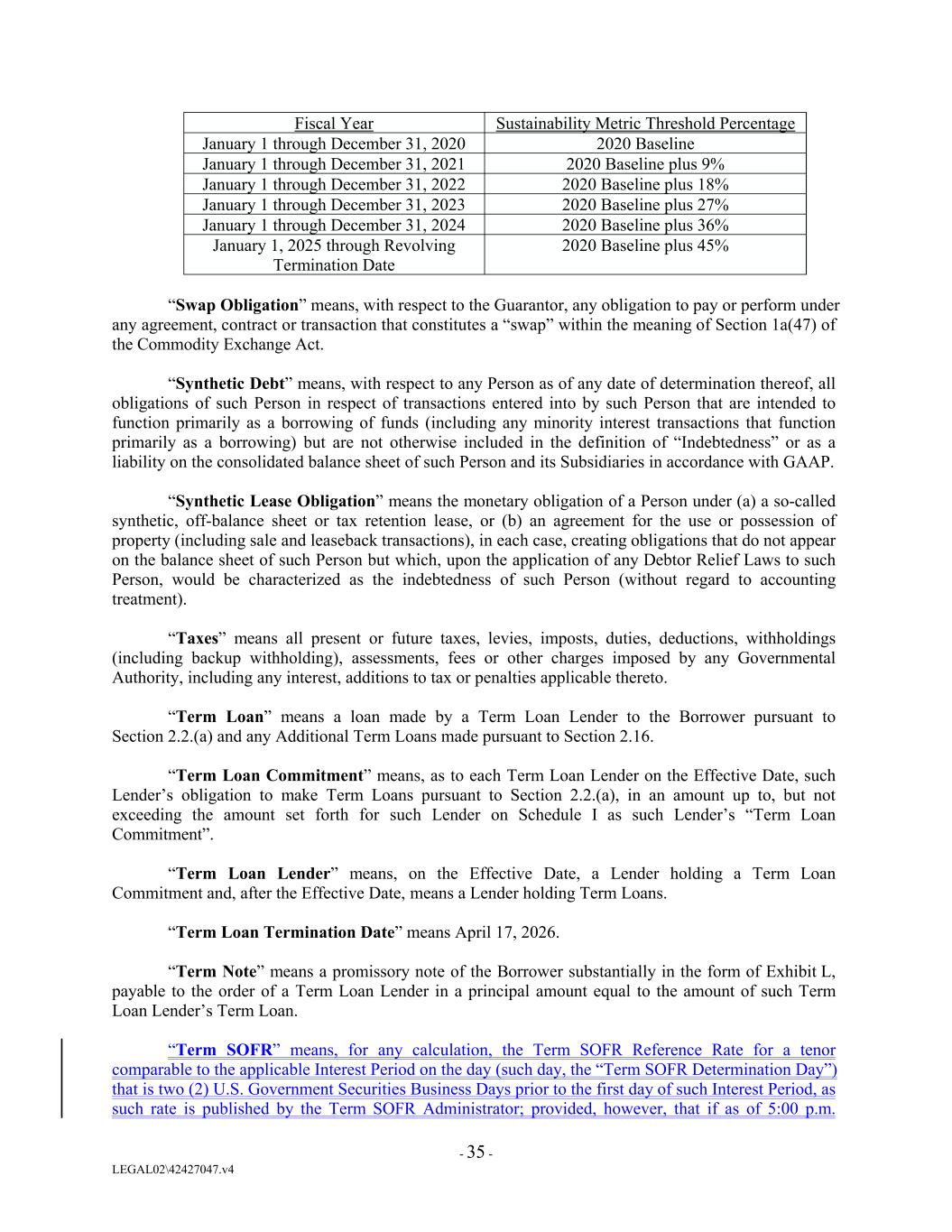 - 35 - LEGAL02\42427047.v4 January 1 through December 31, 2022 January 1 through December 31, 2020 2020 Baseline plus 18% Fiscal Year 2020 Baseline January 1 through December 31, 2023 2020 Baseline plus 27% Sustainability Metric Threshold Percentage January 1 through December 31, 2024 January 1 through December 31, 2021 2020 Baseline plus 36% 2020 Baseline plus 9% January 1, 2025 through Revolving Termination Date 2020 Baseline plus 45% “Swap Obligation” means, with respect to the Guarantor, any obligation to pay or perform under any agreement, contract or transaction that constitutes a “swap” within the meaning of Section 1a(47) of the Commodity Exchange Act. “Synthetic Debt” means, with respect to any Person as of any date of determination thereof, all obligations of such Person in respect of transactions entered into by such Person that are intended to function primarily as a borrowing of funds (including any minority interest transactions that function primarily as a borrowing) but are not otherwise included in the definition of “Indebtedness” or as a liability on the consolidated balance sheet of such Person and its Subsidiaries in accordance with GAAP. “Synthetic Lease Obligation” means the monetary obligation of a Person under (a) a so-called synthetic, off-balance sheet or tax retention lease, or (b) an agreement for the use or possession of property (including sale and leaseback transactions), in each case, creating obligations that do not appear on the balance sheet of such Person but which, upon the application of any Debtor Relief Laws to such Person, would be characterized as the indebtedness of such Person (without regard to accounting treatment). “Taxes” means all present or future taxes, levies, imposts, duties, deductions, withholdings (including backup withholding), assessments, fees or other charges imposed by any Governmental Authority, including any interest, additions to tax or penalties applicable thereto. “Term Loan” means a loan made by a Term Loan Lender to the Borrower pursuant to Section 2.2.(a) and any Additional Term Loans made pursuant to Section 2.16. “Term Loan Commitment” means, as to each Term Loan Lender on the Effective Date, such Lender’s obligation to make Term Loans pursuant to Section 2.2.(a), in an amount up to, but not exceeding the amount set forth for such Lender on Schedule I as such Lender’s “Term Loan Commitment”. “Term Loan Lender” means, on the Effective Date, a Lender holding a Term Loan Commitment and, after the Effective Date, means a Lender holding Term Loans. “Term Loan Termination Date” means April 17, 2026. “Term Note” means a promissory note of the Borrower substantially in the form of Exhibit L, payable to the order of a Term Loan Lender in a principal amount equal to the amount of such Term Loan Lender’s Term Loan. “Term SOFR” means, for any calculation, the Term SOFR Reference Rate for a tenor comparable to the applicable Interest Period on the day (such day, the “Term SOFR Determination Day”) that is two (2) U.S. Government Securities Business Days prior to the first day of such Interest Period, as such rate is published by the Term SOFR Administrator; provided, however, that if as of 5:00 p.m.