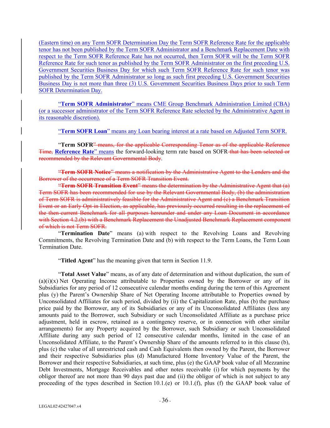 (Eastern time) on any Term SOFR Determination Day the Term SOFR Reference Rate for the applicable tenor has not been published by the Term SOFR Administrator and a Benchmark Replacement Date with respect to the Term SOFR Reference Rate has not occurred, then Term SOFR will be the Term SOFR Reference Rate for such tenor as published by the Term SOFR Administrator on the first preceding U.S. Government Securities Business Day for which such Term SOFR Reference Rate for such tenor was published by the Term SOFR Administrator so long as such first preceding U.S. Government Securities Business Day is not more than three (3) U.S. Government Securities Business Days prior to such Term SOFR Determination Day. “Term SOFR Administrator” means CME Group Benchmark Administration Limited (CBA) (or a successor administrator of the Term SOFR Reference Rate selected by the Administrative Agent in its reasonable discretion). “Term SOFR Loan” means any Loan bearing interest at a rate based on Adjusted Term SOFR. “Term SOFR” means, for the applicable Corresponding Tenor as of the applicable Reference Time, Reference Rate” means the forward-looking term rate based on SOFR that has been selected or recommended by the Relevant Governmental Body. “Term SOFR Notice” means a notification by the Administrative Agent to the Lenders and the Borrower of the occurrence of a Term SOFR Transition Event. “Term SOFR Transition Event” means the determination by the Administrative Agent that (a) Term SOFR has been recommended for use by the Relevant Governmental Body, (b) the administration of Term SOFR is administratively feasible for the Administrative Agent and (c) a Benchmark Transition Event or an Early Opt-in Election, as applicable, has previously occurred resulting in the replacement of the then-current Benchmark for all purposes hereunder and under any Loan Document in accordance with Section 4.2.(b) with a Benchmark Replacement the Unadjusted Benchmark Replacement component of which is not Term SOFR. “Termination Date” means (a) with respect to the Revolving Loans and Revolving Commitments, the Revolving Termination Date and (b) with respect to the Term Loans, the Term Loan Termination Date. “Titled Agent” has the meaning given that term in Section 11.9. “Total Asset Value” means, as of any date of determination and without duplication, the sum of (a)(i)(x) Net Operating Income attributable to Properties owned by the Borrower or any of its Subsidiaries for any period of 12 consecutive calendar months ending during the term of this Agreement plus (y) the Parent’s Ownership Share of Net Operating Income attributable to Properties owned by Unconsolidated Affiliates for such period, divided by (ii) the Capitalization Rate, plus (b) the purchase price paid by the Borrower, any of its Subsidiaries or any of its Unconsolidated Affiliates (less any amounts paid to the Borrower, such Subsidiary or such Unconsolidated Affiliate as a purchase price adjustment, held in escrow, retained as a contingency reserve, or in connection with other similar arrangements) for any Property acquired by the Borrower, such Subsidiary or such Unconsolidated Affiliate during any such period of 12 consecutive calendar months, limited in the case of an Unconsolidated Affiliate, to the Parent’s Ownership Share of the amounts referred to in this clause (b), plus (c) the value of all unrestricted cash and Cash Equivalents then owned by the Parent, the Borrower and their respective Subsidiaries plus (d) Manufactured Home Inventory Value of the Parent, the Borrower and their respective Subsidiaries, at such time, plus (e) the GAAP book value of all Mezzanine Debt Investments, Mortgage Receivables and other notes receivable (i) for which payments by the obligor thereof are not more than 90 days past due and (ii) the obligor of which is not subject to any proceeding of the types described in Section 10.1.(e) or 10.1.(f), plus (f) the GAAP book value of - 36 - LEGAL02\42427047.v4