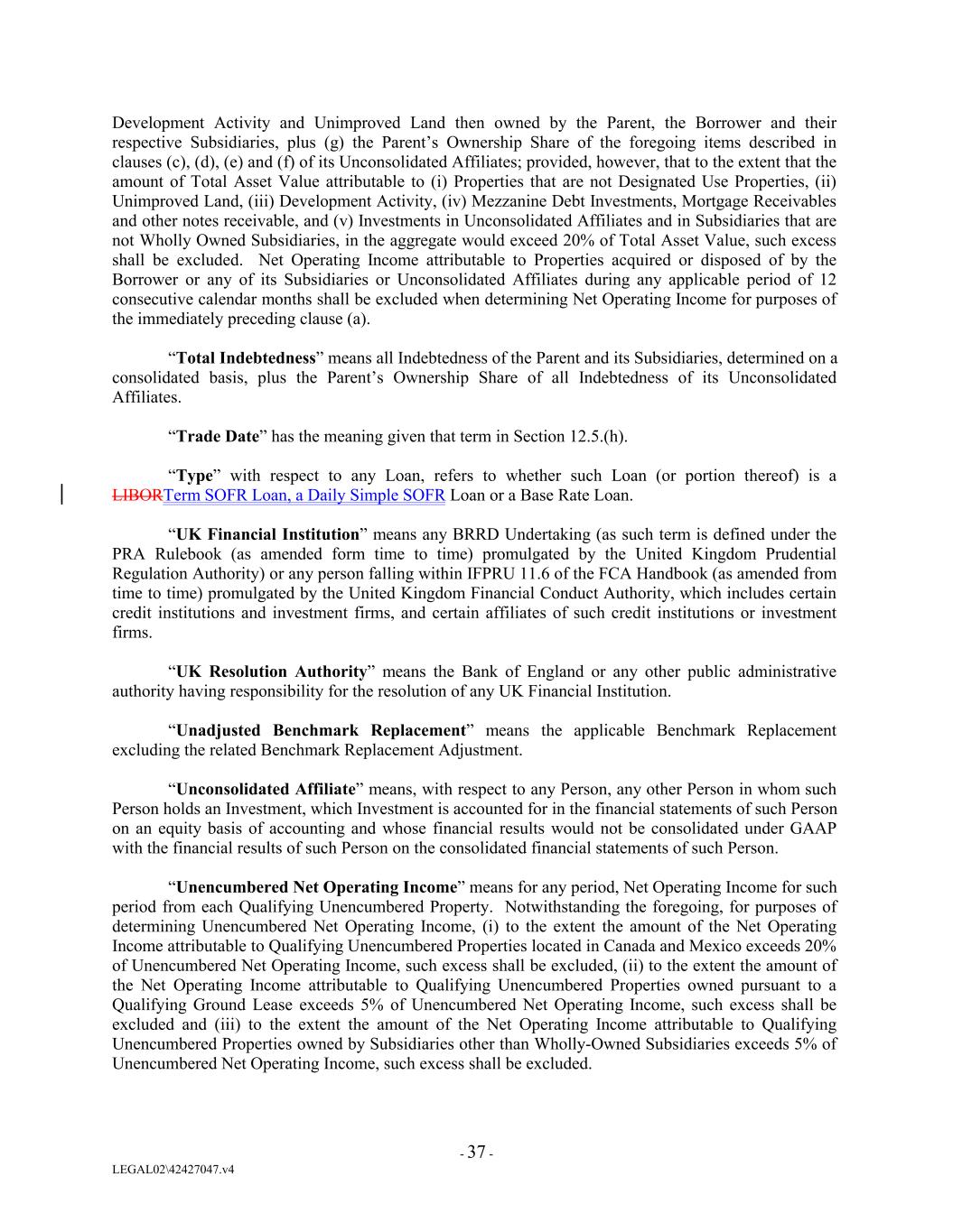 Development Activity and Unimproved Land then owned by the Parent, the Borrower and their respective Subsidiaries, plus (g) the Parent’s Ownership Share of the foregoing items described in clauses (c), (d), (e) and (f) of its Unconsolidated Affiliates; provided, however, that to the extent that the amount of Total Asset Value attributable to (i) Properties that are not Designated Use Properties, (ii) Unimproved Land, (iii) Development Activity, (iv) Mezzanine Debt Investments, Mortgage Receivables and other notes receivable, and (v) Investments in Unconsolidated Affiliates and in Subsidiaries that are not Wholly Owned Subsidiaries, in the aggregate would exceed 20% of Total Asset Value, such excess shall be excluded. Net Operating Income attributable to Properties acquired or disposed of by the Borrower or any of its Subsidiaries or Unconsolidated Affiliates during any applicable period of 12 consecutive calendar months shall be excluded when determining Net Operating Income for purposes of the immediately preceding clause (a). “Total Indebtedness” means all Indebtedness of the Parent and its Subsidiaries, determined on a consolidated basis, plus the Parent’s Ownership Share of all Indebtedness of its Unconsolidated Affiliates. “Trade Date” has the meaning given that term in Section 12.5.(h). “Type” with respect to any Loan, refers to whether such Loan (or portion thereof) is a LIBORTerm SOFR Loan, a Daily Simple SOFR Loan or a Base Rate Loan. “UK Financial Institution” means any BRRD Undertaking (as such term is defined under the PRA Rulebook (as amended form time to time) promulgated by the United Kingdom Prudential Regulation Authority) or any person falling within IFPRU 11.6 of the FCA Handbook (as amended from time to time) promulgated by the United Kingdom Financial Conduct Authority, which includes certain credit institutions and investment firms, and certain affiliates of such credit institutions or investment firms. “UK Resolution Authority” means the Bank of England or any other public administrative authority having responsibility for the resolution of any UK Financial Institution. “Unadjusted Benchmark Replacement” means the applicable Benchmark Replacement excluding the related Benchmark Replacement Adjustment. “Unconsolidated Affiliate” means, with respect to any Person, any other Person in whom such Person holds an Investment, which Investment is accounted for in the financial statements of such Person on an equity basis of accounting and whose financial results would not be consolidated under GAAP with the financial results of such Person on the consolidated financial statements of such Person. “Unencumbered Net Operating Income” means for any period, Net Operating Income for such period from each Qualifying Unencumbered Property. Notwithstanding the foregoing, for purposes of determining Unencumbered Net Operating Income, (i) to the extent the amount of the Net Operating Income attributable to Qualifying Unencumbered Properties located in Canada and Mexico exceeds 20% of Unencumbered Net Operating Income, such excess shall be excluded, (ii) to the extent the amount of the Net Operating Income attributable to Qualifying Unencumbered Properties owned pursuant to a Qualifying Ground Lease exceeds 5% of Unencumbered Net Operating Income, such excess shall be excluded and (iii) to the extent the amount of the Net Operating Income attributable to Qualifying Unencumbered Properties owned by Subsidiaries other than Wholly-Owned Subsidiaries exceeds 5% of Unencumbered Net Operating Income, such excess shall be excluded. - 37 - LEGAL02\42427047.v4