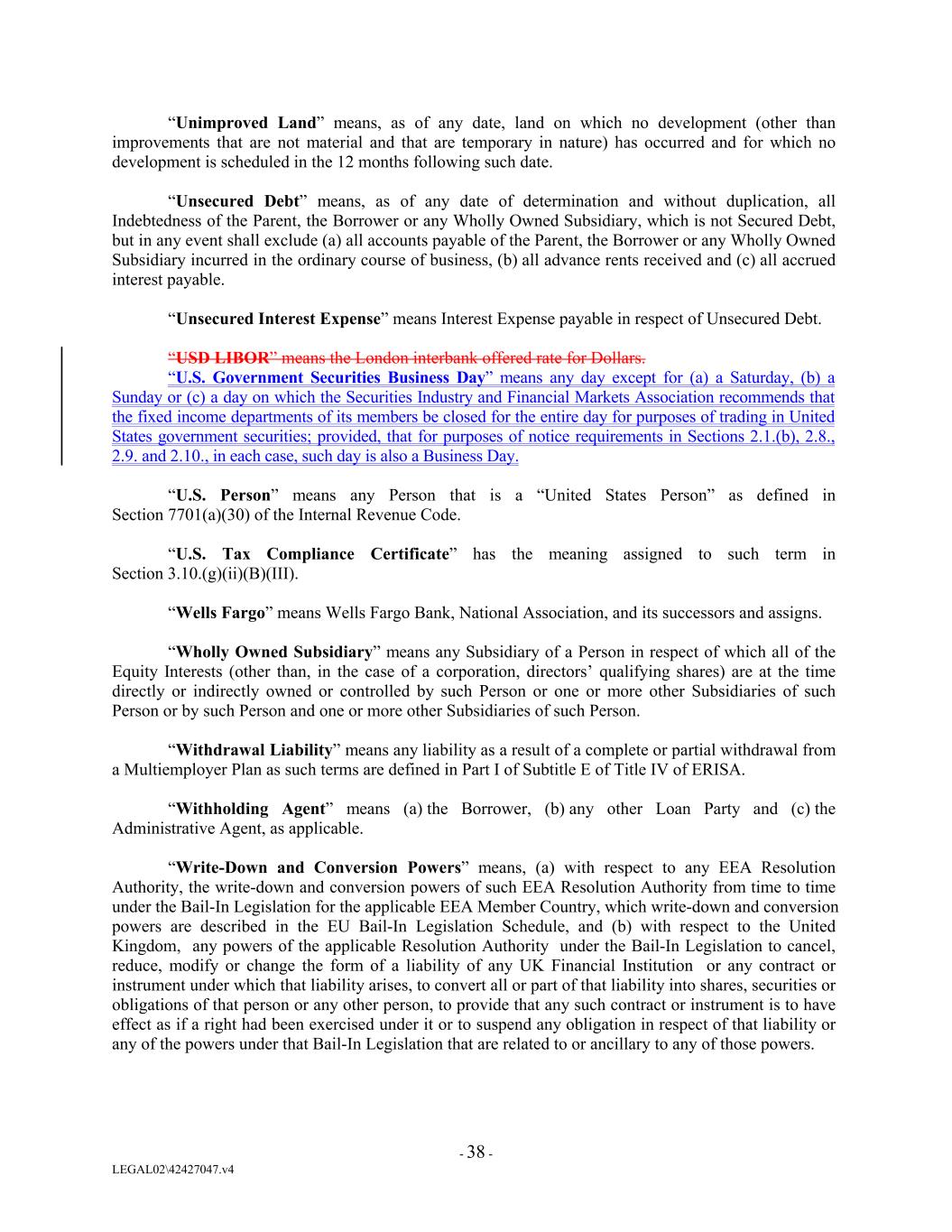 “Unimproved Land” means, as of any date, land on which no development (other than improvements that are not material and that are temporary in nature) has occurred and for which no development is scheduled in the 12 months following such date. “Unsecured Debt” means, as of any date of determination and without duplication, all Indebtedness of the Parent, the Borrower or any Wholly Owned Subsidiary, which is not Secured Debt, but in any event shall exclude (a) all accounts payable of the Parent, the Borrower or any Wholly Owned Subsidiary incurred in the ordinary course of business, (b) all advance rents received and (c) all accrued interest payable. “Unsecured Interest Expense” means Interest Expense payable in respect of Unsecured Debt. “USD LIBOR” means the London interbank offered rate for Dollars. “U.S. Government Securities Business Day” means any day except for (a) a Saturday, (b) a Sunday or (c) a day on which the Securities Industry and Financial Markets Association recommends that the fixed income departments of its members be closed for the entire day for purposes of trading in United States government securities; provided, that for purposes of notice requirements in Sections 2.1.(b), 2.8., 2.9. and 2.10., in each case, such day is also a Business Day. “U.S. Person” means any Person that is a “United States Person” as defined in Section 7701(a)(30) of the Internal Revenue Code. “U.S. Tax Compliance Certificate” has the meaning assigned to such term in Section 3.10.(g)(ii)(B)(III). “Wells Fargo” means Wells Fargo Bank, National Association, and its successors and assigns. “Wholly Owned Subsidiary” means any Subsidiary of a Person in respect of which all of the Equity Interests (other than, in the case of a corporation, directors’ qualifying shares) are at the time directly or indirectly owned or controlled by such Person or one or more other Subsidiaries of such Person or by such Person and one or more other Subsidiaries of such Person. “Withdrawal Liability” means any liability as a result of a complete or partial withdrawal from a Multiemployer Plan as such terms are defined in Part I of Subtitle E of Title IV of ERISA. “Withholding Agent” means (a) the Borrower, (b) any other Loan Party and (c) the Administrative Agent, as applicable. “Write-Down and Conversion Powers” means, (a) with respect to any EEA Resolution Authority, the write-down and conversion powers of such EEA Resolution Authority from time to time under the Bail-In Legislation for the applicable EEA Member Country, which write-down and conversion powers are described in the EU Bail-In Legislation Schedule, and (b) with respect to the United Kingdom, any powers of the applicable Resolution Authority under the Bail-In Legislation to cancel, reduce, modify or change the form of a liability of any UK Financial Institution or any contract or instrument under which that liability arises, to convert all or part of that liability into shares, securities or obligations of that person or any other person, to provide that any such contract or instrument is to have effect as if a right had been exercised under it or to suspend any obligation in respect of that liability or any of the powers under that Bail-In Legislation that are related to or ancillary to any of those powers. - 38 - LEGAL02\42427047.v4