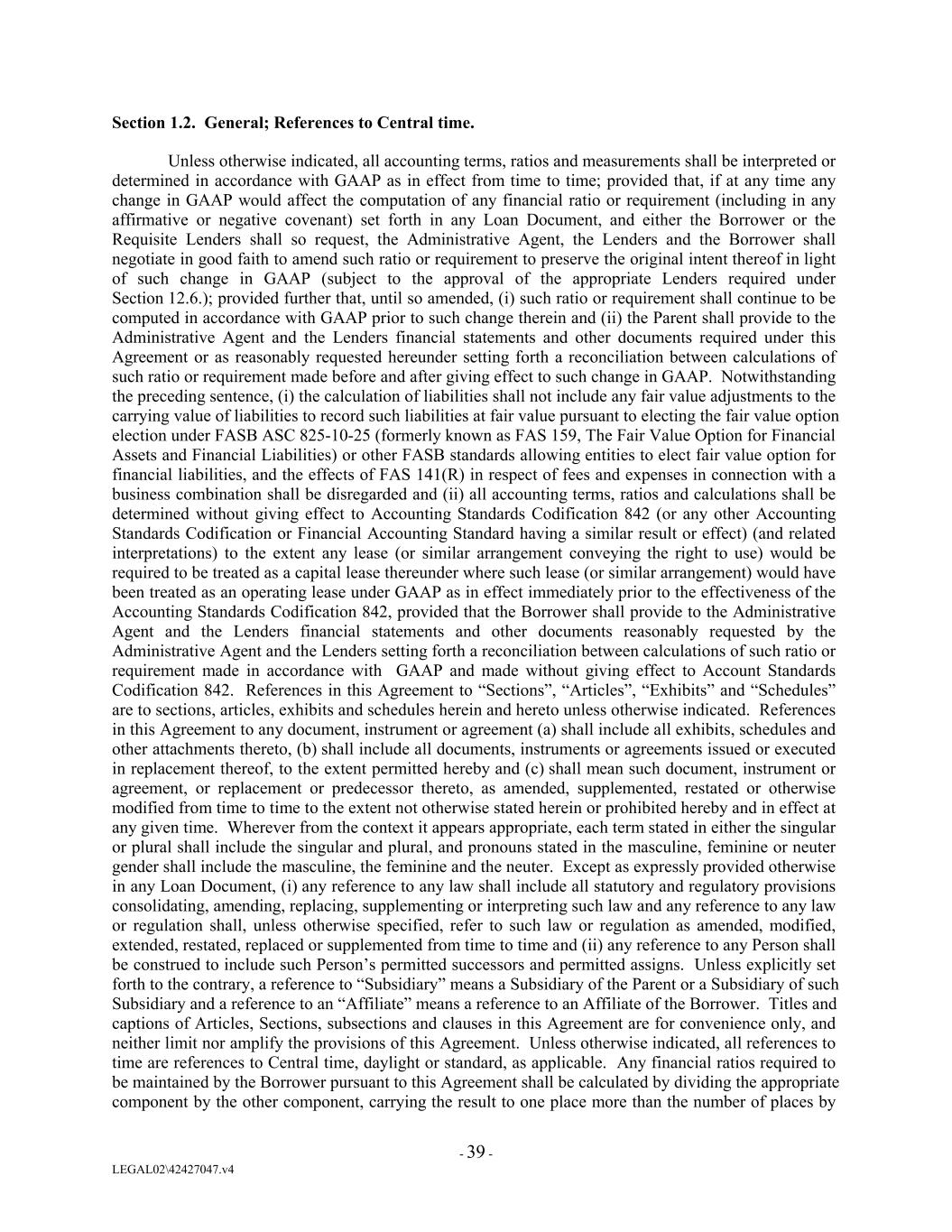 Section 1.2. General; References to Central time. Unless otherwise indicated, all accounting terms, ratios and measurements shall be interpreted or determined in accordance with GAAP as in effect from time to time; provided that, if at any time any change in GAAP would affect the computation of any financial ratio or requirement (including in any affirmative or negative covenant) set forth in any Loan Document, and either the Borrower or the Requisite Lenders shall so request, the Administrative Agent, the Lenders and the Borrower shall negotiate in good faith to amend such ratio or requirement to preserve the original intent thereof in light of such change in GAAP (subject to the approval of the appropriate Lenders required under Section 12.6.); provided further that, until so amended, (i) such ratio or requirement shall continue to be computed in accordance with GAAP prior to such change therein and (ii) the Parent shall provide to the Administrative Agent and the Lenders financial statements and other documents required under this Agreement or as reasonably requested hereunder setting forth a reconciliation between calculations of such ratio or requirement made before and after giving effect to such change in GAAP. Notwithstanding the preceding sentence, (i) the calculation of liabilities shall not include any fair value adjustments to the carrying value of liabilities to record such liabilities at fair value pursuant to electing the fair value option election under FASB ASC 825-10-25 (formerly known as FAS 159, The Fair Value Option for Financial Assets and Financial Liabilities) or other FASB standards allowing entities to elect fair value option for financial liabilities, and the effects of FAS 141(R) in respect of fees and expenses in connection with a business combination shall be disregarded and (ii) all accounting terms, ratios and calculations shall be determined without giving effect to Accounting Standards Codification 842 (or any other Accounting Standards Codification or Financial Accounting Standard having a similar result or effect) (and related interpretations) to the extent any lease (or similar arrangement conveying the right to use) would be required to be treated as a capital lease thereunder where such lease (or similar arrangement) would have been treated as an operating lease under GAAP as in effect immediately prior to the effectiveness of the Accounting Standards Codification 842, provided that the Borrower shall provide to the Administrative Agent and the Lenders financial statements and other documents reasonably requested by the Administrative Agent and the Lenders setting forth a reconciliation between calculations of such ratio or requirement made in accordance with GAAP and made without giving effect to Account Standards Codification 842. References in this Agreement to “Sections”, “Articles”, “Exhibits” and “Schedules” are to sections, articles, exhibits and schedules herein and hereto unless otherwise indicated. References in this Agreement to any document, instrument or agreement (a) shall include all exhibits, schedules and other attachments thereto, (b) shall include all documents, instruments or agreements issued or executed in replacement thereof, to the extent permitted hereby and (c) shall mean such document, instrument or agreement, or replacement or predecessor thereto, as amended, supplemented, restated or otherwise modified from time to time to the extent not otherwise stated herein or prohibited hereby and in effect at any given time. Wherever from the context it appears appropriate, each term stated in either the singular or plural shall include the singular and plural, and pronouns stated in the masculine, feminine or neuter gender shall include the masculine, the feminine and the neuter. Except as expressly provided otherwise in any Loan Document, (i) any reference to any law shall include all statutory and regulatory provisions consolidating, amending, replacing, supplementing or interpreting such law and any reference to any law or regulation shall, unless otherwise specified, refer to such law or regulation as amended, modified, extended, restated, replaced or supplemented from time to time and (ii) any reference to any Person shall be construed to include such Person’s permitted successors and permitted assigns. Unless explicitly set forth to the contrary, a reference to “Subsidiary” means a Subsidiary of the Parent or a Subsidiary of such Subsidiary and a reference to an “Affiliate” means a reference to an Affiliate of the Borrower. Titles and captions of Articles, Sections, subsections and clauses in this Agreement are for convenience only, and neither limit nor amplify the provisions of this Agreement. Unless otherwise indicated, all references to time are references to Central time, daylight or standard, as applicable. Any financial ratios required to be maintained by the Borrower pursuant to this Agreement shall be calculated by dividing the appropriate component by the other component, carrying the result to one place more than the number of places by - 39 - LEGAL02\42427047.v4