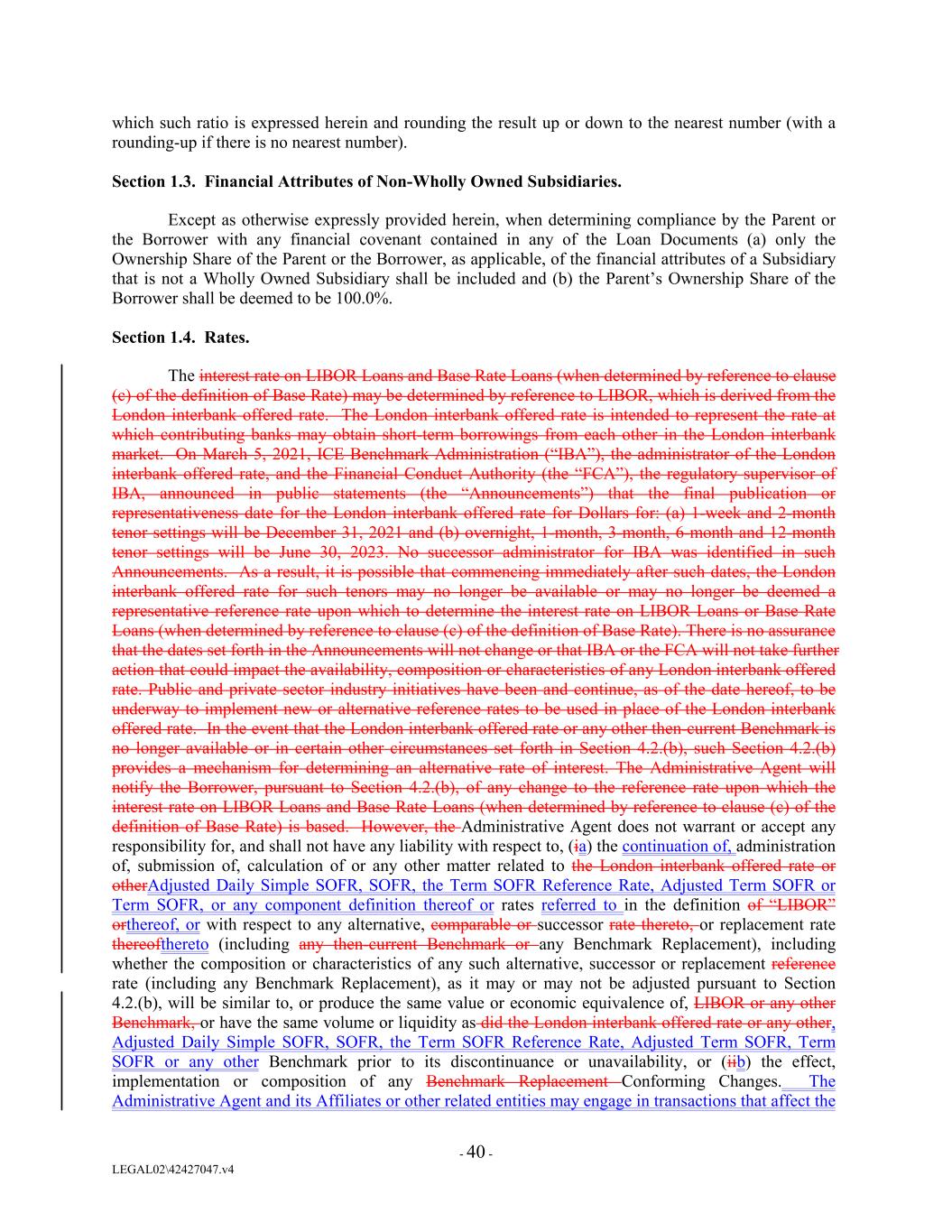 which such ratio is expressed herein and rounding the result up or down to the nearest number (with a rounding-up if there is no nearest number). Section 1.3. Financial Attributes of Non-Wholly Owned Subsidiaries. Except as otherwise expressly provided herein, when determining compliance by the Parent or the Borrower with any financial covenant contained in any of the Loan Documents (a) only the Ownership Share of the Parent or the Borrower, as applicable, of the financial attributes of a Subsidiary that is not a Wholly Owned Subsidiary shall be included and (b) the Parent’s Ownership Share of the Borrower shall be deemed to be 100.0%. Section 1.4. Rates. The interest rate on LIBOR Loans and Base Rate Loans (when determined by reference to clause (c) of the definition of Base Rate) may be determined by reference to LIBOR, which is derived from the London interbank offered rate. The London interbank offered rate is intended to represent the rate at which contributing banks may obtain short-term borrowings from each other in the London interbank market. On March 5, 2021, ICE Benchmark Administration (“IBA”), the administrator of the London interbank offered rate, and the Financial Conduct Authority (the “FCA”), the regulatory supervisor of IBA, announced in public statements (the “Announcements”) that the final publication or representativeness date for the London interbank offered rate for Dollars for: (a) 1-week and 2-month tenor settings will be December 31, 2021 and (b) overnight, 1-month, 3-month, 6-month and 12-month tenor settings will be June 30, 2023. No successor administrator for IBA was identified in such Announcements. As a result, it is possible that commencing immediately after such dates, the London interbank offered rate for such tenors may no longer be available or may no longer be deemed a representative reference rate upon which to determine the interest rate on LIBOR Loans or Base Rate Loans (when determined by reference to clause (c) of the definition of Base Rate). There is no assurance that the dates set forth in the Announcements will not change or that IBA or the FCA will not take further action that could impact the availability, composition or characteristics of any London interbank offered rate. Public and private sector industry initiatives have been and continue, as of the date hereof, to be underway to implement new or alternative reference rates to be used in place of the London interbank offered rate. In the event that the London interbank offered rate or any other then-current Benchmark is no longer available or in certain other circumstances set forth in Section 4.2.(b), such Section 4.2.(b) provides a mechanism for determining an alternative rate of interest. The Administrative Agent will notify the Borrower, pursuant to Section 4.2.(b), of any change to the reference rate upon which the interest rate on LIBOR Loans and Base Rate Loans (when determined by reference to clause (c) of the definition of Base Rate) is based. However, the Administrative Agent does not warrant or accept any responsibility for, and shall not have any liability with respect to, (ia) the continuation of, administration of, submission of, calculation of or any other matter related to the London interbank offered rate or otherAdjusted Daily Simple SOFR, SOFR, the Term SOFR Reference Rate, Adjusted Term SOFR or Term SOFR, or any component definition thereof or rates referred to in the definition of “LIBOR” orthereof, or with respect to any alternative, comparable or successor rate thereto, or replacement rate thereofthereto (including any then-current Benchmark or any Benchmark Replacement), including whether the composition or characteristics of any such alternative, successor or replacement reference rate (including any Benchmark Replacement), as it may or may not be adjusted pursuant to Section 4.2.(b), will be similar to, or produce the same value or economic equivalence of, LIBOR or any other Benchmark, or have the same volume or liquidity as did the London interbank offered rate or any other, Adjusted Daily Simple SOFR, SOFR, the Term SOFR Reference Rate, Adjusted Term SOFR, Term SOFR or any other Benchmark prior to its discontinuance or unavailability, or (iib) the effect, implementation or composition of any Benchmark Replacement Conforming Changes. The Administrative Agent and its Affiliates or other related entities may engage in transactions that affect the - 40 - LEGAL02\42427047.v4