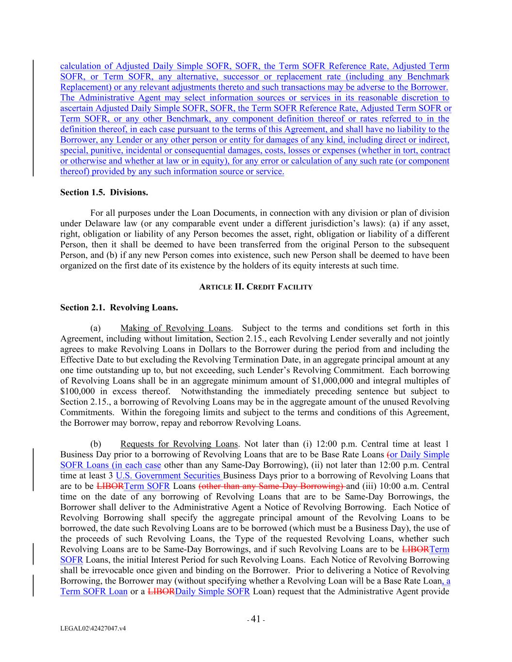 calculation of Adjusted Daily Simple SOFR, SOFR, the Term SOFR Reference Rate, Adjusted Term SOFR, or Term SOFR, any alternative, successor or replacement rate (including any Benchmark Replacement) or any relevant adjustments thereto and such transactions may be adverse to the Borrower. The Administrative Agent may select information sources or services in its reasonable discretion to ascertain Adjusted Daily Simple SOFR, SOFR, the Term SOFR Reference Rate, Adjusted Term SOFR or Term SOFR, or any other Benchmark, any component definition thereof or rates referred to in the definition thereof, in each case pursuant to the terms of this Agreement, and shall have no liability to the Borrower, any Lender or any other person or entity for damages of any kind, including direct or indirect, special, punitive, incidental or consequential damages, costs, losses or expenses (whether in tort, contract or otherwise and whether at law or in equity), for any error or calculation of any such rate (or component thereof) provided by any such information source or service. Section 1.5. Divisions. For all purposes under the Loan Documents, in connection with any division or plan of division under Delaware law (or any comparable event under a different jurisdiction’s laws): (a) if any asset, right, obligation or liability of any Person becomes the asset, right, obligation or liability of a different Person, then it shall be deemed to have been transferred from the original Person to the subsequent Person, and (b) if any new Person comes into existence, such new Person shall be deemed to have been organized on the first date of its existence by the holders of its equity interests at such time. ARTICLE II. CREDIT FACILITY Section 2.1. Revolving Loans. (a) Making of Revolving Loans. Subject to the terms and conditions set forth in this Agreement, including without limitation, Section 2.15., each Revolving Lender severally and not jointly agrees to make Revolving Loans in Dollars to the Borrower during the period from and including the Effective Date to but excluding the Revolving Termination Date, in an aggregate principal amount at any one time outstanding up to, but not exceeding, such Lender’s Revolving Commitment. Each borrowing of Revolving Loans shall be in an aggregate minimum amount of $1,000,000 and integral multiples of $100,000 in excess thereof. Notwithstanding the immediately preceding sentence but subject to Section 2.15., a borrowing of Revolving Loans may be in the aggregate amount of the unused Revolving Commitments. Within the foregoing limits and subject to the terms and conditions of this Agreement, the Borrower may borrow, repay and reborrow Revolving Loans. (b) Requests for Revolving Loans. Not later than (i) 12:00 p.m. Central time at least 1 Business Day prior to a borrowing of Revolving Loans that are to be Base Rate Loans (or Daily Simple SOFR Loans (in each case other than any Same-Day Borrowing), (ii) not later than 12:00 p.m. Central time at least 3 U.S. Government Securities Business Days prior to a borrowing of Revolving Loans that are to be LIBORTerm SOFR Loans (other than any Same-Day Borrowing) and (iii) 10:00 a.m. Central time on the date of any borrowing of Revolving Loans that are to be Same-Day Borrowings, the Borrower shall deliver to the Administrative Agent a Notice of Revolving Borrowing. Each Notice of Revolving Borrowing shall specify the aggregate principal amount of the Revolving Loans to be borrowed, the date such Revolving Loans are to be borrowed (which must be a Business Day), the use of the proceeds of such Revolving Loans, the Type of the requested Revolving Loans, whether such Revolving Loans are to be Same-Day Borrowings, and if such Revolving Loans are to be LIBORTerm SOFR Loans, the initial Interest Period for such Revolving Loans. Each Notice of Revolving Borrowing shall be irrevocable once given and binding on the Borrower. Prior to delivering a Notice of Revolving Borrowing, the Borrower may (without specifying whether a Revolving Loan will be a Base Rate Loan, a Term SOFR Loan or a LIBORDaily Simple SOFR Loan) request that the Administrative Agent provide - 41 - LEGAL02\42427047.v4