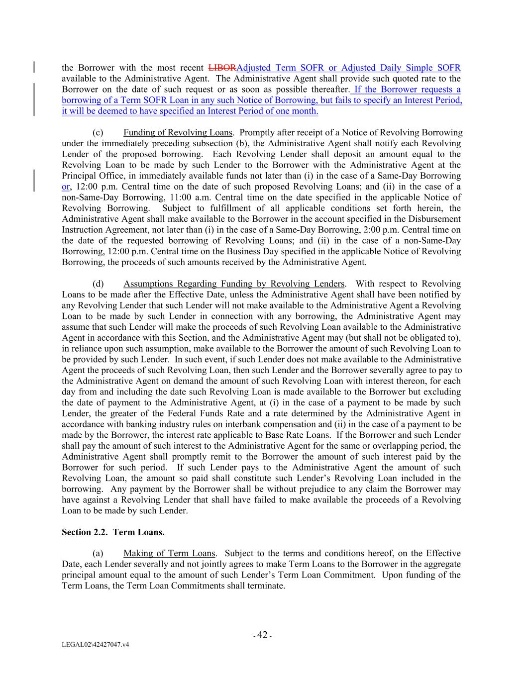 the Borrower with the most recent LIBORAdjusted Term SOFR or Adjusted Daily Simple SOFR available to the Administrative Agent. The Administrative Agent shall provide such quoted rate to the Borrower on the date of such request or as soon as possible thereafter. If the Borrower requests a borrowing of a Term SOFR Loan in any such Notice of Borrowing, but fails to specify an Interest Period, it will be deemed to have specified an Interest Period of one month. (c) Funding of Revolving Loans. Promptly after receipt of a Notice of Revolving Borrowing under the immediately preceding subsection (b), the Administrative Agent shall notify each Revolving Lender of the proposed borrowing. Each Revolving Lender shall deposit an amount equal to the Revolving Loan to be made by such Lender to the Borrower with the Administrative Agent at the Principal Office, in immediately available funds not later than (i) in the case of a Same-Day Borrowing or, 12:00 p.m. Central time on the date of such proposed Revolving Loans; and (ii) in the case of a non-Same-Day Borrowing, 11:00 a.m. Central time on the date specified in the applicable Notice of Revolving Borrowing. Subject to fulfillment of all applicable conditions set forth herein, the Administrative Agent shall make available to the Borrower in the account specified in the Disbursement Instruction Agreement, not later than (i) in the case of a Same-Day Borrowing, 2:00 p.m. Central time on the date of the requested borrowing of Revolving Loans; and (ii) in the case of a non-Same-Day Borrowing, 12:00 p.m. Central time on the Business Day specified in the applicable Notice of Revolving Borrowing, the proceeds of such amounts received by the Administrative Agent. (d) Assumptions Regarding Funding by Revolving Lenders. With respect to Revolving Loans to be made after the Effective Date, unless the Administrative Agent shall have been notified by any Revolving Lender that such Lender will not make available to the Administrative Agent a Revolving Loan to be made by such Lender in connection with any borrowing, the Administrative Agent may assume that such Lender will make the proceeds of such Revolving Loan available to the Administrative Agent in accordance with this Section, and the Administrative Agent may (but shall not be obligated to), in reliance upon such assumption, make available to the Borrower the amount of such Revolving Loan to be provided by such Lender. In such event, if such Lender does not make available to the Administrative Agent the proceeds of such Revolving Loan, then such Lender and the Borrower severally agree to pay to the Administrative Agent on demand the amount of such Revolving Loan with interest thereon, for each day from and including the date such Revolving Loan is made available to the Borrower but excluding the date of payment to the Administrative Agent, at (i) in the case of a payment to be made by such Lender, the greater of the Federal Funds Rate and a rate determined by the Administrative Agent in accordance with banking industry rules on interbank compensation and (ii) in the case of a payment to be made by the Borrower, the interest rate applicable to Base Rate Loans. If the Borrower and such Lender shall pay the amount of such interest to the Administrative Agent for the same or overlapping period, the Administrative Agent shall promptly remit to the Borrower the amount of such interest paid by the Borrower for such period. If such Lender pays to the Administrative Agent the amount of such Revolving Loan, the amount so paid shall constitute such Lender’s Revolving Loan included in the borrowing. Any payment by the Borrower shall be without prejudice to any claim the Borrower may have against a Revolving Lender that shall have failed to make available the proceeds of a Revolving Loan to be made by such Lender. Section 2.2. Term Loans. (a) Making of Term Loans. Subject to the terms and conditions hereof, on the Effective Date, each Lender severally and not jointly agrees to make Term Loans to the Borrower in the aggregate principal amount equal to the amount of such Lender’s Term Loan Commitment. Upon funding of the Term Loans, the Term Loan Commitments shall terminate. - 42 - LEGAL02\42427047.v4