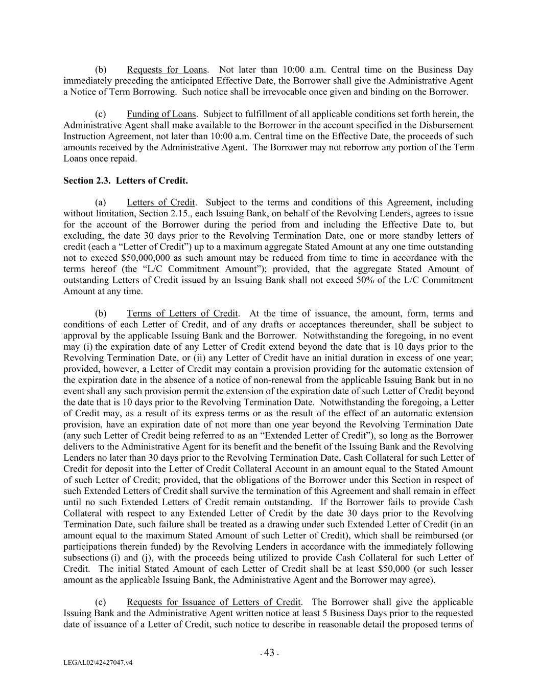 (b) Requests for Loans. Not later than 10:00 a.m. Central time on the Business Day immediately preceding the anticipated Effective Date, the Borrower shall give the Administrative Agent a Notice of Term Borrowing. Such notice shall be irrevocable once given and binding on the Borrower. (c) Funding of Loans. Subject to fulfillment of all applicable conditions set forth herein, the Administrative Agent shall make available to the Borrower in the account specified in the Disbursement Instruction Agreement, not later than 10:00 a.m. Central time on the Effective Date, the proceeds of such amounts received by the Administrative Agent. The Borrower may not reborrow any portion of the Term Loans once repaid. Section 2.3. Letters of Credit. (a) Letters of Credit. Subject to the terms and conditions of this Agreement, including without limitation, Section 2.15., each Issuing Bank, on behalf of the Revolving Lenders, agrees to issue for the account of the Borrower during the period from and including the Effective Date to, but excluding, the date 30 days prior to the Revolving Termination Date, one or more standby letters of credit (each a “Letter of Credit”) up to a maximum aggregate Stated Amount at any one time outstanding not to exceed $50,000,000 as such amount may be reduced from time to time in accordance with the terms hereof (the “L/C Commitment Amount”); provided, that the aggregate Stated Amount of outstanding Letters of Credit issued by an Issuing Bank shall not exceed 50% of the L/C Commitment Amount at any time. (b) Terms of Letters of Credit. At the time of issuance, the amount, form, terms and conditions of each Letter of Credit, and of any drafts or acceptances thereunder, shall be subject to approval by the applicable Issuing Bank and the Borrower. Notwithstanding the foregoing, in no event may (i) the expiration date of any Letter of Credit extend beyond the date that is 10 days prior to the Revolving Termination Date, or (ii) any Letter of Credit have an initial duration in excess of one year; provided, however, a Letter of Credit may contain a provision providing for the automatic extension of the expiration date in the absence of a notice of non-renewal from the applicable Issuing Bank but in no event shall any such provision permit the extension of the expiration date of such Letter of Credit beyond the date that is 10 days prior to the Revolving Termination Date. Notwithstanding the foregoing, a Letter of Credit may, as a result of its express terms or as the result of the effect of an automatic extension provision, have an expiration date of not more than one year beyond the Revolving Termination Date (any such Letter of Credit being referred to as an “Extended Letter of Credit”), so long as the Borrower delivers to the Administrative Agent for its benefit and the benefit of the Issuing Bank and the Revolving Lenders no later than 30 days prior to the Revolving Termination Date, Cash Collateral for such Letter of Credit for deposit into the Letter of Credit Collateral Account in an amount equal to the Stated Amount of such Letter of Credit; provided, that the obligations of the Borrower under this Section in respect of such Extended Letters of Credit shall survive the termination of this Agreement and shall remain in effect until no such Extended Letters of Credit remain outstanding. If the Borrower fails to provide Cash Collateral with respect to any Extended Letter of Credit by the date 30 days prior to the Revolving Termination Date, such failure shall be treated as a drawing under such Extended Letter of Credit (in an amount equal to the maximum Stated Amount of such Letter of Credit), which shall be reimbursed (or participations therein funded) by the Revolving Lenders in accordance with the immediately following subsections (i) and (j), with the proceeds being utilized to provide Cash Collateral for such Letter of Credit. The initial Stated Amount of each Letter of Credit shall be at least $50,000 (or such lesser amount as the applicable Issuing Bank, the Administrative Agent and the Borrower may agree). (c) Requests for Issuance of Letters of Credit. The Borrower shall give the applicable Issuing Bank and the Administrative Agent written notice at least 5 Business Days prior to the requested date of issuance of a Letter of Credit, such notice to describe in reasonable detail the proposed terms of - 43 - LEGAL02\42427047.v4