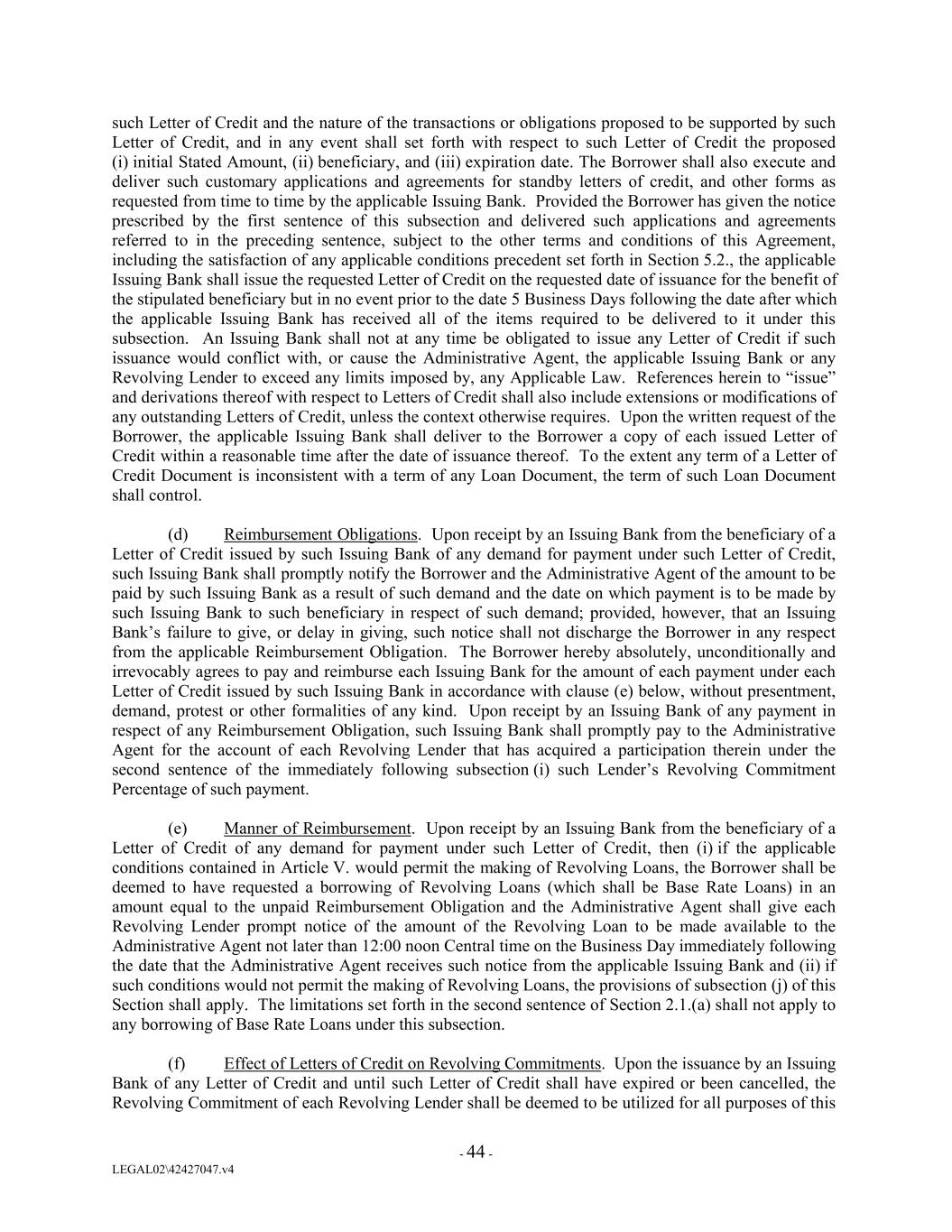 such Letter of Credit and the nature of the transactions or obligations proposed to be supported by such Letter of Credit, and in any event shall set forth with respect to such Letter of Credit the proposed (i) initial Stated Amount, (ii) beneficiary, and (iii) expiration date. The Borrower shall also execute and deliver such customary applications and agreements for standby letters of credit, and other forms as requested from time to time by the applicable Issuing Bank. Provided the Borrower has given the notice prescribed by the first sentence of this subsection and delivered such applications and agreements referred to in the preceding sentence, subject to the other terms and conditions of this Agreement, including the satisfaction of any applicable conditions precedent set forth in Section 5.2., the applicable Issuing Bank shall issue the requested Letter of Credit on the requested date of issuance for the benefit of the stipulated beneficiary but in no event prior to the date 5 Business Days following the date after which the applicable Issuing Bank has received all of the items required to be delivered to it under this subsection. An Issuing Bank shall not at any time be obligated to issue any Letter of Credit if such issuance would conflict with, or cause the Administrative Agent, the applicable Issuing Bank or any Revolving Lender to exceed any limits imposed by, any Applicable Law. References herein to “issue” and derivations thereof with respect to Letters of Credit shall also include extensions or modifications of any outstanding Letters of Credit, unless the context otherwise requires. Upon the written request of the Borrower, the applicable Issuing Bank shall deliver to the Borrower a copy of each issued Letter of Credit within a reasonable time after the date of issuance thereof. To the extent any term of a Letter of Credit Document is inconsistent with a term of any Loan Document, the term of such Loan Document shall control. (d) Reimbursement Obligations. Upon receipt by an Issuing Bank from the beneficiary of a Letter of Credit issued by such Issuing Bank of any demand for payment under such Letter of Credit, such Issuing Bank shall promptly notify the Borrower and the Administrative Agent of the amount to be paid by such Issuing Bank as a result of such demand and the date on which payment is to be made by such Issuing Bank to such beneficiary in respect of such demand; provided, however, that an Issuing Bank’s failure to give, or delay in giving, such notice shall not discharge the Borrower in any respect from the applicable Reimbursement Obligation. The Borrower hereby absolutely, unconditionally and irrevocably agrees to pay and reimburse each Issuing Bank for the amount of each payment under each Letter of Credit issued by such Issuing Bank in accordance with clause (e) below, without presentment, demand, protest or other formalities of any kind. Upon receipt by an Issuing Bank of any payment in respect of any Reimbursement Obligation, such Issuing Bank shall promptly pay to the Administrative Agent for the account of each Revolving Lender that has acquired a participation therein under the second sentence of the immediately following subsection (i) such Lender’s Revolving Commitment Percentage of such payment. (e) Manner of Reimbursement. Upon receipt by an Issuing Bank from the beneficiary of a Letter of Credit of any demand for payment under such Letter of Credit, then (i) if the applicable conditions contained in Article V. would permit the making of Revolving Loans, the Borrower shall be deemed to have requested a borrowing of Revolving Loans (which shall be Base Rate Loans) in an amount equal to the unpaid Reimbursement Obligation and the Administrative Agent shall give each Revolving Lender prompt notice of the amount of the Revolving Loan to be made available to the Administrative Agent not later than 12:00 noon Central time on the Business Day immediately following the date that the Administrative Agent receives such notice from the applicable Issuing Bank and (ii) if such conditions would not permit the making of Revolving Loans, the provisions of subsection (j) of this Section shall apply. The limitations set forth in the second sentence of Section 2.1.(a) shall not apply to any borrowing of Base Rate Loans under this subsection. (f) Effect of Letters of Credit on Revolving Commitments. Upon the issuance by an Issuing Bank of any Letter of Credit and until such Letter of Credit shall have expired or been cancelled, the Revolving Commitment of each Revolving Lender shall be deemed to be utilized for all purposes of this - 44 - LEGAL02\42427047.v4