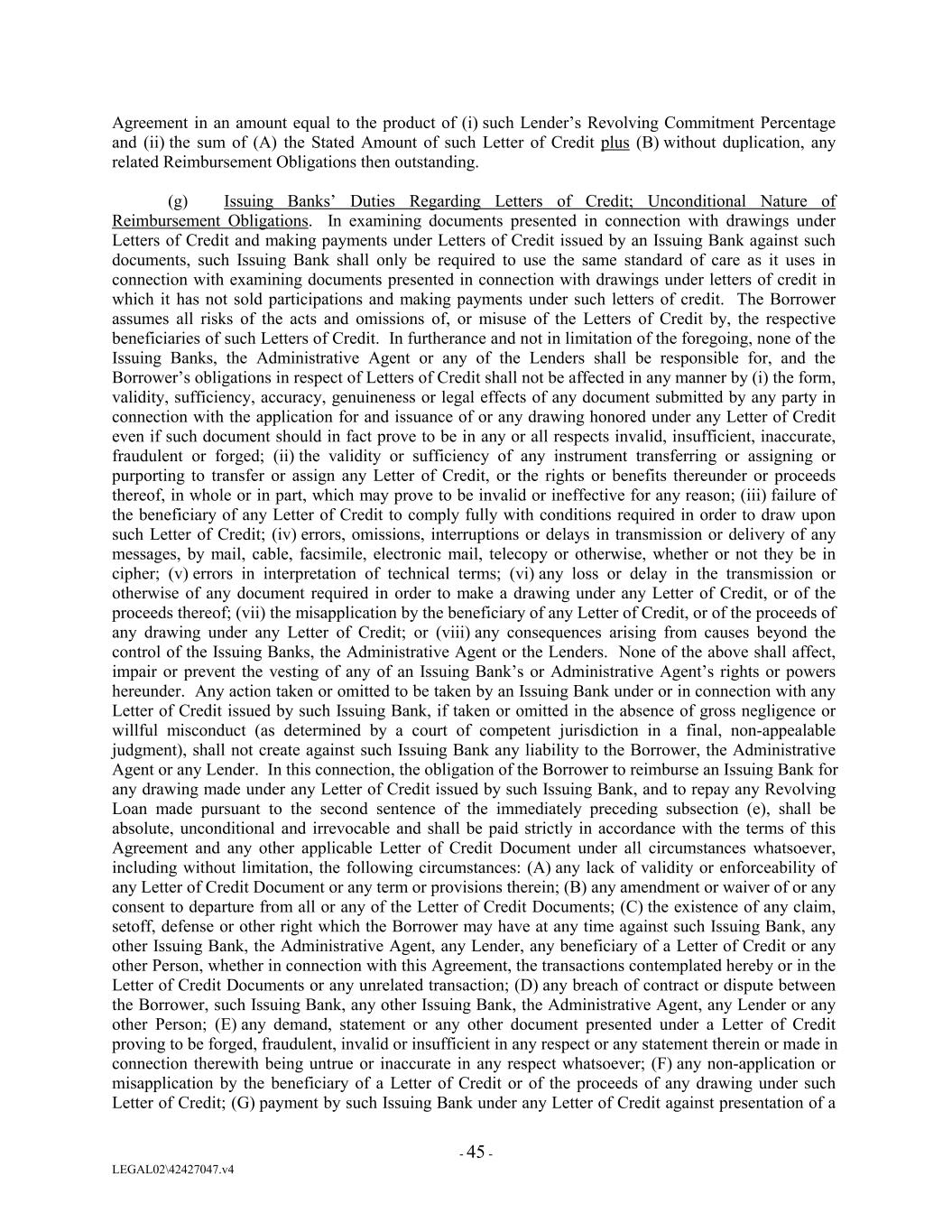Agreement in an amount equal to the product of (i) such Lender’s Revolving Commitment Percentage and (ii) the sum of (A) the Stated Amount of such Letter of Credit plus (B) without duplication, any related Reimbursement Obligations then outstanding. (g) Issuing Banks’ Duties Regarding Letters of Credit; Unconditional Nature of Reimbursement Obligations. In examining documents presented in connection with drawings under Letters of Credit and making payments under Letters of Credit issued by an Issuing Bank against such documents, such Issuing Bank shall only be required to use the same standard of care as it uses in connection with examining documents presented in connection with drawings under letters of credit in which it has not sold participations and making payments under such letters of credit. The Borrower assumes all risks of the acts and omissions of, or misuse of the Letters of Credit by, the respective beneficiaries of such Letters of Credit. In furtherance and not in limitation of the foregoing, none of the Issuing Banks, the Administrative Agent or any of the Lenders shall be responsible for, and the Borrower’s obligations in respect of Letters of Credit shall not be affected in any manner by (i) the form, validity, sufficiency, accuracy, genuineness or legal effects of any document submitted by any party in connection with the application for and issuance of or any drawing honored under any Letter of Credit even if such document should in fact prove to be in any or all respects invalid, insufficient, inaccurate, fraudulent or forged; (ii) the validity or sufficiency of any instrument transferring or assigning or purporting to transfer or assign any Letter of Credit, or the rights or benefits thereunder or proceeds thereof, in whole or in part, which may prove to be invalid or ineffective for any reason; (iii) failure of the beneficiary of any Letter of Credit to comply fully with conditions required in order to draw upon such Letter of Credit; (iv) errors, omissions, interruptions or delays in transmission or delivery of any messages, by mail, cable, facsimile, electronic mail, telecopy or otherwise, whether or not they be in cipher; (v) errors in interpretation of technical terms; (vi) any loss or delay in the transmission or otherwise of any document required in order to make a drawing under any Letter of Credit, or of the proceeds thereof; (vii) the misapplication by the beneficiary of any Letter of Credit, or of the proceeds of any drawing under any Letter of Credit; or (viii) any consequences arising from causes beyond the control of the Issuing Banks, the Administrative Agent or the Lenders. None of the above shall affect, impair or prevent the vesting of any of an Issuing Bank’s or Administrative Agent’s rights or powers hereunder. Any action taken or omitted to be taken by an Issuing Bank under or in connection with any Letter of Credit issued by such Issuing Bank, if taken or omitted in the absence of gross negligence or willful misconduct (as determined by a court of competent jurisdiction in a final, non-appealable judgment), shall not create against such Issuing Bank any liability to the Borrower, the Administrative Agent or any Lender. In this connection, the obligation of the Borrower to reimburse an Issuing Bank for any drawing made under any Letter of Credit issued by such Issuing Bank, and to repay any Revolving Loan made pursuant to the second sentence of the immediately preceding subsection (e), shall be absolute, unconditional and irrevocable and shall be paid strictly in accordance with the terms of this Agreement and any other applicable Letter of Credit Document under all circumstances whatsoever, including without limitation, the following circumstances: (A) any lack of validity or enforceability of any Letter of Credit Document or any term or provisions therein; (B) any amendment or waiver of or any consent to departure from all or any of the Letter of Credit Documents; (C) the existence of any claim, setoff, defense or other right which the Borrower may have at any time against such Issuing Bank, any other Issuing Bank, the Administrative Agent, any Lender, any beneficiary of a Letter of Credit or any other Person, whether in connection with this Agreement, the transactions contemplated hereby or in the Letter of Credit Documents or any unrelated transaction; (D) any breach of contract or dispute between the Borrower, such Issuing Bank, any other Issuing Bank, the Administrative Agent, any Lender or any other Person; (E) any demand, statement or any other document presented under a Letter of Credit proving to be forged, fraudulent, invalid or insufficient in any respect or any statement therein or made in connection therewith being untrue or inaccurate in any respect whatsoever; (F) any non-application or misapplication by the beneficiary of a Letter of Credit or of the proceeds of any drawing under such Letter of Credit; (G) payment by such Issuing Bank under any Letter of Credit against presentation of a - 45 - LEGAL02\42427047.v4