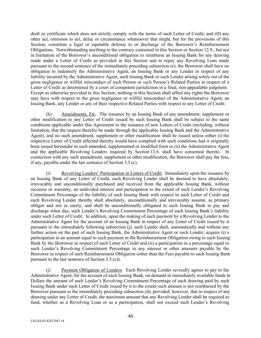 draft or certificate which does not strictly comply with the terms of such Letter of Credit; and (H) any other act, omission to act, delay or circumstance whatsoever that might, but for the provisions of this Section, constitute a legal or equitable defense to or discharge of the Borrower’s Reimbursement Obligations. Notwithstanding anything to the contrary contained in this Section or Section 12.9., but not in limitation of the Borrower’s unconditional obligation to reimburse an Issuing Bank for any drawing made under a Letter of Credit as provided in this Section and to repay any Revolving Loan made pursuant to the second sentence of the immediately preceding subsection (e), the Borrower shall have no obligation to indemnify the Administrative Agent, an Issuing Bank or any Lender in respect of any liability incurred by the Administrative Agent, such Issuing Bank or such Lender arising solely out of the gross negligence or willful misconduct of such Person or such Person’s Related Parties in respect of a Letter of Credit as determined by a court of competent jurisdiction in a final, non-appealable judgment. Except as otherwise provided in this Section, nothing in this Section shall affect any rights the Borrower may have with respect to the gross negligence or willful misconduct of the Administrative Agent, an Issuing Bank, any Lender or any of their respective Related Parties with respect to any Letter of Credit. (h) Amendments, Etc. The issuance by an Issuing Bank of any amendment, supplement or other modification to any Letter of Credit issued by such Issuing Bank shall be subject to the same conditions applicable under this Agreement to the issuance of new Letters of Credit (including, without limitation, that the request therefor be made through the applicable Issuing Bank and the Administrative Agent), and no such amendment, supplement or other modification shall be issued unless either (i) the respective Letter of Credit affected thereby would have complied with such conditions had it originally been issued hereunder in such amended, supplemented or modified form or (ii) the Administrative Agent and the applicable Revolving Lenders required by Section 12.6. shall have consented thereto. In connection with any such amendment, supplement or other modification, the Borrower shall pay the fees, if any, payable under the last sentence of Section 3.5.(c). (i) Revolving Lenders’ Participation in Letters of Credit. Immediately upon the issuance by an Issuing Bank of any Letter of Credit, each Revolving Lender shall be deemed to have absolutely, irrevocably and unconditionally purchased and received from the applicable Issuing Bank, without recourse or warranty, an undivided interest and participation to the extent of such Lender’s Revolving Commitment Percentage of the liability of such Issuing Bank with respect to such Letter of Credit and each Revolving Lender thereby shall absolutely, unconditionally and irrevocably assume, as primary obligor and not as surety, and shall be unconditionally obligated to such Issuing Bank to pay and discharge when due, such Lender’s Revolving Commitment Percentage of such Issuing Bank’s liability under such Letter of Credit. In addition, upon the making of each payment by a Revolving Lender to the Administrative Agent for the account of an Issuing Bank in respect of any Letter of Credit issued by it pursuant to the immediately following subsection (j), such Lender shall, automatically and without any further action on the part of such Issuing Bank, the Administrative Agent or such Lender, acquire (i) a participation in an amount equal to such payment in the Reimbursement Obligation owing to such Issuing Bank by the Borrower in respect of such Letter of Credit and (ii) a participation in a percentage equal to such Lender’s Revolving Commitment Percentage in any interest or other amounts payable by the Borrower in respect of such Reimbursement Obligation (other than the Fees payable to such Issuing Bank pursuant to the last sentence of Section 3.5.(c)). (j) Payment Obligation of Lenders. Each Revolving Lender severally agrees to pay to the Administrative Agent, for the account of each Issuing Bank, on demand in immediately available funds in Dollars the amount of such Lender’s Revolving Commitment Percentage of each drawing paid by such Issuing Bank under each Letter of Credit issued by it to the extent such amount is not reimbursed by the Borrower pursuant to the immediately preceding subsection (d); provided, however, that in respect of any drawing under any Letter of Credit, the maximum amount that any Revolving Lender shall be required to fund, whether as a Revolving Loan or as a participation, shall not exceed such Lender’s Revolving - 46 - LEGAL02\42427047.v4