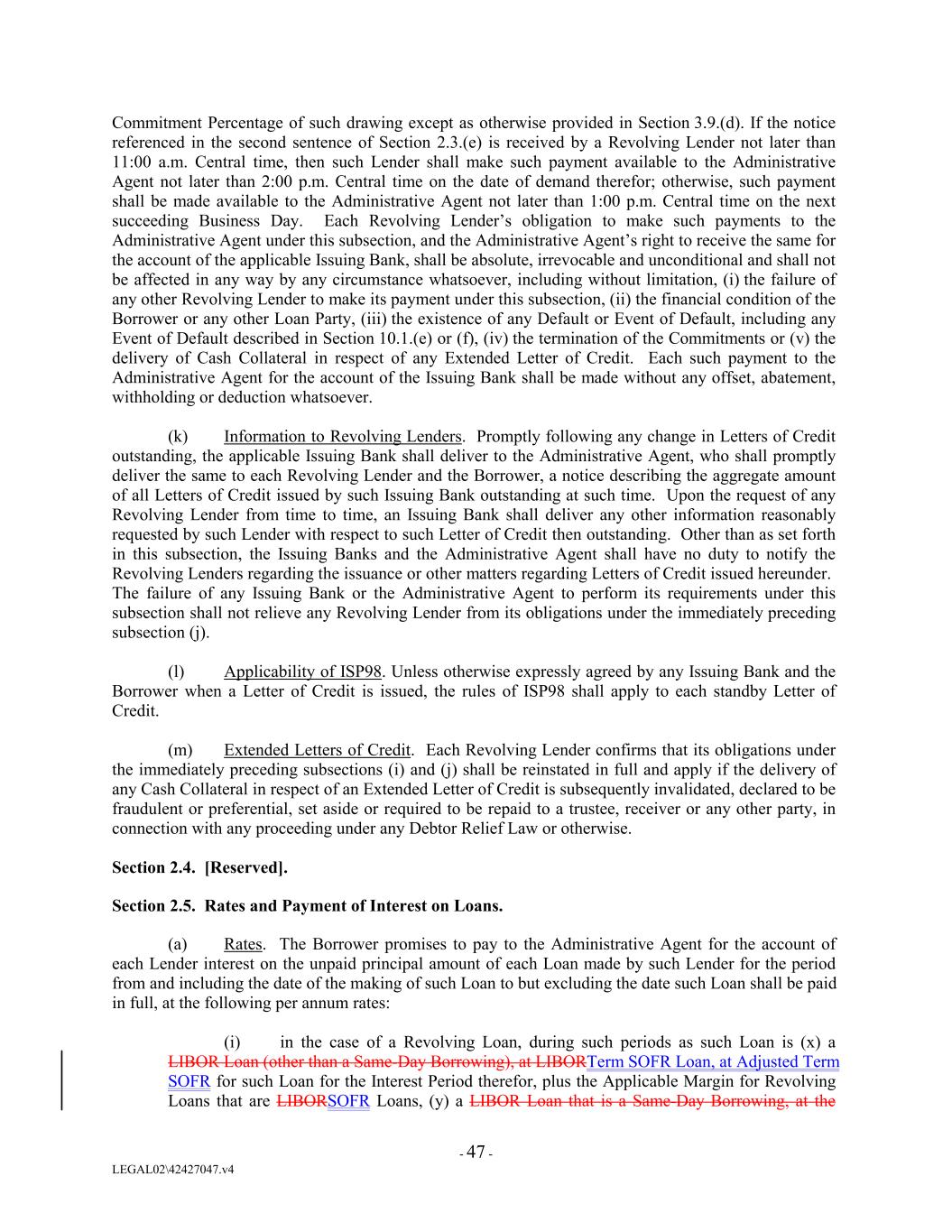 Commitment Percentage of such drawing except as otherwise provided in Section 3.9.(d). If the notice referenced in the second sentence of Section 2.3.(e) is received by a Revolving Lender not later than 11:00 a.m. Central time, then such Lender shall make such payment available to the Administrative Agent not later than 2:00 p.m. Central time on the date of demand therefor; otherwise, such payment shall be made available to the Administrative Agent not later than 1:00 p.m. Central time on the next succeeding Business Day. Each Revolving Lender’s obligation to make such payments to the Administrative Agent under this subsection, and the Administrative Agent’s right to receive the same for the account of the applicable Issuing Bank, shall be absolute, irrevocable and unconditional and shall not be affected in any way by any circumstance whatsoever, including without limitation, (i) the failure of any other Revolving Lender to make its payment under this subsection, (ii) the financial condition of the Borrower or any other Loan Party, (iii) the existence of any Default or Event of Default, including any Event of Default described in Section 10.1.(e) or (f), (iv) the termination of the Commitments or (v) the delivery of Cash Collateral in respect of any Extended Letter of Credit. Each such payment to the Administrative Agent for the account of the Issuing Bank shall be made without any offset, abatement, withholding or deduction whatsoever. (k) Information to Revolving Lenders. Promptly following any change in Letters of Credit outstanding, the applicable Issuing Bank shall deliver to the Administrative Agent, who shall promptly deliver the same to each Revolving Lender and the Borrower, a notice describing the aggregate amount of all Letters of Credit issued by such Issuing Bank outstanding at such time. Upon the request of any Revolving Lender from time to time, an Issuing Bank shall deliver any other information reasonably requested by such Lender with respect to such Letter of Credit then outstanding. Other than as set forth in this subsection, the Issuing Banks and the Administrative Agent shall have no duty to notify the Revolving Lenders regarding the issuance or other matters regarding Letters of Credit issued hereunder. The failure of any Issuing Bank or the Administrative Agent to perform its requirements under this subsection shall not relieve any Revolving Lender from its obligations under the immediately preceding subsection (j). (l) Applicability of ISP98. Unless otherwise expressly agreed by any Issuing Bank and the Borrower when a Letter of Credit is issued, the rules of ISP98 shall apply to each standby Letter of Credit. (m) Extended Letters of Credit. Each Revolving Lender confirms that its obligations under the immediately preceding subsections (i) and (j) shall be reinstated in full and apply if the delivery of any Cash Collateral in respect of an Extended Letter of Credit is subsequently invalidated, declared to be fraudulent or preferential, set aside or required to be repaid to a trustee, receiver or any other party, in connection with any proceeding under any Debtor Relief Law or otherwise. Section 2.4. [Reserved]. Section 2.5. Rates and Payment of Interest on Loans. (a) Rates. The Borrower promises to pay to the Administrative Agent for the account of each Lender interest on the unpaid principal amount of each Loan made by such Lender for the period from and including the date of the making of such Loan to but excluding the date such Loan shall be paid in full, at the following per annum rates: (i) in the case of a Revolving Loan, during such periods as such Loan is (x) a LIBOR Loan (other than a Same-Day Borrowing), at LIBORTerm SOFR Loan, at Adjusted Term SOFR for such Loan for the Interest Period therefor, plus the Applicable Margin for Revolving Loans that are LIBORSOFR Loans, (y) a LIBOR Loan that is a Same-Day Borrowing, at the - 47 - LEGAL02\42427047.v4
