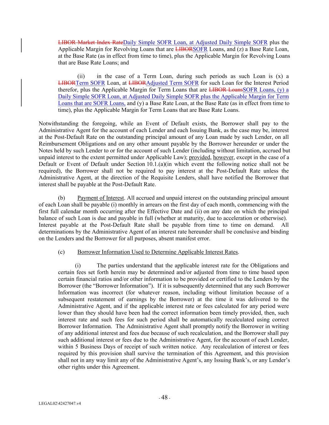 LIBOR Market Index RateDaily Simple SOFR Loan, at Adjusted Daily Simple SOFR plus the Applicable Margin for Revolving Loans that are LIBORSOFR Loans, and (z) a Base Rate Loan, at the Base Rate (as in effect from time to time), plus the Applicable Margin for Revolving Loans that are Base Rate Loans; and (ii) in the case of a Term Loan, during such periods as such Loan is (x) a LIBORTerm SOFR Loan, at LIBORAdjusted Term SOFR for such Loan for the Interest Period therefor, plus the Applicable Margin for Term Loans that are LIBOR LoansSOFR Loans, (y) a Daily Simple SOFR Loan, at Adjusted Daily Simple SOFR plus the Applicable Margin for Term Loans that are SOFR Loans, and (y) a Base Rate Loan, at the Base Rate (as in effect from time to time), plus the Applicable Margin for Term Loans that are Base Rate Loans. Notwithstanding the foregoing, while an Event of Default exists, the Borrower shall pay to the Administrative Agent for the account of each Lender and each Issuing Bank, as the case may be, interest at the Post-Default Rate on the outstanding principal amount of any Loan made by such Lender, on all Reimbursement Obligations and on any other amount payable by the Borrower hereunder or under the Notes held by such Lender to or for the account of such Lender (including without limitation, accrued but unpaid interest to the extent permitted under Applicable Law); provided, however, except in the case of a Default or Event of Default under Section 10.1.(a)(in which event the following notice shall not be required), the Borrower shall not be required to pay interest at the Post-Default Rate unless the Administrative Agent, at the direction of the Requisite Lenders, shall have notified the Borrower that interest shall be payable at the Post-Default Rate. (b) Payment of Interest. All accrued and unpaid interest on the outstanding principal amount of each Loan shall be payable (i) monthly in arrears on the first day of each month, commencing with the first full calendar month occurring after the Effective Date and (ii) on any date on which the principal balance of such Loan is due and payable in full (whether at maturity, due to acceleration or otherwise). Interest payable at the Post-Default Rate shall be payable from time to time on demand. All determinations by the Administrative Agent of an interest rate hereunder shall be conclusive and binding on the Lenders and the Borrower for all purposes, absent manifest error. (c) Borrower Information Used to Determine Applicable Interest Rates. (i) The parties understand that the applicable interest rate for the Obligations and certain fees set forth herein may be determined and/or adjusted from time to time based upon certain financial ratios and/or other information to be provided or certified to the Lenders by the Borrower (the “Borrower Information”). If it is subsequently determined that any such Borrower Information was incorrect (for whatever reason, including without limitation because of a subsequent restatement of earnings by the Borrower) at the time it was delivered to the Administrative Agent, and if the applicable interest rate or fees calculated for any period were lower than they should have been had the correct information been timely provided, then, such interest rate and such fees for such period shall be automatically recalculated using correct Borrower Information. The Administrative Agent shall promptly notify the Borrower in writing of any additional interest and fees due because of such recalculation, and the Borrower shall pay such additional interest or fees due to the Administrative Agent, for the account of each Lender, within 5 Business Days of receipt of such written notice. Any recalculation of interest or fees required by this provision shall survive the termination of this Agreement, and this provision shall not in any way limit any of the Administrative Agent’s, any Issuing Bank’s, or any Lender’s other rights under this Agreement. - 48 - LEGAL02\42427047.v4