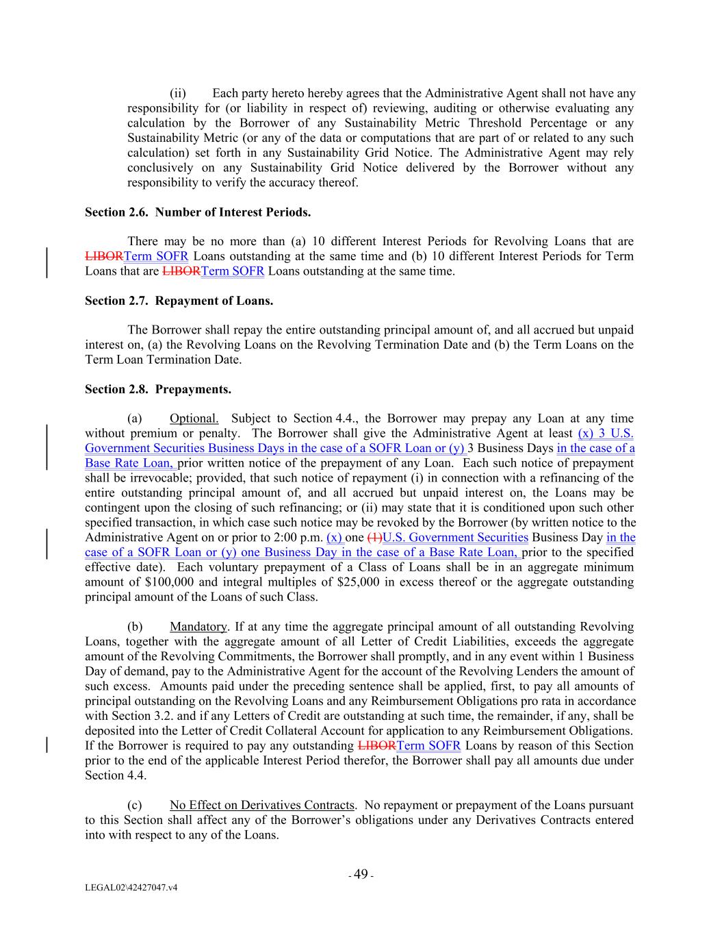 (ii) Each party hereto hereby agrees that the Administrative Agent shall not have any responsibility for (or liability in respect of) reviewing, auditing or otherwise evaluating any calculation by the Borrower of any Sustainability Metric Threshold Percentage or any Sustainability Metric (or any of the data or computations that are part of or related to any such calculation) set forth in any Sustainability Grid Notice. The Administrative Agent may rely conclusively on any Sustainability Grid Notice delivered by the Borrower without any responsibility to verify the accuracy thereof. Section 2.6. Number of Interest Periods. There may be no more than (a) 10 different Interest Periods for Revolving Loans that are LIBORTerm SOFR Loans outstanding at the same time and (b) 10 different Interest Periods for Term Loans that are LIBORTerm SOFR Loans outstanding at the same time. Section 2.7. Repayment of Loans. The Borrower shall repay the entire outstanding principal amount of, and all accrued but unpaid interest on, (a) the Revolving Loans on the Revolving Termination Date and (b) the Term Loans on the Term Loan Termination Date. Section 2.8. Prepayments. (a) Optional. Subject to Section 4.4., the Borrower may prepay any Loan at any time without premium or penalty. The Borrower shall give the Administrative Agent at least (x) 3 U.S. Government Securities Business Days in the case of a SOFR Loan or (y) 3 Business Days in the case of a Base Rate Loan, prior written notice of the prepayment of any Loan. Each such notice of prepayment shall be irrevocable; provided, that such notice of repayment (i) in connection with a refinancing of the entire outstanding principal amount of, and all accrued but unpaid interest on, the Loans may be contingent upon the closing of such refinancing; or (ii) may state that it is conditioned upon such other specified transaction, in which case such notice may be revoked by the Borrower (by written notice to the Administrative Agent on or prior to 2:00 p.m. (x) one (1)U.S. Government Securities Business Day in the case of a SOFR Loan or (y) one Business Day in the case of a Base Rate Loan, prior to the specified effective date). Each voluntary prepayment of a Class of Loans shall be in an aggregate minimum amount of $100,000 and integral multiples of $25,000 in excess thereof or the aggregate outstanding principal amount of the Loans of such Class. (b) Mandatory. If at any time the aggregate principal amount of all outstanding Revolving Loans, together with the aggregate amount of all Letter of Credit Liabilities, exceeds the aggregate amount of the Revolving Commitments, the Borrower shall promptly, and in any event within 1 Business Day of demand, pay to the Administrative Agent for the account of the Revolving Lenders the amount of such excess. Amounts paid under the preceding sentence shall be applied, first, to pay all amounts of principal outstanding on the Revolving Loans and any Reimbursement Obligations pro rata in accordance with Section 3.2. and if any Letters of Credit are outstanding at such time, the remainder, if any, shall be deposited into the Letter of Credit Collateral Account for application to any Reimbursement Obligations. If the Borrower is required to pay any outstanding LIBORTerm SOFR Loans by reason of this Section prior to the end of the applicable Interest Period therefor, the Borrower shall pay all amounts due under Section 4.4. (c) No Effect on Derivatives Contracts. No repayment or prepayment of the Loans pursuant to this Section shall affect any of the Borrower’s obligations under any Derivatives Contracts entered into with respect to any of the Loans. - 49 - LEGAL02\42427047.v4