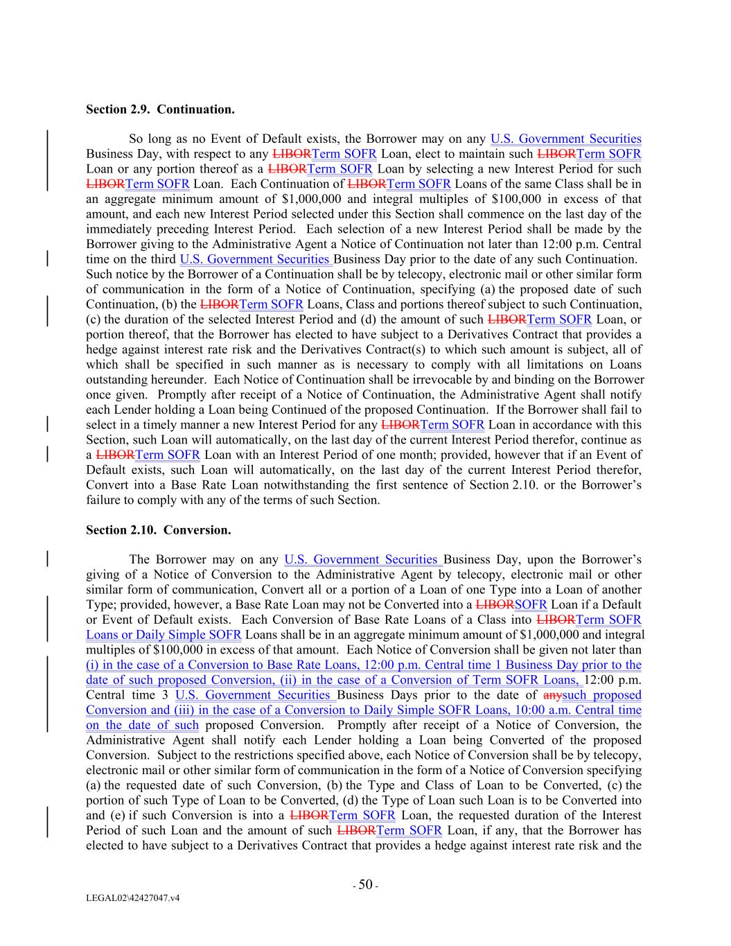 Section 2.9. Continuation. So long as no Event of Default exists, the Borrower may on any U.S. Government Securities Business Day, with respect to any LIBORTerm SOFR Loan, elect to maintain such LIBORTerm SOFR Loan or any portion thereof as a LIBORTerm SOFR Loan by selecting a new Interest Period for such LIBORTerm SOFR Loan. Each Continuation of LIBORTerm SOFR Loans of the same Class shall be in an aggregate minimum amount of $1,000,000 and integral multiples of $100,000 in excess of that amount, and each new Interest Period selected under this Section shall commence on the last day of the immediately preceding Interest Period. Each selection of a new Interest Period shall be made by the Borrower giving to the Administrative Agent a Notice of Continuation not later than 12:00 p.m. Central time on the third U.S. Government Securities Business Day prior to the date of any such Continuation. Such notice by the Borrower of a Continuation shall be by telecopy, electronic mail or other similar form of communication in the form of a Notice of Continuation, specifying (a) the proposed date of such Continuation, (b) the LIBORTerm SOFR Loans, Class and portions thereof subject to such Continuation, (c) the duration of the selected Interest Period and (d) the amount of such LIBORTerm SOFR Loan, or portion thereof, that the Borrower has elected to have subject to a Derivatives Contract that provides a hedge against interest rate risk and the Derivatives Contract(s) to which such amount is subject, all of which shall be specified in such manner as is necessary to comply with all limitations on Loans outstanding hereunder. Each Notice of Continuation shall be irrevocable by and binding on the Borrower once given. Promptly after receipt of a Notice of Continuation, the Administrative Agent shall notify each Lender holding a Loan being Continued of the proposed Continuation. If the Borrower shall fail to select in a timely manner a new Interest Period for any LIBORTerm SOFR Loan in accordance with this Section, such Loan will automatically, on the last day of the current Interest Period therefor, continue as a LIBORTerm SOFR Loan with an Interest Period of one month; provided, however that if an Event of Default exists, such Loan will automatically, on the last day of the current Interest Period therefor, Convert into a Base Rate Loan notwithstanding the first sentence of Section 2.10. or the Borrower’s failure to comply with any of the terms of such Section. Section 2.10. Conversion. The Borrower may on any U.S. Government Securities Business Day, upon the Borrower’s giving of a Notice of Conversion to the Administrative Agent by telecopy, electronic mail or other similar form of communication, Convert all or a portion of a Loan of one Type into a Loan of another Type; provided, however, a Base Rate Loan may not be Converted into a LIBORSOFR Loan if a Default or Event of Default exists. Each Conversion of Base Rate Loans of a Class into LIBORTerm SOFR Loans or Daily Simple SOFR Loans shall be in an aggregate minimum amount of $1,000,000 and integral multiples of $100,000 in excess of that amount. Each Notice of Conversion shall be given not later than (i) in the case of a Conversion to Base Rate Loans, 12:00 p.m. Central time 1 Business Day prior to the date of such proposed Conversion, (ii) in the case of a Conversion of Term SOFR Loans, 12:00 p.m. Central time 3 U.S. Government Securities Business Days prior to the date of anysuch proposed Conversion and (iii) in the case of a Conversion to Daily Simple SOFR Loans, 10:00 a.m. Central time on the date of such proposed Conversion. Promptly after receipt of a Notice of Conversion, the Administrative Agent shall notify each Lender holding a Loan being Converted of the proposed Conversion. Subject to the restrictions specified above, each Notice of Conversion shall be by telecopy, electronic mail or other similar form of communication in the form of a Notice of Conversion specifying (a) the requested date of such Conversion, (b) the Type and Class of Loan to be Converted, (c) the portion of such Type of Loan to be Converted, (d) the Type of Loan such Loan is to be Converted into and (e) if such Conversion is into a LIBORTerm SOFR Loan, the requested duration of the Interest Period of such Loan and the amount of such LIBORTerm SOFR Loan, if any, that the Borrower has elected to have subject to a Derivatives Contract that provides a hedge against interest rate risk and the - 50 - LEGAL02\42427047.v4