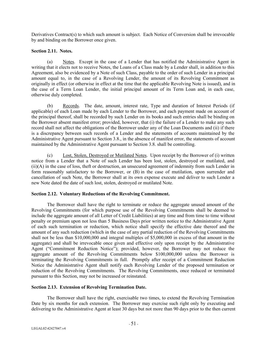 Derivatives Contract(s) to which such amount is subject. Each Notice of Conversion shall be irrevocable by and binding on the Borrower once given. Section 2.11. Notes. (a) Notes. Except in the case of a Lender that has notified the Administrative Agent in writing that it elects not to receive Notes, the Loans of a Class made by a Lender shall, in addition to this Agreement, also be evidenced by a Note of such Class, payable to the order of such Lender in a principal amount equal to, in the case of a Revolving Lender, the amount of its Revolving Commitment as originally in effect (or otherwise in effect at the time that the applicable Revolving Note is issued), and in the case of a Term Loan Lender, the initial principal amount of its Term Loan and, in each case, otherwise duly completed. (b) Records. The date, amount, interest rate, Type and duration of Interest Periods (if applicable) of each Loan made by each Lender to the Borrower, and each payment made on account of the principal thereof, shall be recorded by such Lender on its books and such entries shall be binding on the Borrower absent manifest error; provided, however, that (i) the failure of a Lender to make any such record shall not affect the obligations of the Borrower under any of the Loan Documents and (ii) if there is a discrepancy between such records of a Lender and the statements of accounts maintained by the Administrative Agent pursuant to Section 3.8., in the absence of manifest error, the statements of account maintained by the Administrative Agent pursuant to Section 3.8. shall be controlling. (c) Lost, Stolen, Destroyed or Mutilated Notes. Upon receipt by the Borrower of (i) written notice from a Lender that a Note of such Lender has been lost, stolen, destroyed or mutilated, and (ii)(A) in the case of loss, theft or destruction, an unsecured agreement of indemnity from such Lender in form reasonably satisfactory to the Borrower, or (B) in the case of mutilation, upon surrender and cancellation of such Note, the Borrower shall at its own expense execute and deliver to such Lender a new Note dated the date of such lost, stolen, destroyed or mutilated Note. Section 2.12. Voluntary Reductions of the Revolving Commitment. The Borrower shall have the right to terminate or reduce the aggregate unused amount of the Revolving Commitments (for which purpose use of the Revolving Commitments shall be deemed to include the aggregate amount of all Letter of Credit Liabilities) at any time and from time to time without penalty or premium upon not less than 5 Business Days prior written notice to the Administrative Agent of each such termination or reduction, which notice shall specify the effective date thereof and the amount of any such reduction (which in the case of any partial reduction of the Revolving Commitments shall not be less than $10,000,000 and integral multiples of $5,000,000 in excess of that amount in the aggregate) and shall be irrevocable once given and effective only upon receipt by the Administrative Agent (“Commitment Reduction Notice”); provided, however, the Borrower may not reduce the aggregate amount of the Revolving Commitments below $100,000,000 unless the Borrower is terminating the Revolving Commitments in full. Promptly after receipt of a Commitment Reduction Notice the Administrative Agent shall notify each Revolving Lender of the proposed termination or reduction of the Revolving Commitments. The Revolving Commitments, once reduced or terminated pursuant to this Section, may not be increased or reinstated. Section 2.13. Extension of Revolving Termination Date. The Borrower shall have the right, exercisable two times, to extend the Revolving Termination Date by six months for each extension. The Borrower may exercise such right only by executing and delivering to the Administrative Agent at least 30 days but not more than 90 days prior to the then current - 51 - LEGAL02\42427047.v4