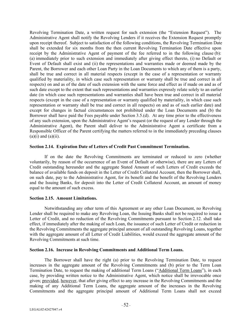 Revolving Termination Date, a written request for such extension (the “Extension Request”). The Administrative Agent shall notify the Revolving Lenders if it receives the Extension Request promptly upon receipt thereof. Subject to satisfaction of the following conditions, the Revolving Termination Date shall be extended for six months from the then current Revolving Termination Date effective upon receipt by the Administrative Agent of payment of the fee referred to in the following clause (b): (a) immediately prior to such extension and immediately after giving effect thereto, (i) no Default or Event of Default shall exist and (ii) the representations and warranties made or deemed made by the Parent, the Borrower and each other Loan Party in the Loan Documents to which any of them is a party, shall be true and correct in all material respects (except in the case of a representation or warranty qualified by materiality, in which case such representation or warranty shall be true and correct in all respects) on and as of the date of such extension with the same force and effect as if made on and as of such date except to the extent that such representations and warranties expressly relate solely to an earlier date (in which case such representations and warranties shall have been true and correct in all material respects (except in the case of a representation or warranty qualified by materiality, in which case such representation or warranty shall be true and correct in all respects) on and as of such earlier date) and except for changes in factual circumstances not prohibited under the Loan Documents and (b) the Borrower shall have paid the Fees payable under Section 3.5.(d). At any time prior to the effectiveness of any such extension, upon the Administrative Agent’s request (or the request of any Lender through the Administrative Agent), the Parent shall deliver to the Administrative Agent a certificate from a Responsible Officer of the Parent certifying the matters referred to in the immediately preceding clauses (a)(i) and (a)(ii). Section 2.14. Expiration Date of Letters of Credit Past Commitment Termination. If on the date the Revolving Commitments are terminated or reduced to zero (whether voluntarily, by reason of the occurrence of an Event of Default or otherwise), there are any Letters of Credit outstanding hereunder and the aggregate Stated Amount of such Letters of Credit exceeds the balance of available funds on deposit in the Letter of Credit Collateral Account, then the Borrower shall, on such date, pay to the Administrative Agent, for its benefit and the benefit of the Revolving Lenders and the Issuing Banks, for deposit into the Letter of Credit Collateral Account, an amount of money equal to the amount of such excess. Section 2.15. Amount Limitations. Notwithstanding any other term of this Agreement or any other Loan Document, no Revolving Lender shall be required to make any Revolving Loan, the Issuing Banks shall not be required to issue a Letter of Credit, and no reduction of the Revolving Commitments pursuant to Section 2.12. shall take effect, if immediately after the making of such Loan, the issuance of such Letter of Credit or reduction in the Revolving Commitments the aggregate principal amount of all outstanding Revolving Loans, together with the aggregate amount of all Letter of Credit Liabilities, would exceed the aggregate amount of the Revolving Commitments at such time. Section 2.16. Increase in Revolving Commitments and Additional Term Loans. The Borrower shall have the right (a) prior to the Revolving Termination Date, to request increases in the aggregate amount of the Revolving Commitments and (b) prior to the Term Loan Termination Date, to request the making of additional Term Loans (“Additional Term Loans”), in each case, by providing written notice to the Administrative Agent, which notice shall be irrevocable once given; provided, however, that after giving effect to any increase in the Revolving Commitments and the making of any Additional Term Loans, the aggregate amount of the increases in the Revolving Commitments and the aggregate principal amount of Additional Term Loans shall not exceed - 52 - LEGAL02\42427047.v4