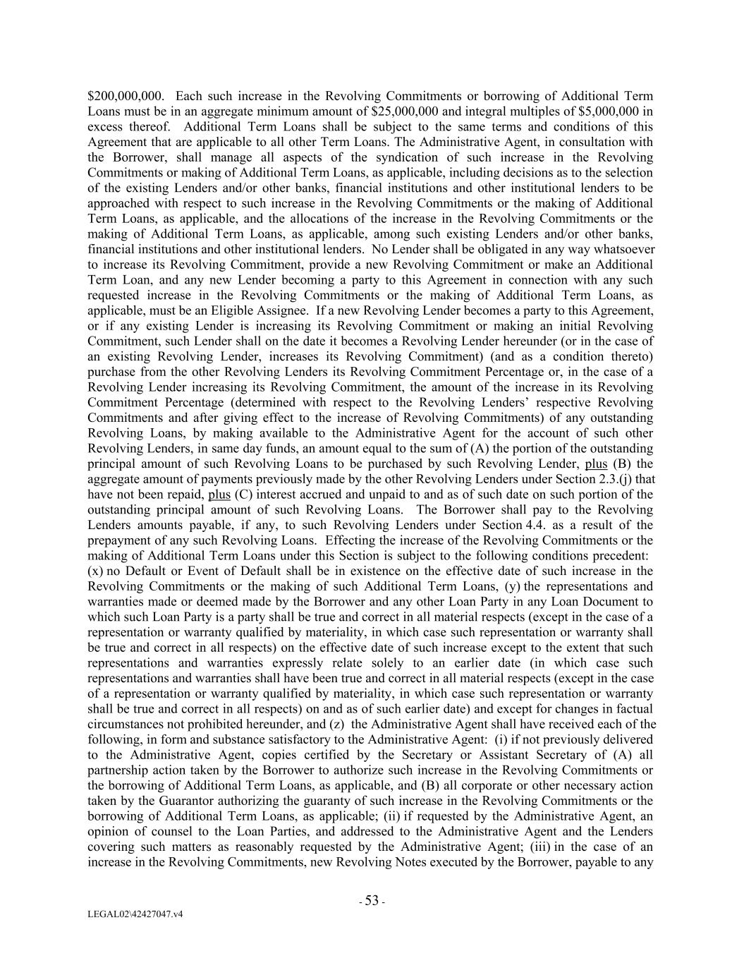 $200,000,000. Each such increase in the Revolving Commitments or borrowing of Additional Term Loans must be in an aggregate minimum amount of $25,000,000 and integral multiples of $5,000,000 in excess thereof. Additional Term Loans shall be subject to the same terms and conditions of this Agreement that are applicable to all other Term Loans. The Administrative Agent, in consultation with the Borrower, shall manage all aspects of the syndication of such increase in the Revolving Commitments or making of Additional Term Loans, as applicable, including decisions as to the selection of the existing Lenders and/or other banks, financial institutions and other institutional lenders to be approached with respect to such increase in the Revolving Commitments or the making of Additional Term Loans, as applicable, and the allocations of the increase in the Revolving Commitments or the making of Additional Term Loans, as applicable, among such existing Lenders and/or other banks, financial institutions and other institutional lenders. No Lender shall be obligated in any way whatsoever to increase its Revolving Commitment, provide a new Revolving Commitment or make an Additional Term Loan, and any new Lender becoming a party to this Agreement in connection with any such requested increase in the Revolving Commitments or the making of Additional Term Loans, as applicable, must be an Eligible Assignee. If a new Revolving Lender becomes a party to this Agreement, or if any existing Lender is increasing its Revolving Commitment or making an initial Revolving Commitment, such Lender shall on the date it becomes a Revolving Lender hereunder (or in the case of an existing Revolving Lender, increases its Revolving Commitment) (and as a condition thereto) purchase from the other Revolving Lenders its Revolving Commitment Percentage or, in the case of a Revolving Lender increasing its Revolving Commitment, the amount of the increase in its Revolving Commitment Percentage (determined with respect to the Revolving Lenders’ respective Revolving Commitments and after giving effect to the increase of Revolving Commitments) of any outstanding Revolving Loans, by making available to the Administrative Agent for the account of such other Revolving Lenders, in same day funds, an amount equal to the sum of (A) the portion of the outstanding principal amount of such Revolving Loans to be purchased by such Revolving Lender, plus (B) the aggregate amount of payments previously made by the other Revolving Lenders under Section 2.3.(j) that have not been repaid, plus (C) interest accrued and unpaid to and as of such date on such portion of the outstanding principal amount of such Revolving Loans. The Borrower shall pay to the Revolving Lenders amounts payable, if any, to such Revolving Lenders under Section 4.4. as a result of the prepayment of any such Revolving Loans. Effecting the increase of the Revolving Commitments or the making of Additional Term Loans under this Section is subject to the following conditions precedent: (x) no Default or Event of Default shall be in existence on the effective date of such increase in the Revolving Commitments or the making of such Additional Term Loans, (y) the representations and warranties made or deemed made by the Borrower and any other Loan Party in any Loan Document to which such Loan Party is a party shall be true and correct in all material respects (except in the case of a representation or warranty qualified by materiality, in which case such representation or warranty shall be true and correct in all respects) on the effective date of such increase except to the extent that such representations and warranties expressly relate solely to an earlier date (in which case such representations and warranties shall have been true and correct in all material respects (except in the case of a representation or warranty qualified by materiality, in which case such representation or warranty shall be true and correct in all respects) on and as of such earlier date) and except for changes in factual circumstances not prohibited hereunder, and (z) the Administrative Agent shall have received each of the following, in form and substance satisfactory to the Administrative Agent: (i) if not previously delivered to the Administrative Agent, copies certified by the Secretary or Assistant Secretary of (A) all partnership action taken by the Borrower to authorize such increase in the Revolving Commitments or the borrowing of Additional Term Loans, as applicable, and (B) all corporate or other necessary action taken by the Guarantor authorizing the guaranty of such increase in the Revolving Commitments or the borrowing of Additional Term Loans, as applicable; (ii) if requested by the Administrative Agent, an opinion of counsel to the Loan Parties, and addressed to the Administrative Agent and the Lenders covering such matters as reasonably requested by the Administrative Agent; (iii) in the case of an increase in the Revolving Commitments, new Revolving Notes executed by the Borrower, payable to any - 53 - LEGAL02\42427047.v4
