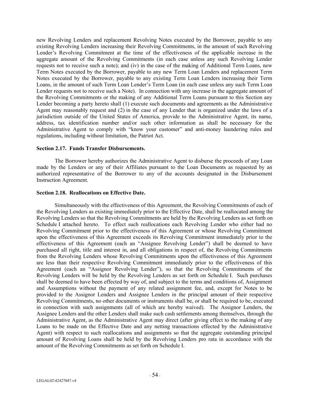 new Revolving Lenders and replacement Revolving Notes executed by the Borrower, payable to any existing Revolving Lenders increasing their Revolving Commitments, in the amount of such Revolving Lender’s Revolving Commitment at the time of the effectiveness of the applicable increase in the aggregate amount of the Revolving Commitments (in each case unless any such Revolving Lender requests not to receive such a note); and (iv) in the case of the making of Additional Term Loans, new Term Notes executed by the Borrower, payable to any new Term Loan Lenders and replacement Term Notes executed by the Borrower, payable to any existing Term Loan Lenders increasing their Term Loans, in the amount of such Term Loan Lender’s Term Loan (in each case unless any such Term Loan Lender requests not to receive such a Note). In connection with any increase in the aggregate amount of the Revolving Commitments or the making of any Additional Term Loans pursuant to this Section any Lender becoming a party hereto shall (1) execute such documents and agreements as the Administrative Agent may reasonably request and (2) in the case of any Lender that is organized under the laws of a jurisdiction outside of the United States of America, provide to the Administrative Agent, its name, address, tax identification number and/or such other information as shall be necessary for the Administrative Agent to comply with “know your customer” and anti-money laundering rules and regulations, including without limitation, the Patriot Act. Section 2.17. Funds Transfer Disbursements. The Borrower hereby authorizes the Administrative Agent to disburse the proceeds of any Loan made by the Lenders or any of their Affiliates pursuant to the Loan Documents as requested by an authorized representative of the Borrower to any of the accounts designated in the Disbursement Instruction Agreement. Section 2.18. Reallocations on Effective Date. Simultaneously with the effectiveness of this Agreement, the Revolving Commitments of each of the Revolving Lenders as existing immediately prior to the Effective Date, shall be reallocated among the Revolving Lenders so that the Revolving Commitments are held by the Revolving Lenders as set forth on Schedule I attached hereto. To effect such reallocations each Revolving Lender who either had no Revolving Commitment prior to the effectiveness of this Agreement or whose Revolving Commitment upon the effectiveness of this Agreement exceeds its Revolving Commitment immediately prior to the effectiveness of this Agreement (each an “Assignee Revolving Lender”) shall be deemed to have purchased all right, title and interest in, and all obligations in respect of, the Revolving Commitments from the Revolving Lenders whose Revolving Commitments upon the effectiveness of this Agreement are less than their respective Revolving Commitment immediately prior to the effectiveness of this Agreement (each an “Assignor Revolving Lender”), so that the Revolving Commitments of the Revolving Lenders will be held by the Revolving Lenders as set forth on Schedule I. Such purchases shall be deemed to have been effected by way of, and subject to the terms and conditions of, Assignment and Assumptions without the payment of any related assignment fee, and, except for Notes to be provided to the Assignor Lenders and Assignee Lenders in the principal amount of their respective Revolving Commitments, no other documents or instruments shall be, or shall be required to be, executed in connection with such assignments (all of which are hereby waived). The Assignor Lenders, the Assignee Lenders and the other Lenders shall make such cash settlements among themselves, through the Administrative Agent, as the Administrative Agent may direct (after giving effect to the making of any Loans to be made on the Effective Date and any netting transactions effected by the Administrative Agent) with respect to such reallocations and assignments so that the aggregate outstanding principal amount of Revolving Loans shall be held by the Revolving Lenders pro rata in accordance with the amount of the Revolving Commitments as set forth on Schedule I. - 54 - LEGAL02\42427047.v4