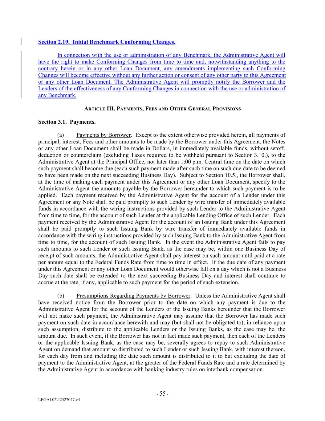 Section 2.19. Initial Benchmark Conforming Changes. In connection with the use or administration of any Benchmark, the Administrative Agent will have the right to make Conforming Changes from time to time and, notwithstanding anything to the contrary herein or in any other Loan Document, any amendments implementing such Conforming Changes will become effective without any further action or consent of any other party to this Agreement or any other Loan Document. The Administrative Agent will promptly notify the Borrower and the Lenders of the effectiveness of any Conforming Changes in connection with the use or administration of any Benchmark. ARTICLE III. PAYMENTS, FEES AND OTHER GENERAL PROVISIONS Section 3.1. Payments. (a) Payments by Borrower. Except to the extent otherwise provided herein, all payments of principal, interest, Fees and other amounts to be made by the Borrower under this Agreement, the Notes or any other Loan Document shall be made in Dollars, in immediately available funds, without setoff, deduction or counterclaim (excluding Taxes required to be withheld pursuant to Section 3.10.), to the Administrative Agent at the Principal Office, not later than 1:00 p.m. Central time on the date on which such payment shall become due (each such payment made after such time on such due date to be deemed to have been made on the next succeeding Business Day). Subject to Section 10.5., the Borrower shall, at the time of making each payment under this Agreement or any other Loan Document, specify to the Administrative Agent the amounts payable by the Borrower hereunder to which such payment is to be applied. Each payment received by the Administrative Agent for the account of a Lender under this Agreement or any Note shall be paid promptly to such Lender by wire transfer of immediately available funds in accordance with the wiring instructions provided by such Lender to the Administrative Agent from time to time, for the account of such Lender at the applicable Lending Office of such Lender. Each payment received by the Administrative Agent for the account of an Issuing Bank under this Agreement shall be paid promptly to such Issuing Bank by wire transfer of immediately available funds in accordance with the wiring instructions provided by such Issuing Bank to the Administrative Agent from time to time, for the account of such Issuing Bank. In the event the Administrative Agent fails to pay such amounts to such Lender or such Issuing Bank, as the case may be, within one Business Day of receipt of such amounts, the Administrative Agent shall pay interest on such amount until paid at a rate per annum equal to the Federal Funds Rate from time to time in effect. If the due date of any payment under this Agreement or any other Loan Document would otherwise fall on a day which is not a Business Day such date shall be extended to the next succeeding Business Day and interest shall continue to accrue at the rate, if any, applicable to such payment for the period of such extension. (b) Presumptions Regarding Payments by Borrower. Unless the Administrative Agent shall have received notice from the Borrower prior to the date on which any payment is due to the Administrative Agent for the account of the Lenders or the Issuing Banks hereunder that the Borrower will not make such payment, the Administrative Agent may assume that the Borrower has made such payment on such date in accordance herewith and may (but shall not be obligated to), in reliance upon such assumption, distribute to the applicable Lenders or the Issuing Banks, as the case may be, the amount due. In such event, if the Borrower has not in fact made such payment, then each of the Lenders or the applicable Issuing Bank, as the case may be, severally agrees to repay to such Administrative Agent on demand that amount so distributed to such Lender or such Issuing Bank, with interest thereon, for each day from and including the date such amount is distributed to it to but excluding the date of payment to the Administrative Agent, at the greater of the Federal Funds Rate and a rate determined by the Administrative Agent in accordance with banking industry rules on interbank compensation. - 55 - LEGAL02\42427047.v4